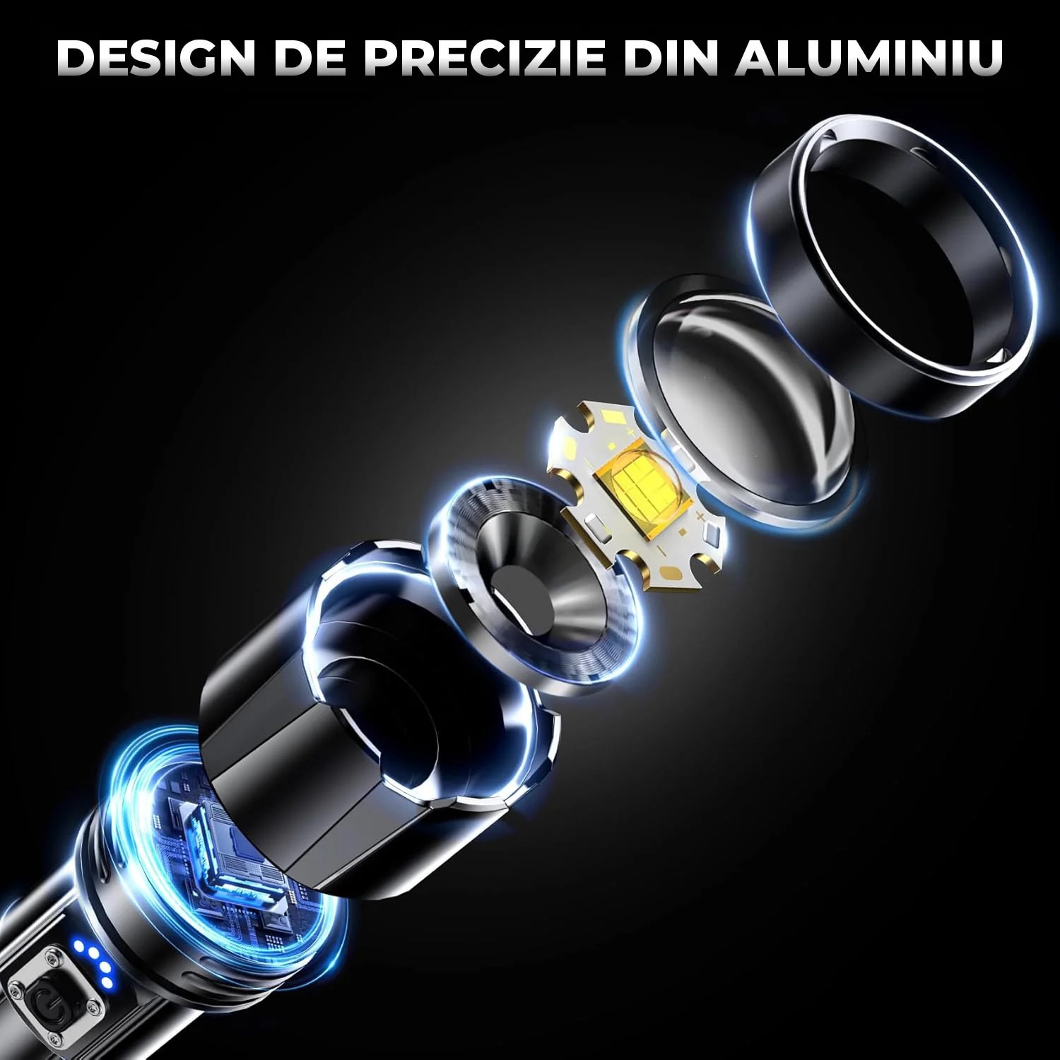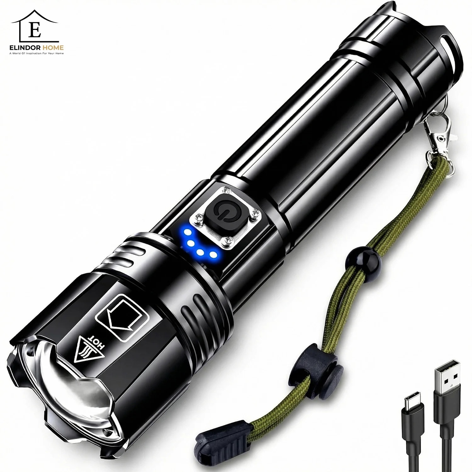 Lanterna LED Neagra Elindor® Profesionala, Luminoasa, 2000 Lumeni, cu Acumulator, Baterie Reincarcabila (USB C), Design Tactic Militar, Fascicul cu Zoom, Rezistent la Apa, Multifunctionala, pentru Pescuit, Plimbari, Drumetii