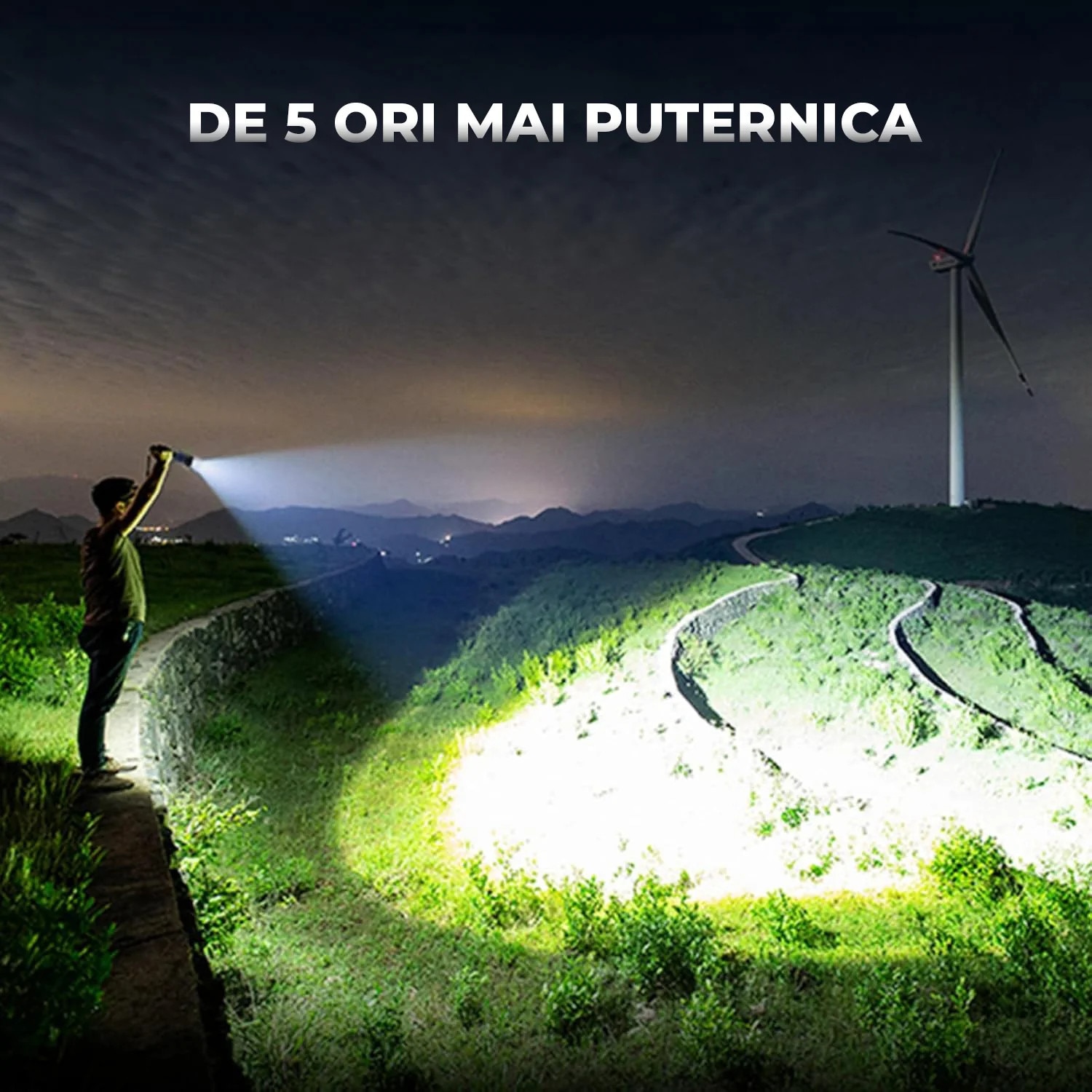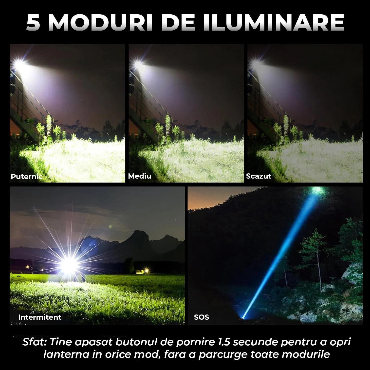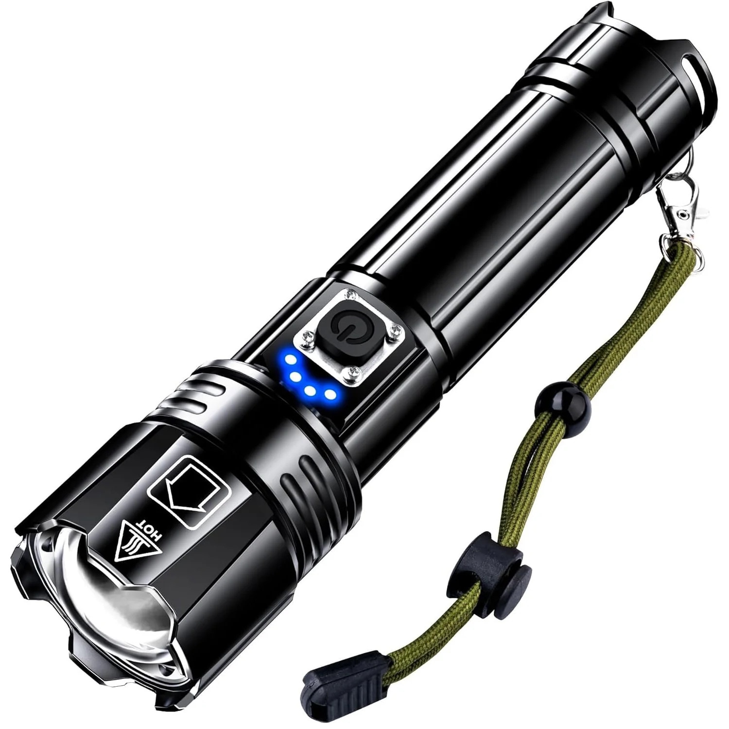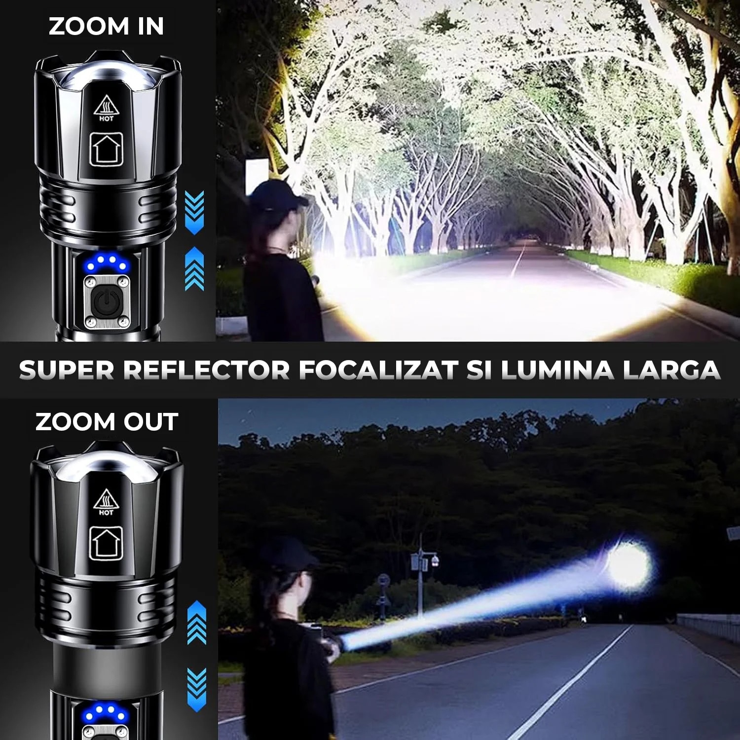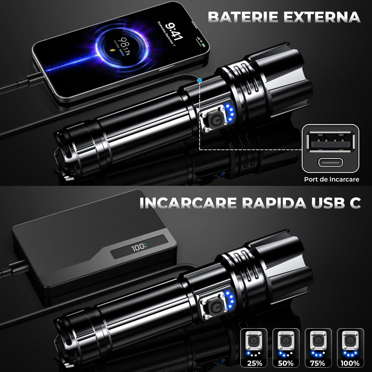 Lanterna LED Reincarcabila Elindor®, Lanterna Puternica cu Zoom si 5 Moduri de Iluminare, Baterie 5000 mAh si Incarcare USB-C, Lanterna IP67 pentru Camping, Drumetii si Situatii de Urgenta, ABS, 18 × 4.17 × 4.17 cm, 2000 lumeni, Negru