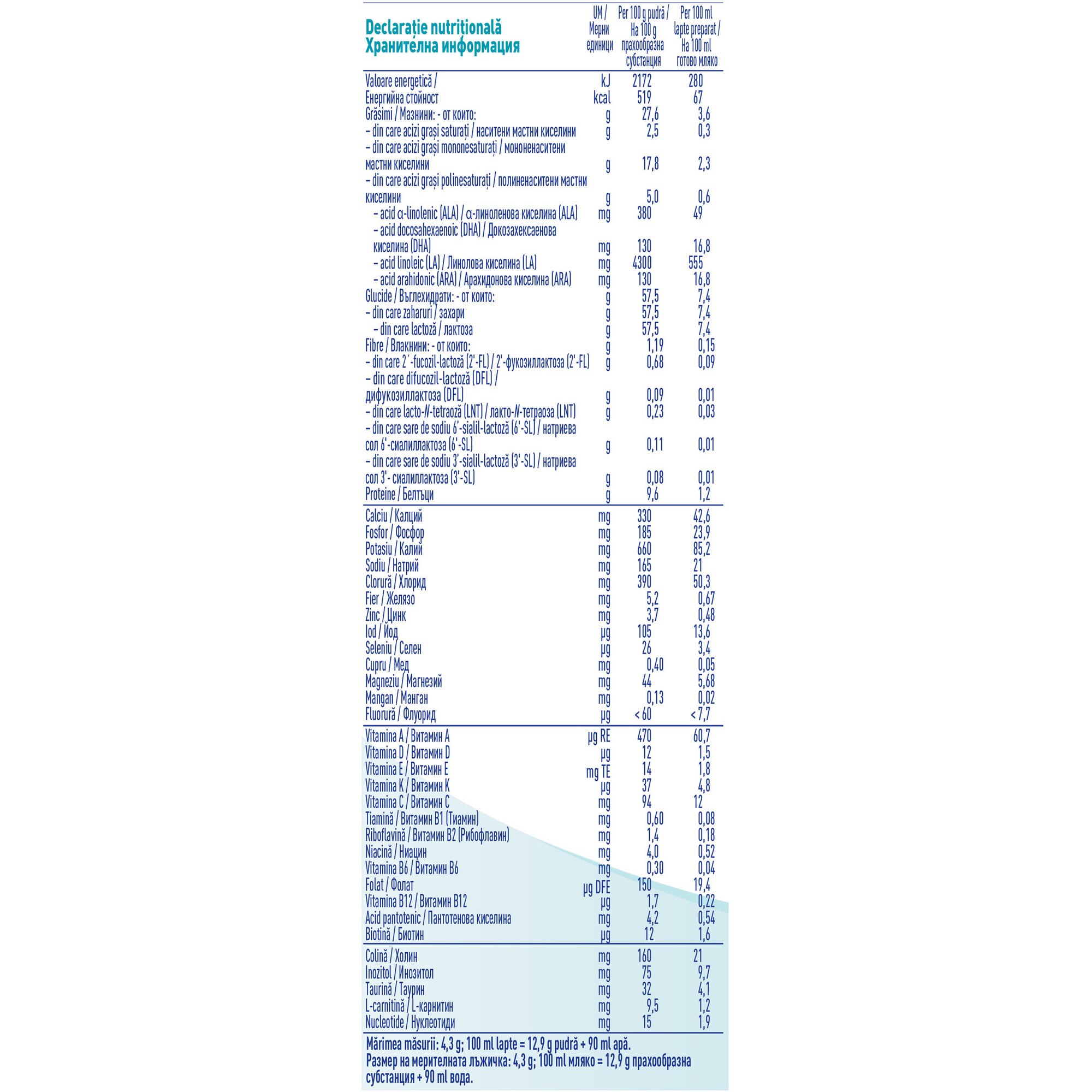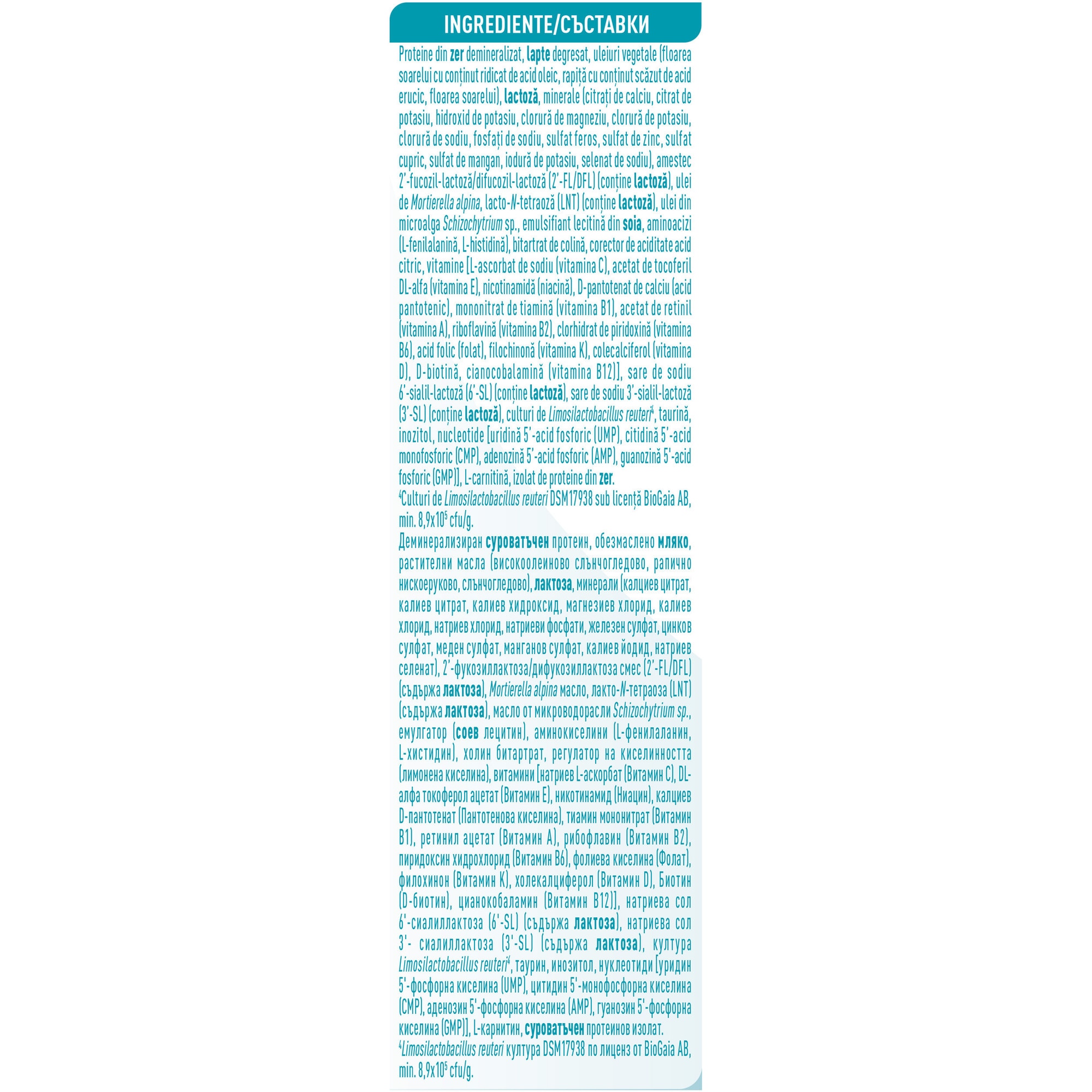 ** Nota: foloseste numai masura din interiorul cutiei. Nu folosi mai multa sau mai putina pudra decat este indicat, deoarece aceasta poate duce fie la deshidratare, fie la o nutritie insuficienta a bebelusului tau. Nu modifica proportiile fara avizul medicului." INGREDIENTE:Proteine din zer demineralizat, lapte degresat, uleiuri vegetale (floarea soarelui cu continut ridicat de acid oleic, rapita cu continut scazut de acid erucic, floarea soarelui), lactoza, minerale (citrati de calciu, citrat de potasiu, hidroxid de potasiu, clorura de magneziu, clorura de potasiu, clorura de sodiu, fosfati de sodiu, sulfat feros, sulfat de zinc, sulfat cupric, sulfat de mangan, iodura de potasiu, selenat de sodiu), amestec 2′-fucozil-lactoza/difucozil-lactoza (2'-FL/DFL) (contine lactoza), ulei de Mortierella alpina, lacto-N-tetraoza (LNT) (contine lactoza), ulei din microalga Schizochytrium sp., emulsifiant lecitina din soia, aminoacizi (L-fenilalanina, L-histidina), bitartrat de colina, corector de aciditate acid citric, vitamine [L-ascorbat de sodiu (vitamina C), acetat de tocoferil DL-alfa (vitamina E), nicotinamida (niacina), D-pantotenat de calciu (acid pantotenic), mononitrat de tiamina (vitamina B1), acetat de retinil (vitamina A), riboflavina (vitamina B2), clorhidrat de piridoxina (vitamina B6), acid folic (folat), filochinona (vitamina K), colecalciferol (vitamina D), D-biotina, cianocobalamina (vitamina B12)], sare de sodiu 6'-sialil-lactoza (6'-SL) (contine lactoza), sare de sodiu 3'-sialil-lactoza (3'-SL) (contine lactoza), culturi de Limosilactobacillus reuteri*, taurina, inozitol, nucleotide [uridina 5’-acid fosforic (UMP), citidina 5’-acid monofosforic (CMP), adenozina 5’-acid fosforic (AMP), guanozina 5'-acid fosforic (GMP)], L-carnitina, izolat de proteine din zer.*Culturi de Limosilactobacillus reuteri DSM17938 sub licenta BioGaia AB, min. 8,9x10^5 cfu/g. Contine zer, lapte, lactoza, soia "Ambalat in atmosfera protectoare.