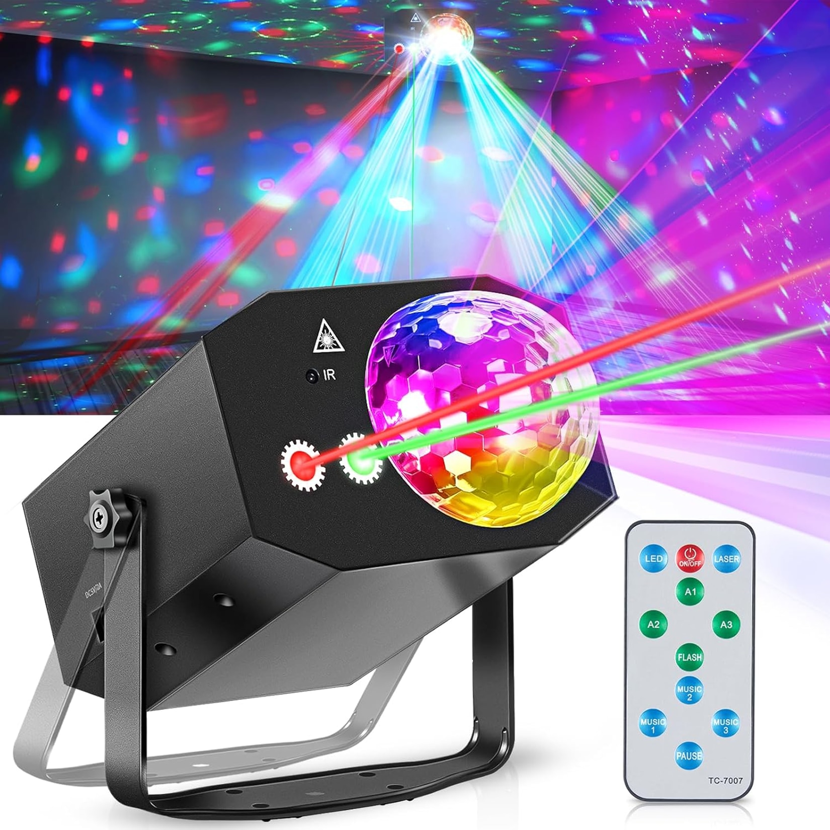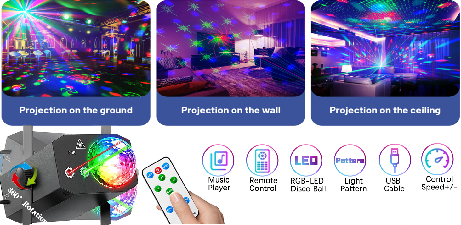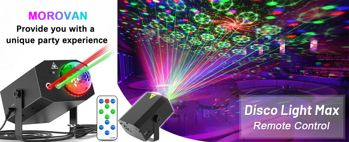 Laser lumini disco, MOROVAN, Proiector de lumini disco cu glob disco, telecomanda, sound control, multiple jocuri de lumini, laser effect, 64 modele laser, alimentare priza sau USB, carcasa metalica, Pentru scena de bar, camera, dormitor, 19X13X9cm, Negru