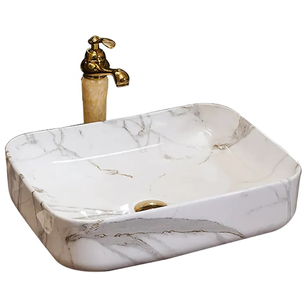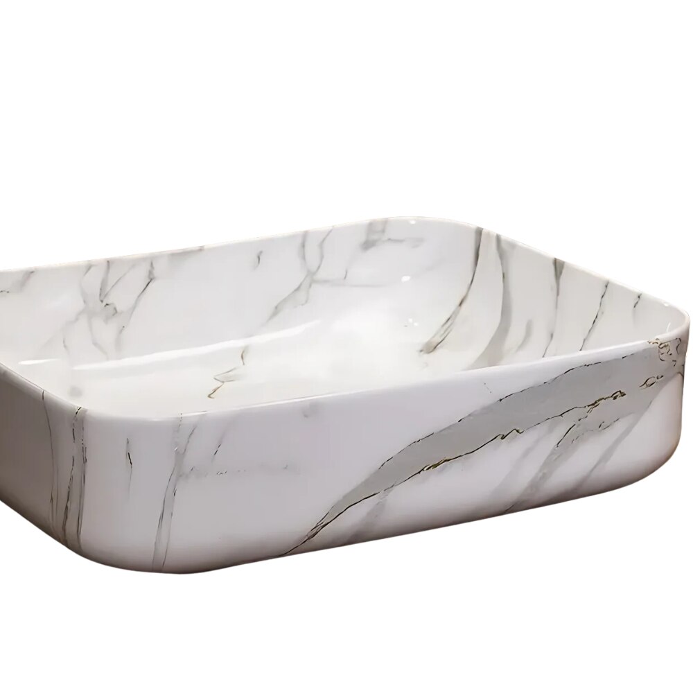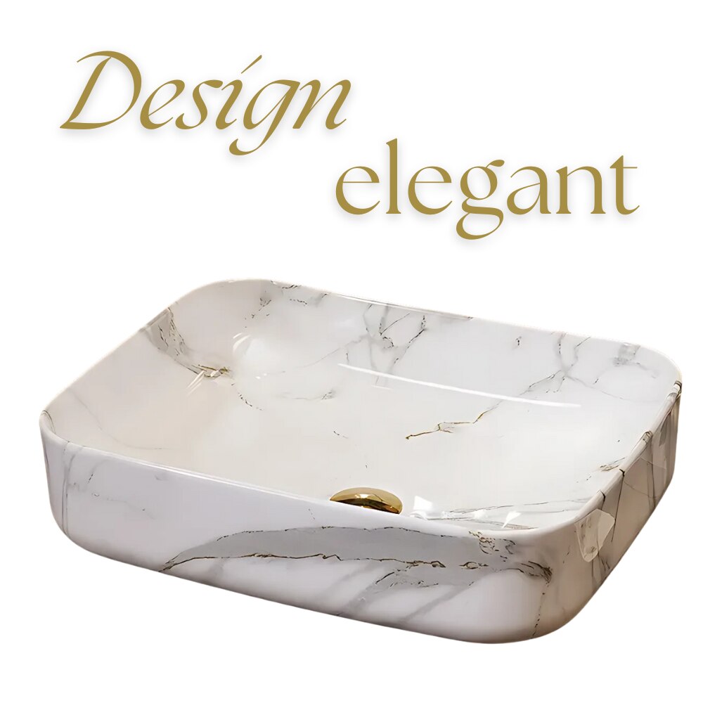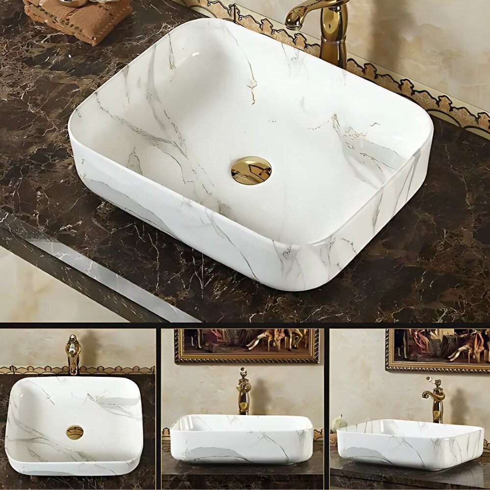 Lavoar modern pentru blat cu forma compacta si design elegant, fabricat din ceramica sanitara lucioasa cu model decorativ subtil, culoare alb si dimensiuni 40 x 30.5 cm, ideal pentru bai mici si decoruri rafinate, cod 047
