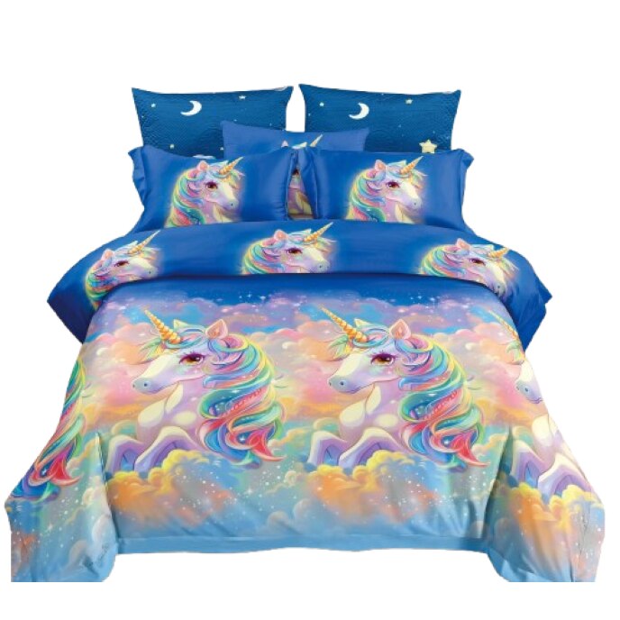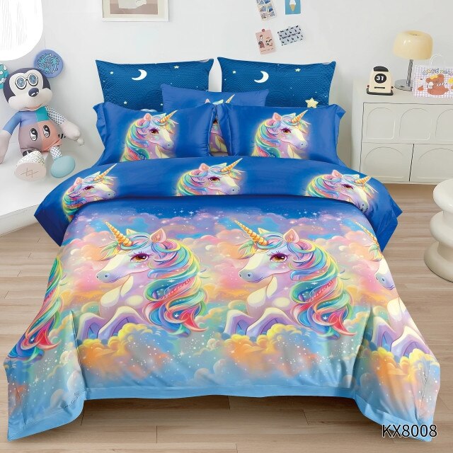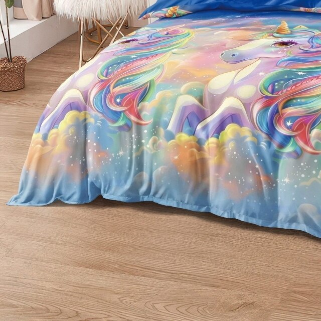 Lenjerie de Pat Dublu, Cearsaf Reversibil, 4 piese, Imprimeu Animat Copii, Unicorn Curcubeu, 1 Persoana, 155X230cm, Finet, Multicolor