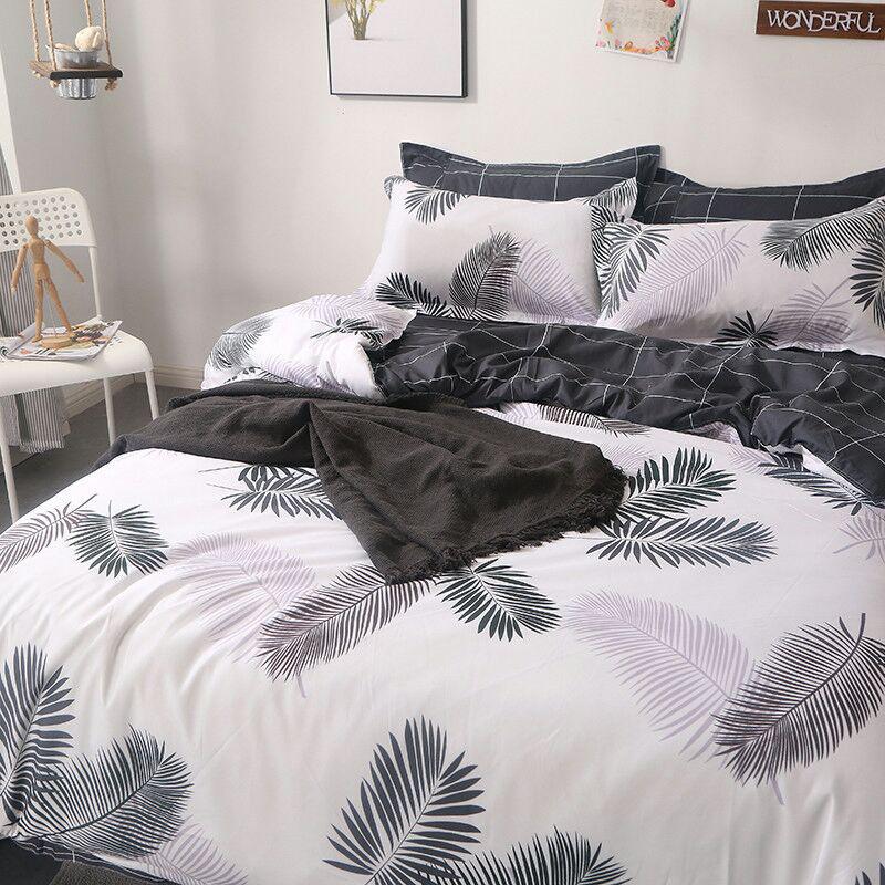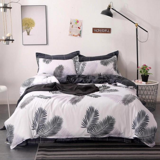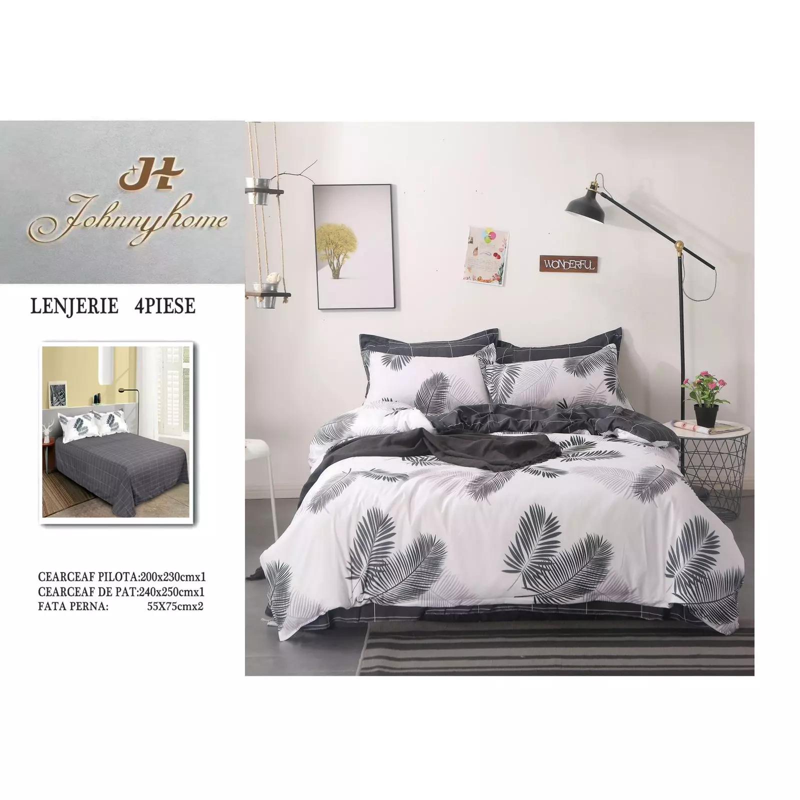 Lenjerie pat, Pucioasa, 4 piese, cearsaf simplu, Finet, gri si alb, model cu pene, 200x230