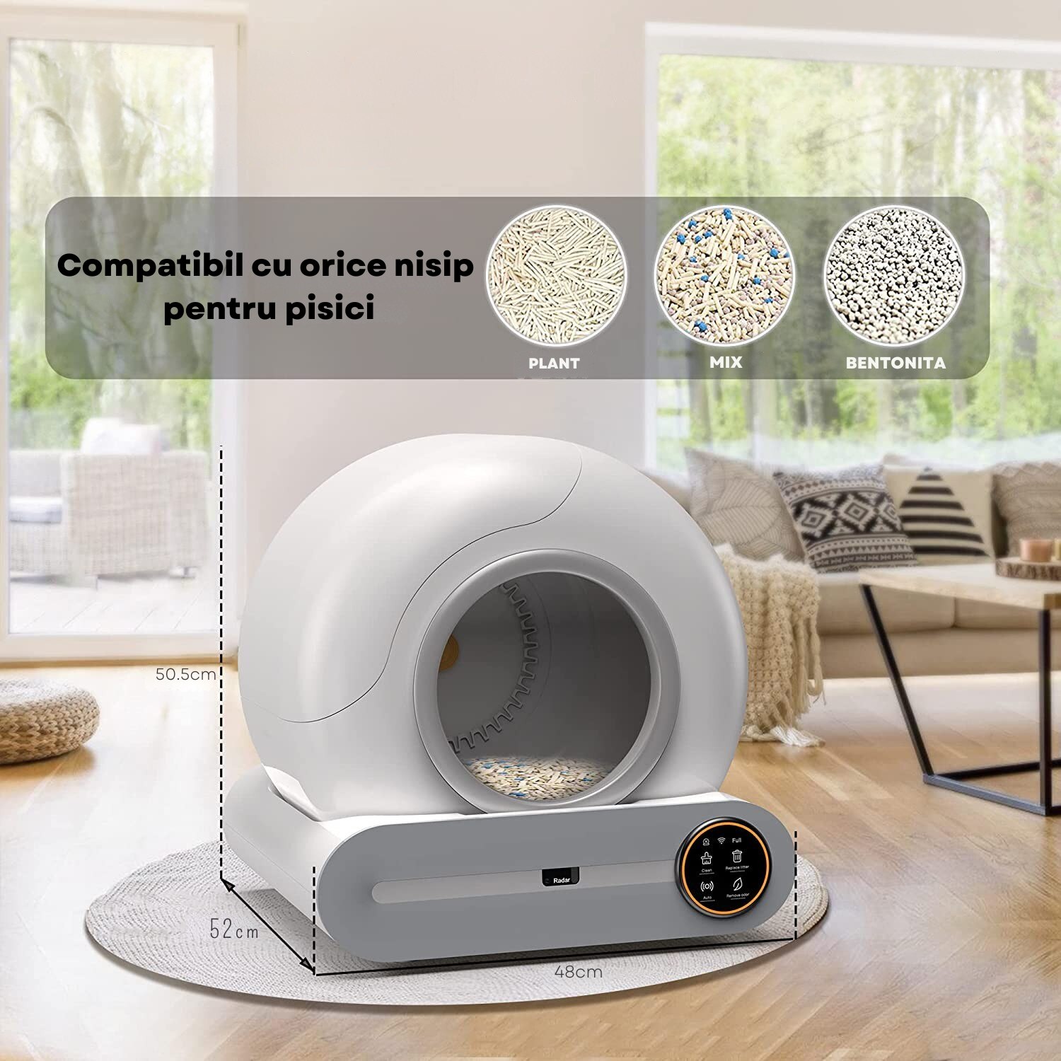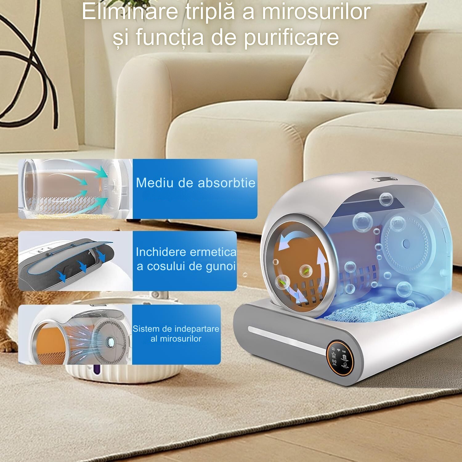 Litiera automata smart pentru pisici cu sistem de curatare automatizat, senzor gravitational, eliminare mirosuri si control complet din aplicatie, perfecta pentru mentinerea igienei fara efort in casele cu una sau mai multe pisici