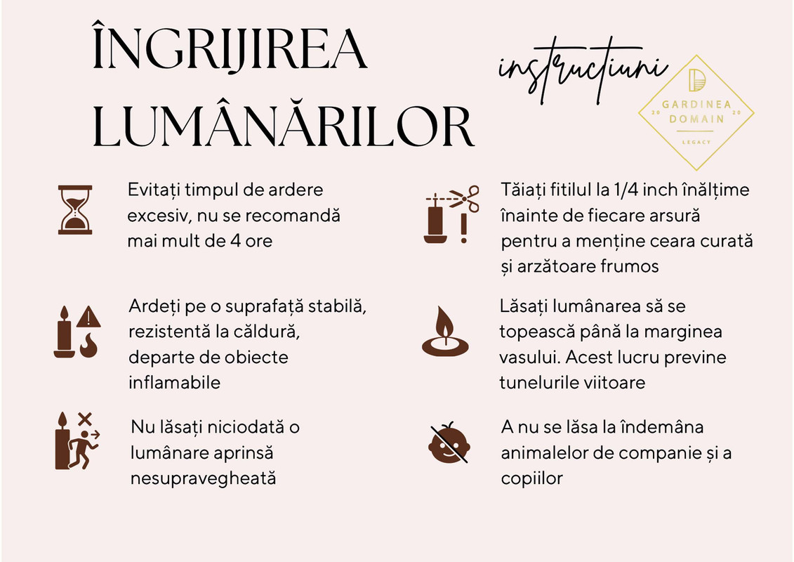 Punem mai jos cateva recomandari si atentionari importante pentru ca lumanarea dumneavoastra Gardinea Domain® sa arda in cele mai bune conditii de siguranta.