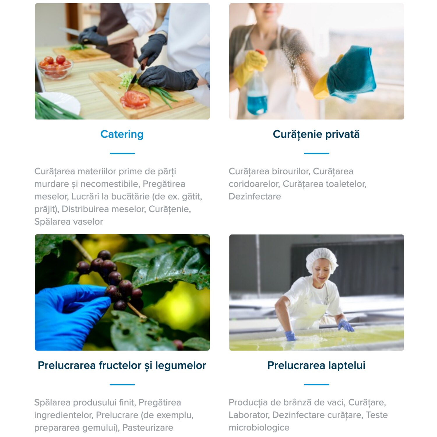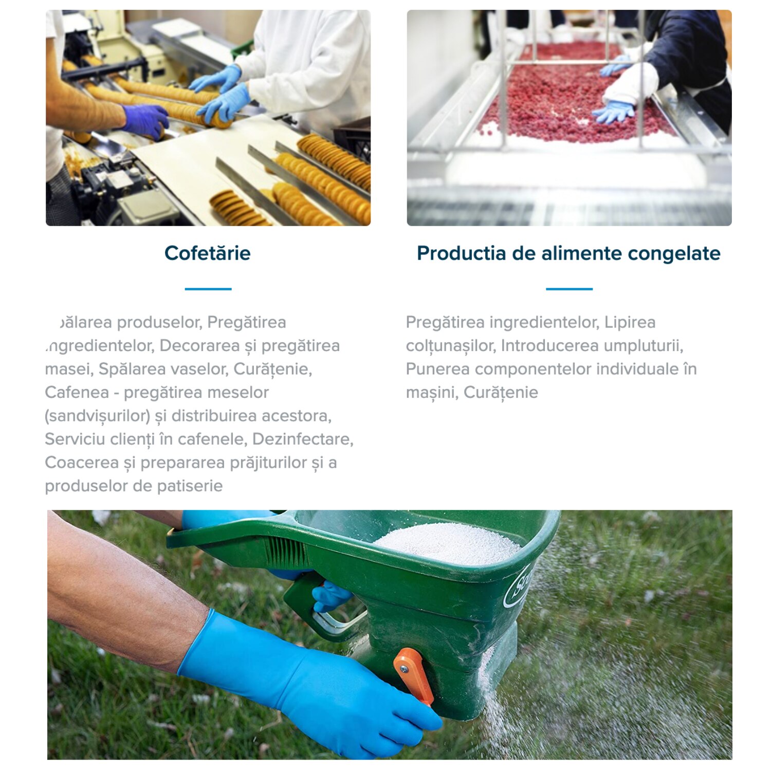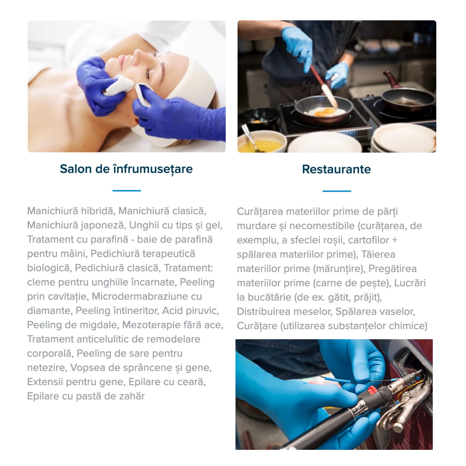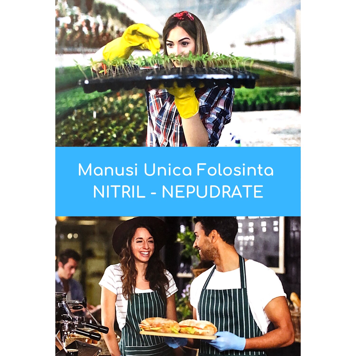 | Proprietati | Nepudrate Ambidextre Nesterile 100% nitril Fara latex Confera sensibilitate tactila Confectionate din Nitril, nepudrate |