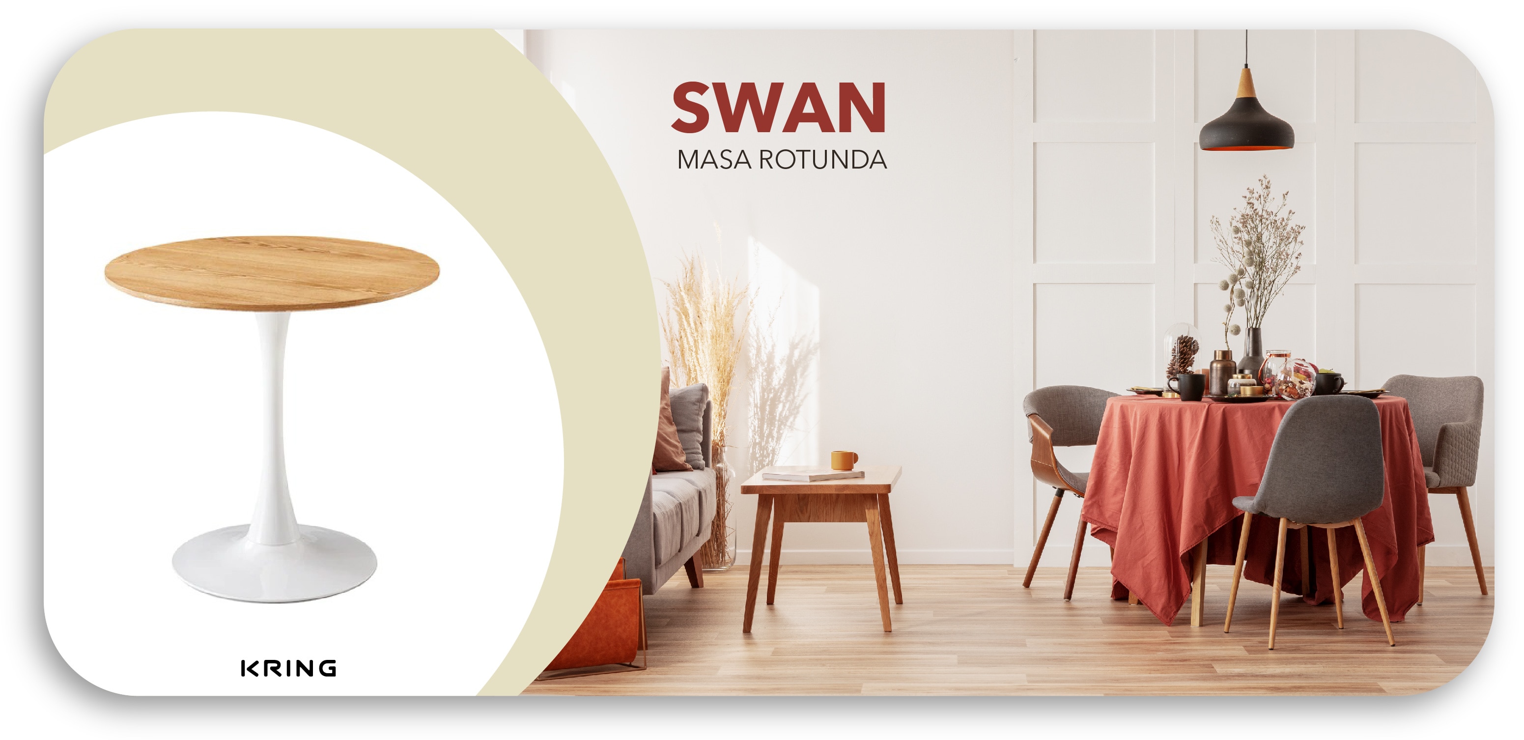 Masa dining/bucatarie Kring Swan, rotunda, cu piedestal, blat MDF / baza metal, 80x73 cm, Alb / Stejar