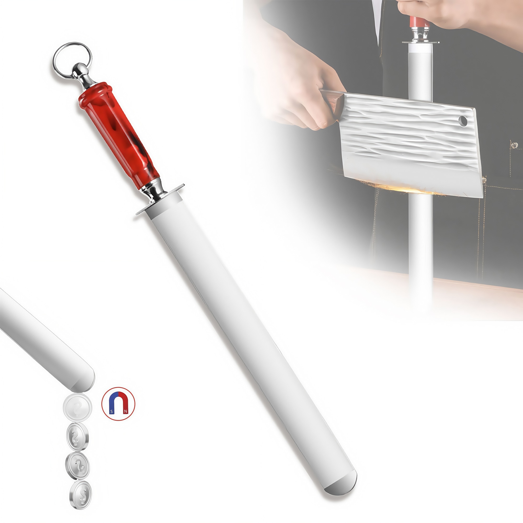 2. Cat de lung este otelul de ascutit in total? Acesta masoara 47 cm in lungime totala, cu o lungime a lamei de 30,5 cm, ceea ce o face versatila pentru ascutirea cutitelor de diferite dimensiuni, de la cutite mici de curatat la cutite mari cutite mari de bucatar.