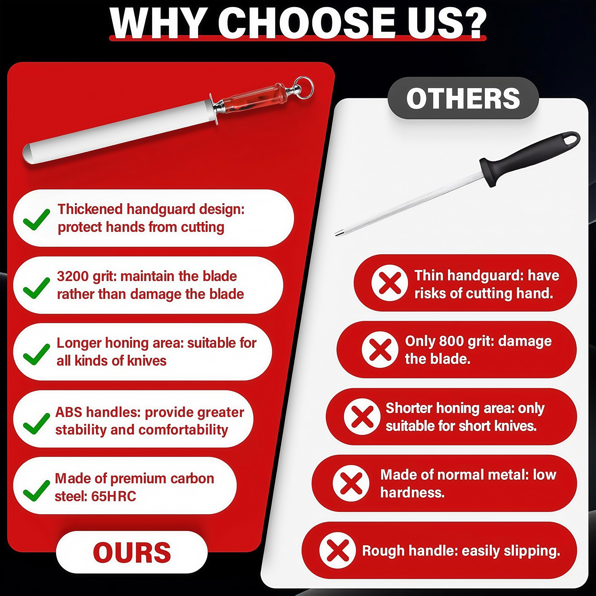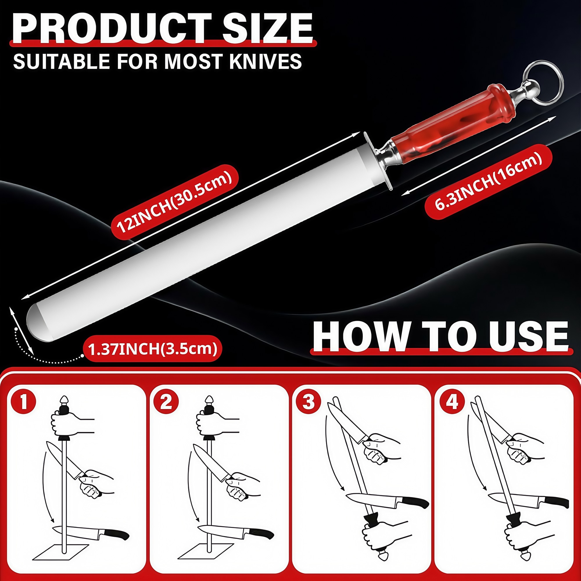 - Compatibilitate versatila cu cutitele- Potrivit pentru o gama larga de cutite, inclusiv de bucatarie si de macelarie datorita lungimii sale de 30 cm.