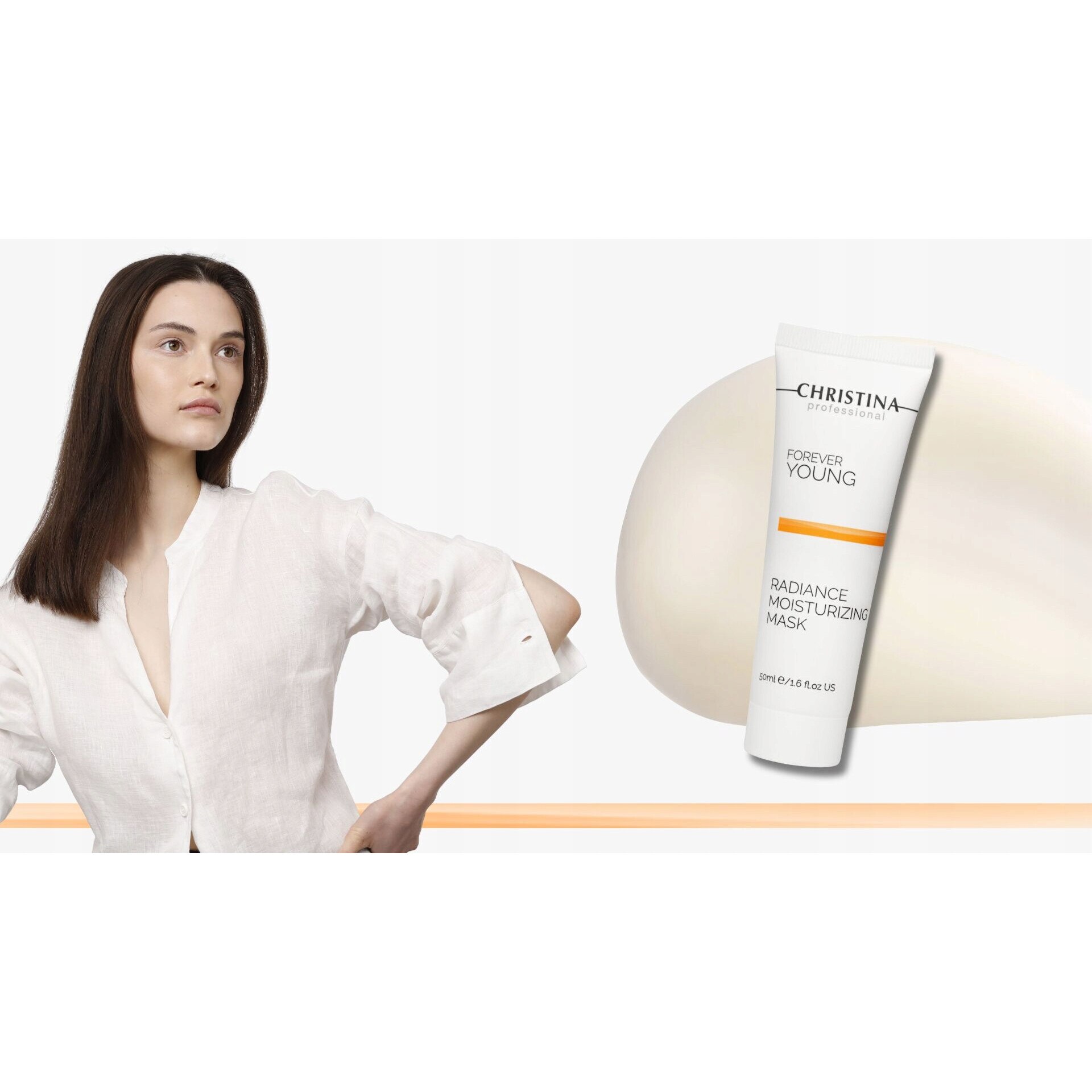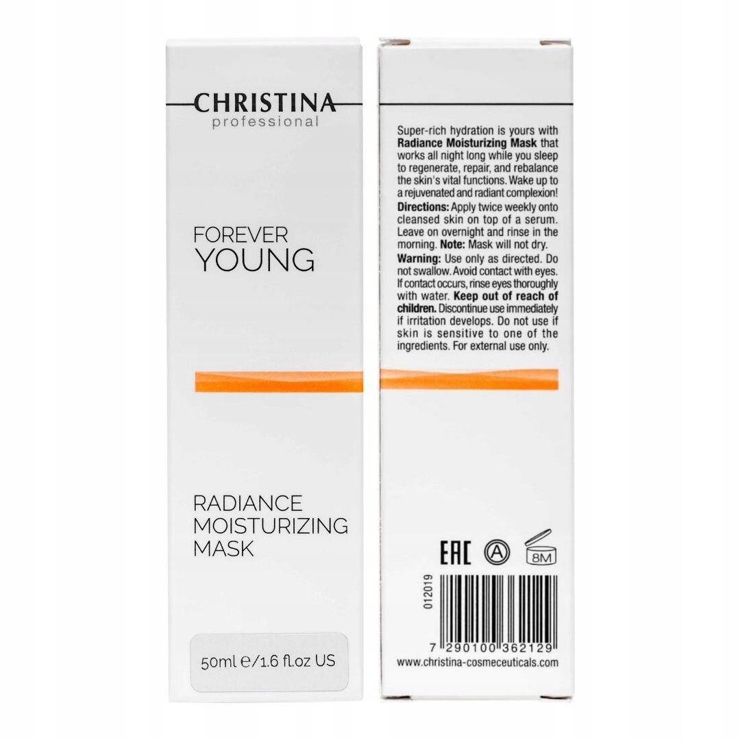 Forever Young Radiance Moisturizing Mask este o mască cu o consistență ușoară, non-grasă, care se absoarbe rapid, lăsând pielea moale și netedă. Se inchide intr-un ambalaj convenabil cu o capacitate de 50 ml. Formula sa se bazează pe ingrediente active atent selectate precum glicerină, unt de shea, dipalmitoil hidroxiprolina, acetil pentapeptidă-1, tripeptidă-1, ulei de avocado, acid hialuronic, acetat de tocoferol, palmitat de retinol (0,1%), acid ascorbic și β-caroten. . Linia Forever Young de la Christina este o îngrijire anti-îmbătrânire inovatoare care utilizează o formulă unică de biopeptide pentru a reduce și a preveni semnele îmbătrânirii pielii. Peptidele avansate și fitosterolii pătrund adânc în piele pentru a lupta împotriva daunelor cauzate de mediu, hormoni și stres. Produsele din linia Forever Young întăresc funcțiile naturale și mecanismele de apărare ale pielii, ajutând la restabilirea volumului, fermității și aspectului strălucitor pierdut. Aplicarea măștii este simplă - doar aplicați un strat generos pe pielea curățată a feței, lăsați să acționeze 7-10 minute, apoi clătiți cu apă caldă.