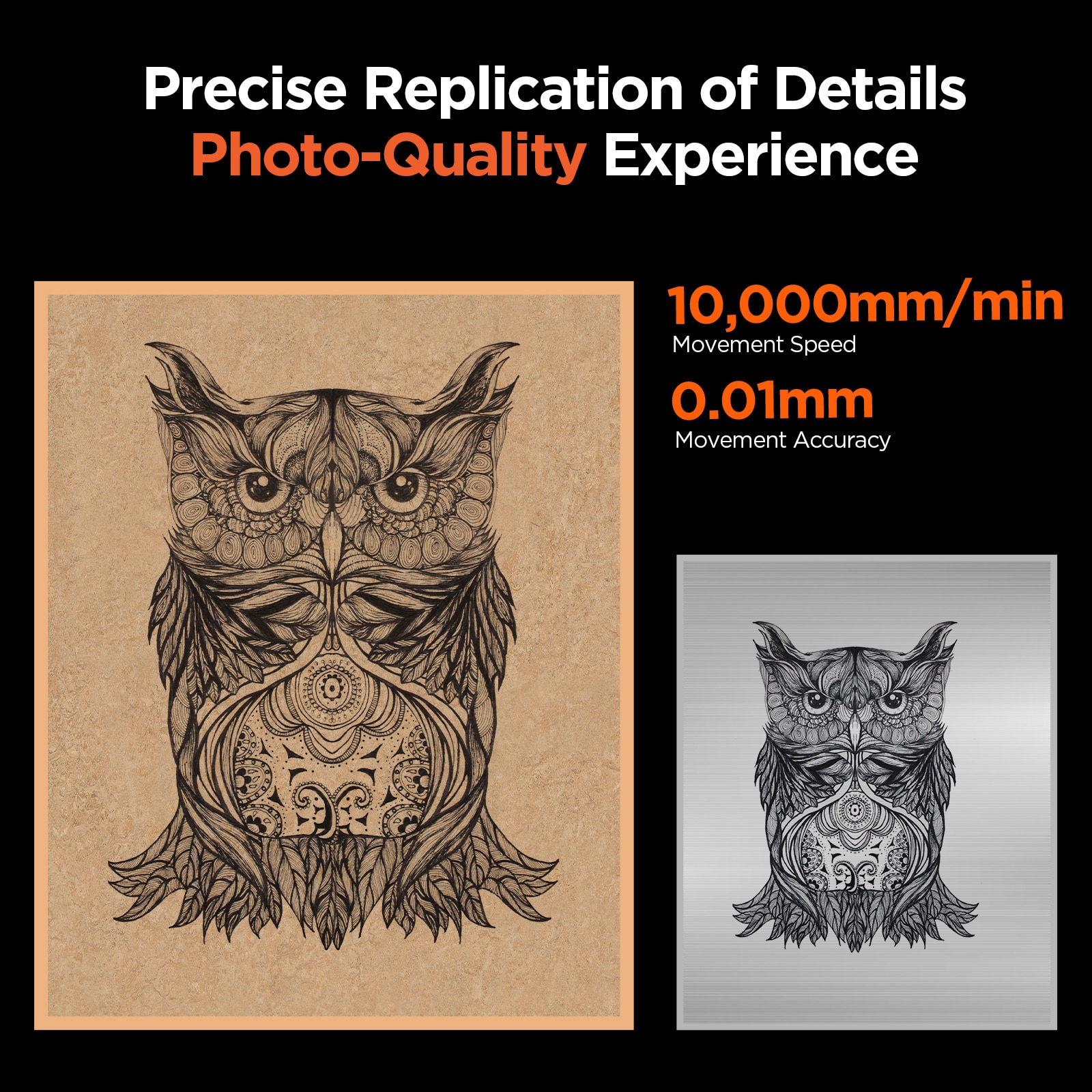 Specificatii Putere laser: 20W optic (20.000mW) Zona de lucru: 400 x 385 mm Viteza maxima: 10.000 mm/min Compatibilitate materiale: Lemn, Metal, Sticla, Acril, Piele, Plastic Material cadru: Aliaj integral de aluminiu Suport software: LaserGRBL, LightBurn Suport sistem: Windows, macOS, aplicatie mobila Conectivitate: Wi-Fi, USB, card TF Caracteristici de siguranta: Oprire de urgenta, detectare inclinare, blocare pentru copii Optiuni cap laser: 10W (implicit), 20W, 2W infrarosu (optional) Extensibil: Da (suport pentru extensia axei Y) Precizie laser: focalizare fascicul de 0,06 mm