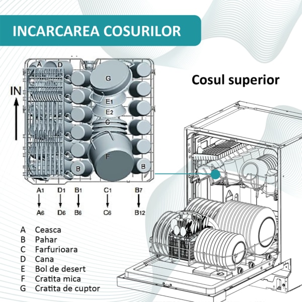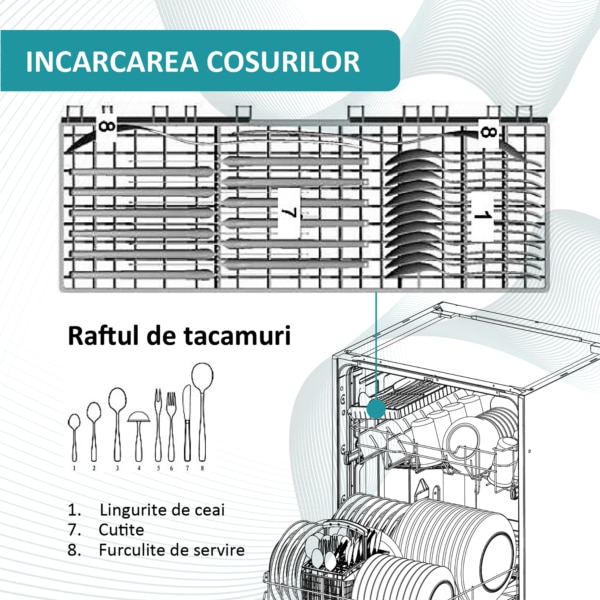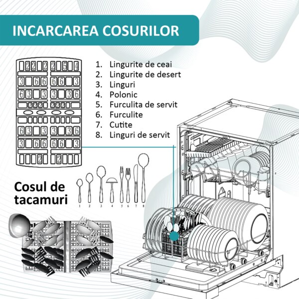 | Functii | Blocare acces copii Indicator sare Pornire programabila Memorie ultima setare Cos pentru tacamuri Indicator nivel solutie clatire |