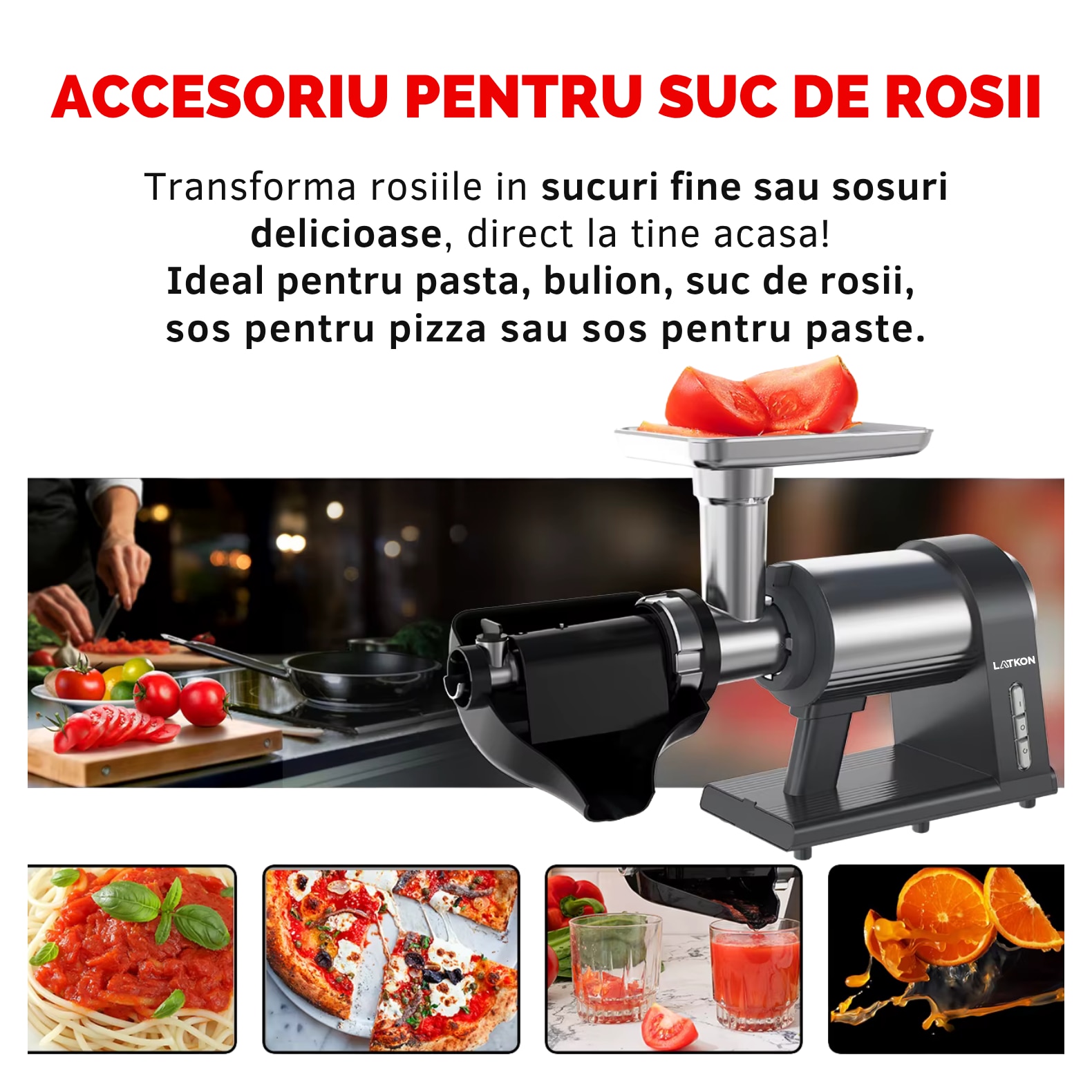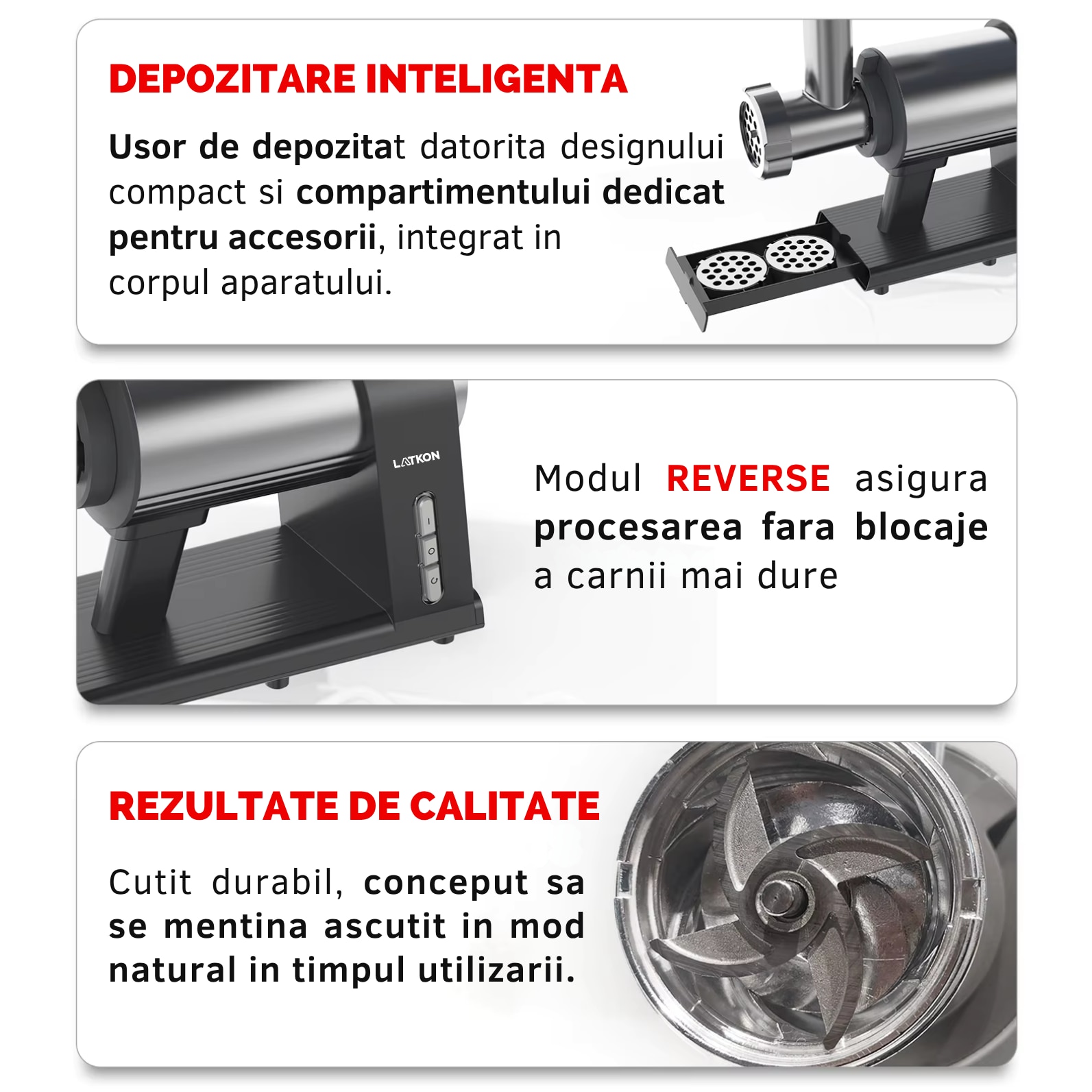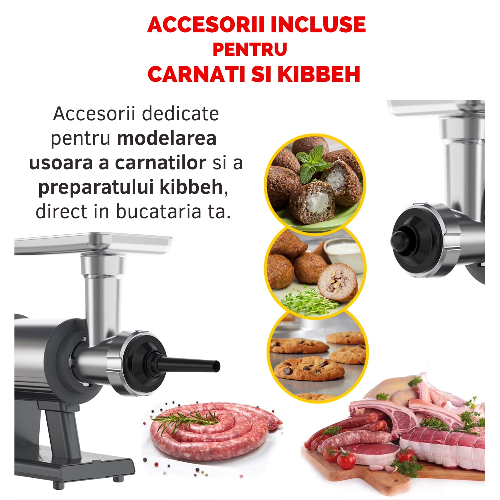 | Accesorii incluse | Accesoriu impingere Accesoriu pentru carnati Accesoriu pentru Kebbe Accesoriu pentru suc de tomate Accesoriu pentru chiftele |