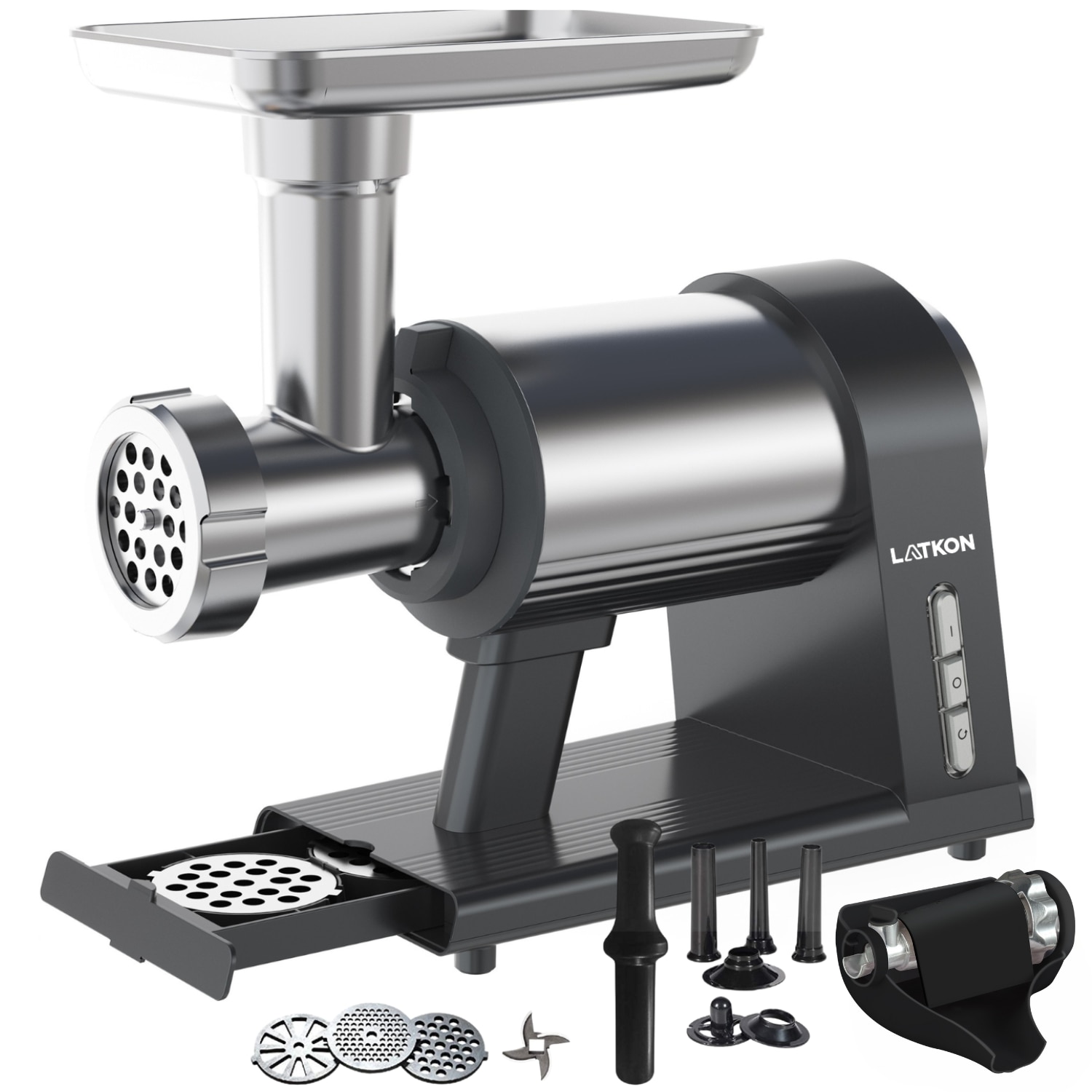 Masina de tocat carne Latkon® MG-001, 2000 W, Angrenaje Metalice, 3 Site de tocat, Accesoriu pentru suc rosii, Carnati, Kibbeh, Cutit Inox, Functie Reverse, Compartiment pentru site, Gri