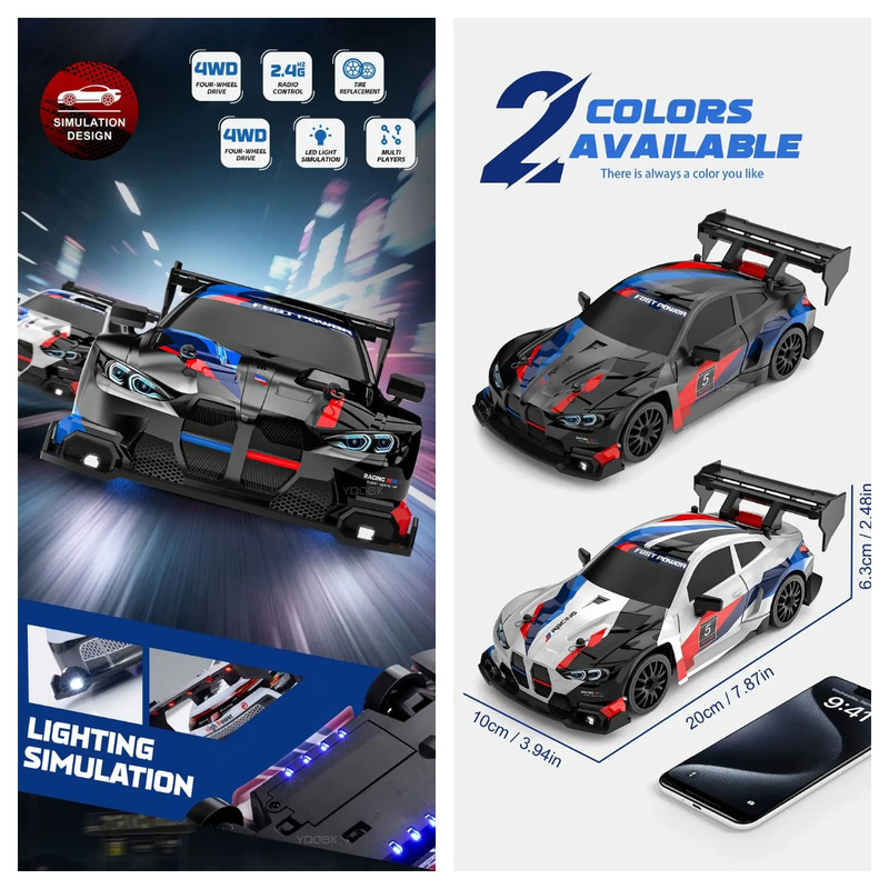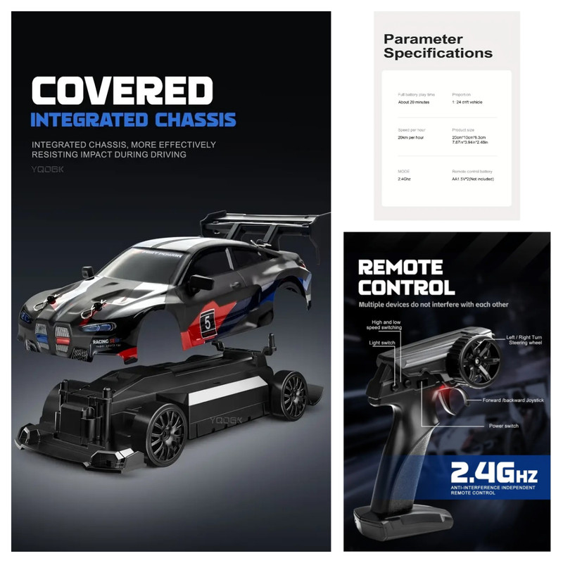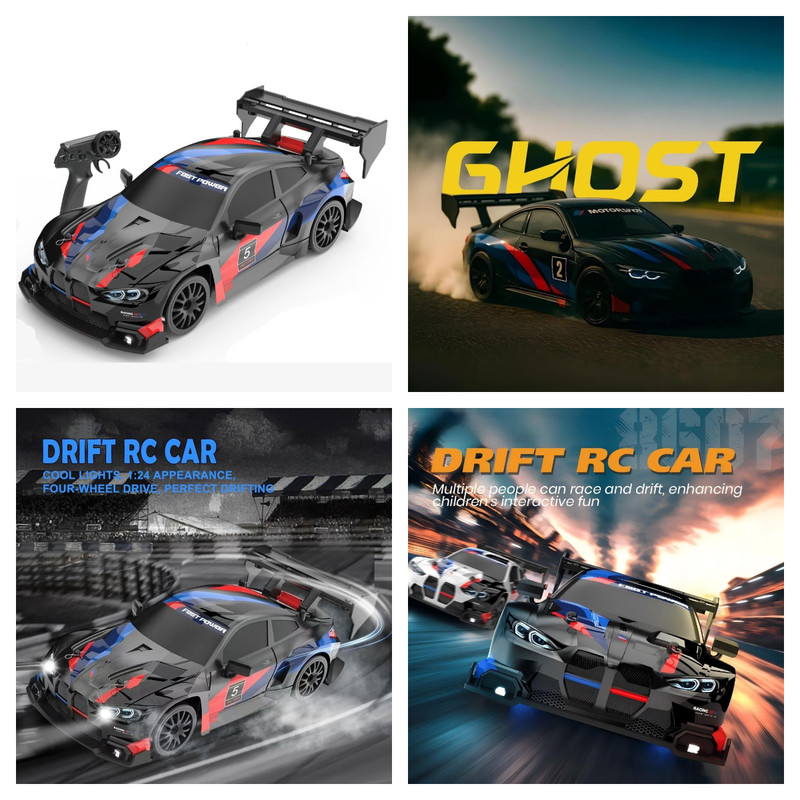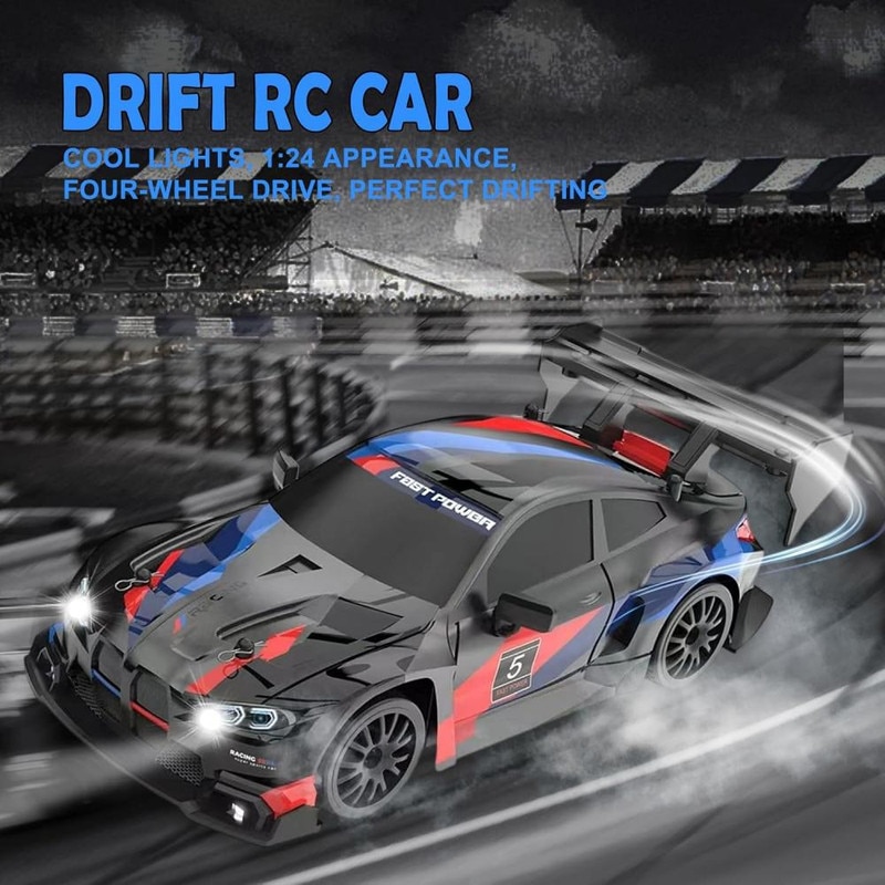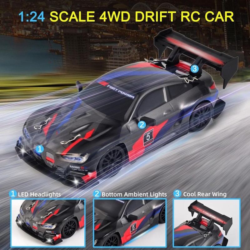 Masina drift 1:24, 20 km/h, 4WD, mini masina RC 2.4 GHz cu lumini LED, cel mai bun cadou pentru copii, negru