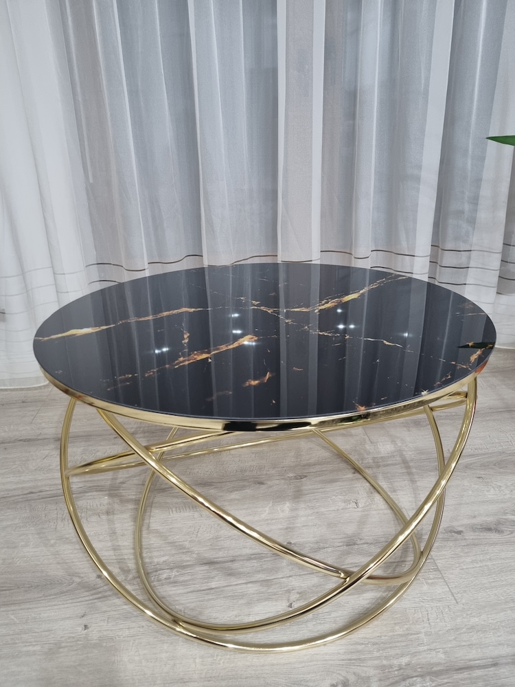 Masuta de cafea DacEnergy©, cadru metalic nichelat, sticla alba cu aspect marmorat, design unic, atractiv, forma rotunda, fixa, 75 x 45 cm, alba