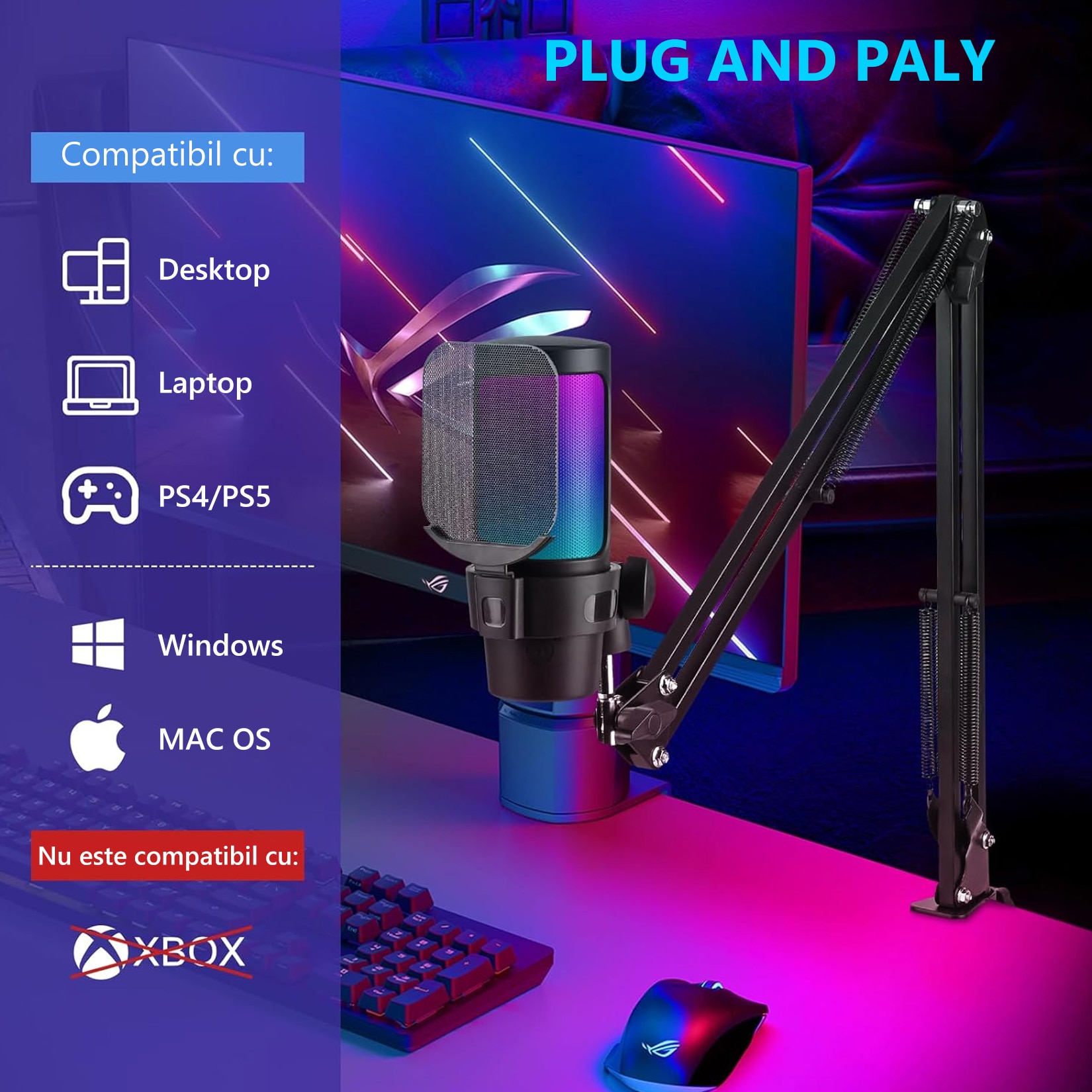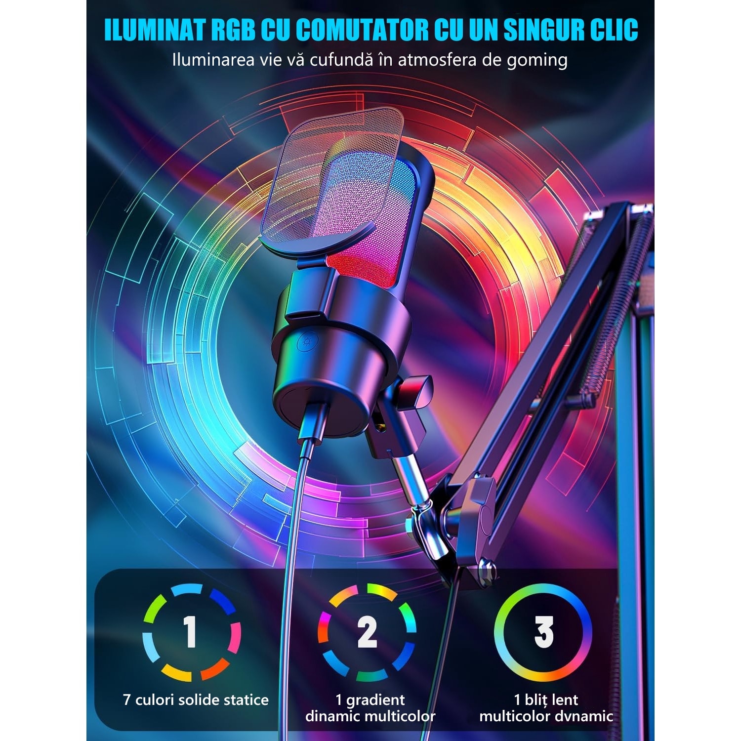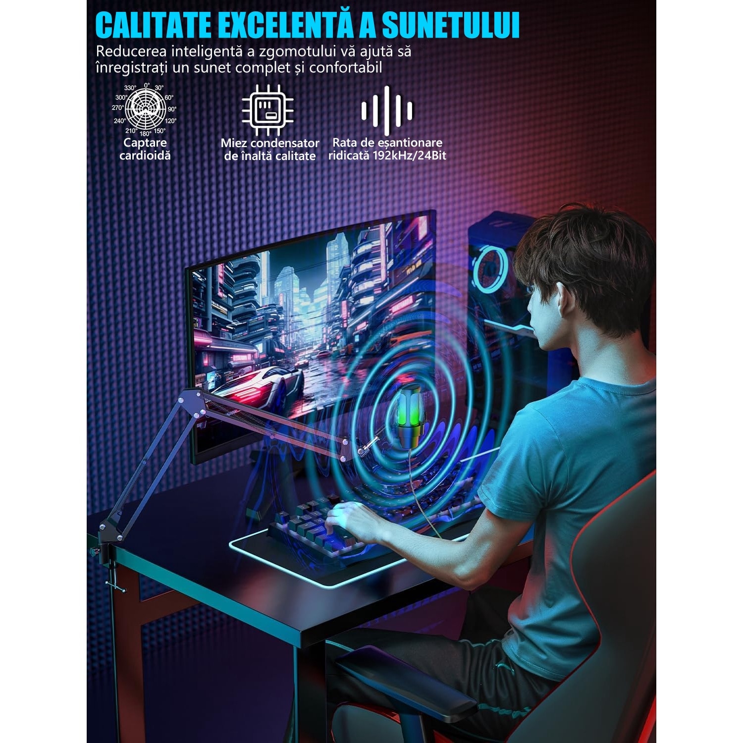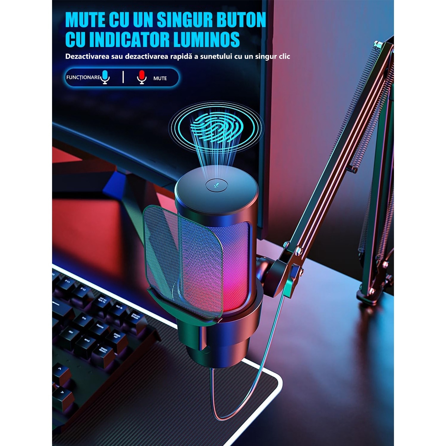 Microfon Gaming, pentru Streaming, Youtube, Reducere Zgomot Fundal, Functie Mute, Cardioid, lumina RGB, Condensator, Profesional, Conexiune USB, Brat Ajustabil, compatibil Windows, MacOS, PS4, PS5, Negru
