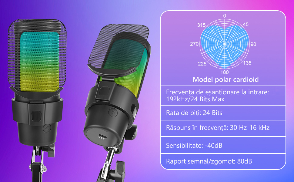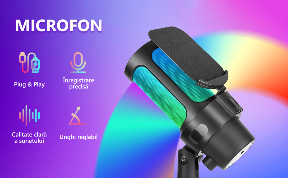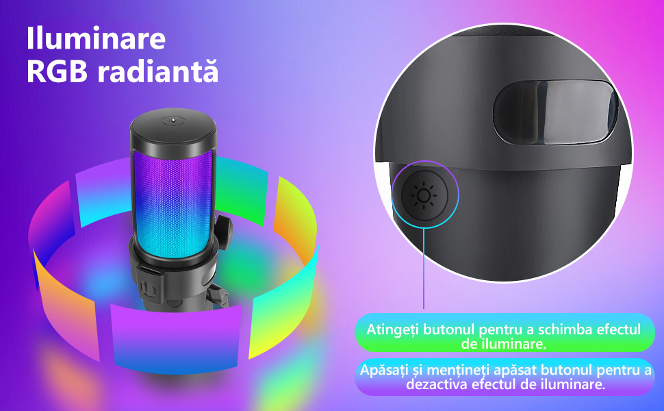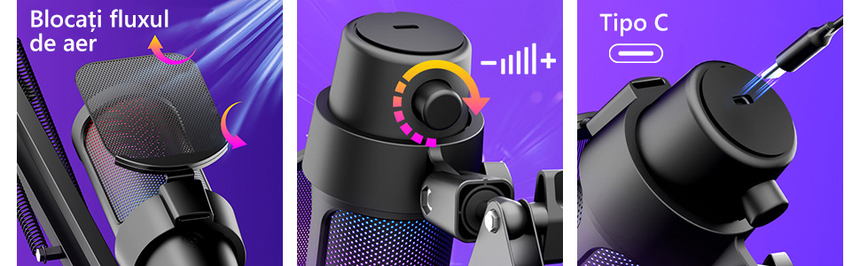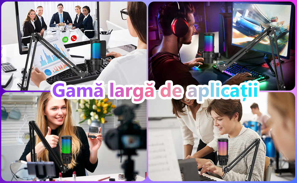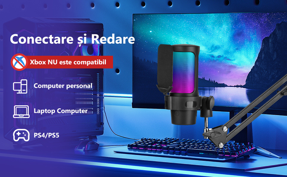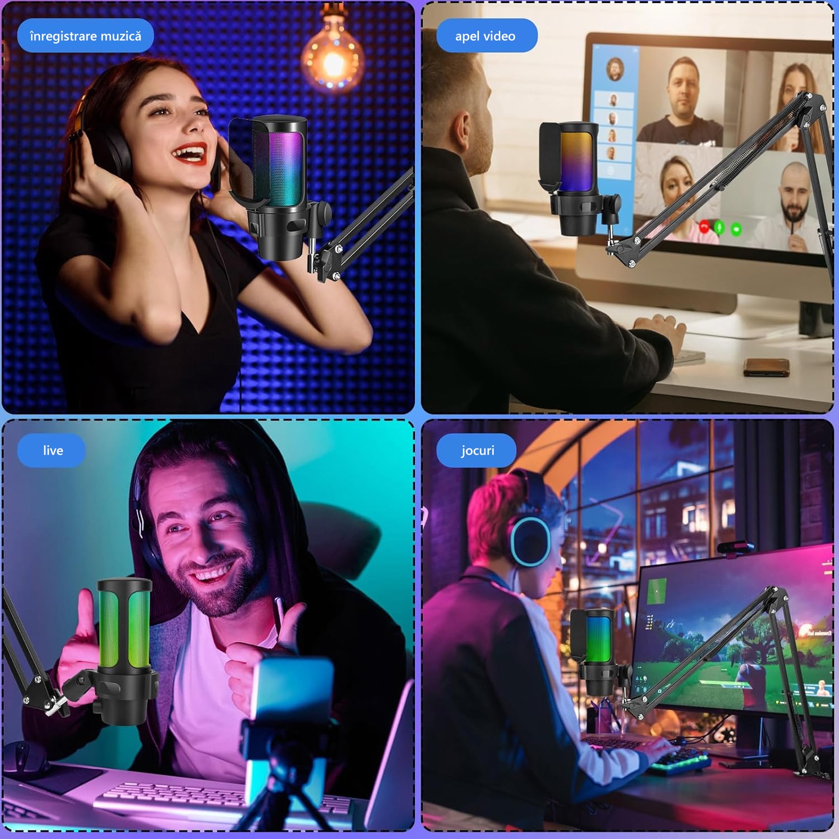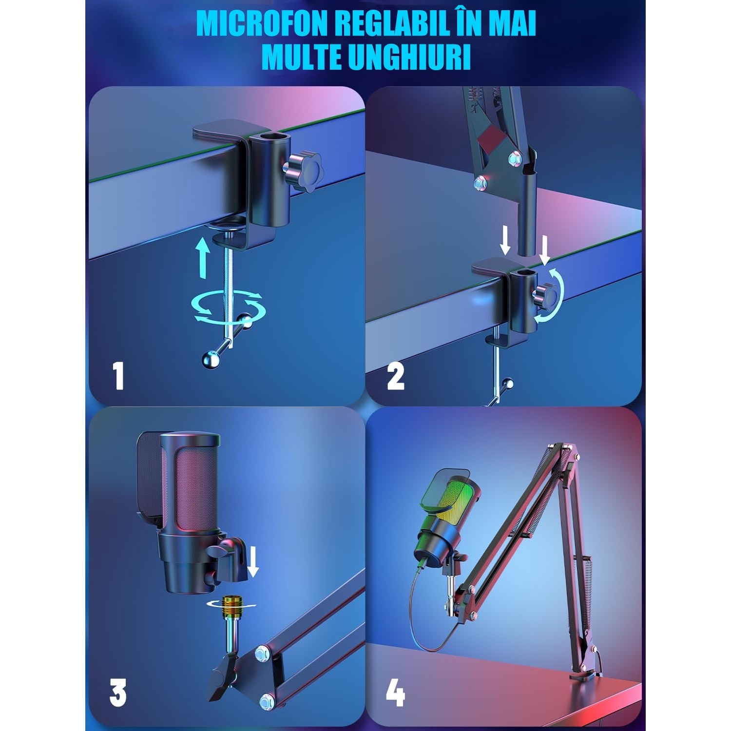 Microfon Gaming, pentru Streaming, Youtube, Reducere Zgomot Fundal, Functie Mute, Cardioid, lumina RGB, Condensator, Profesional, Conexiune USB, Brat Ajustabil, compatibil Windows, MacOS, PS4, PS5, Negru