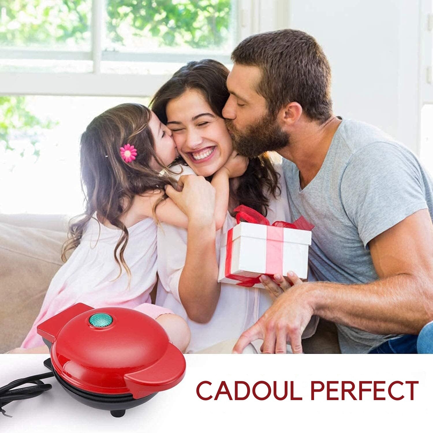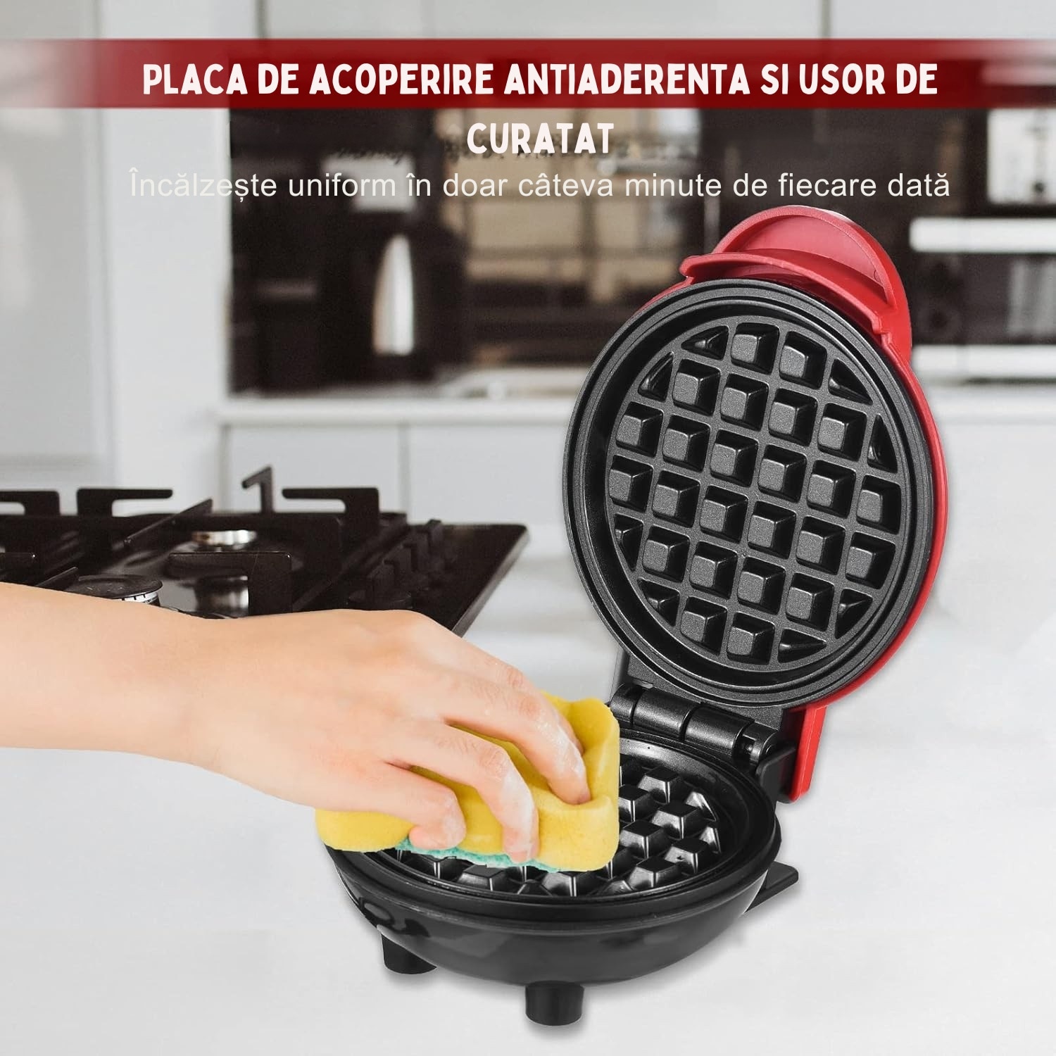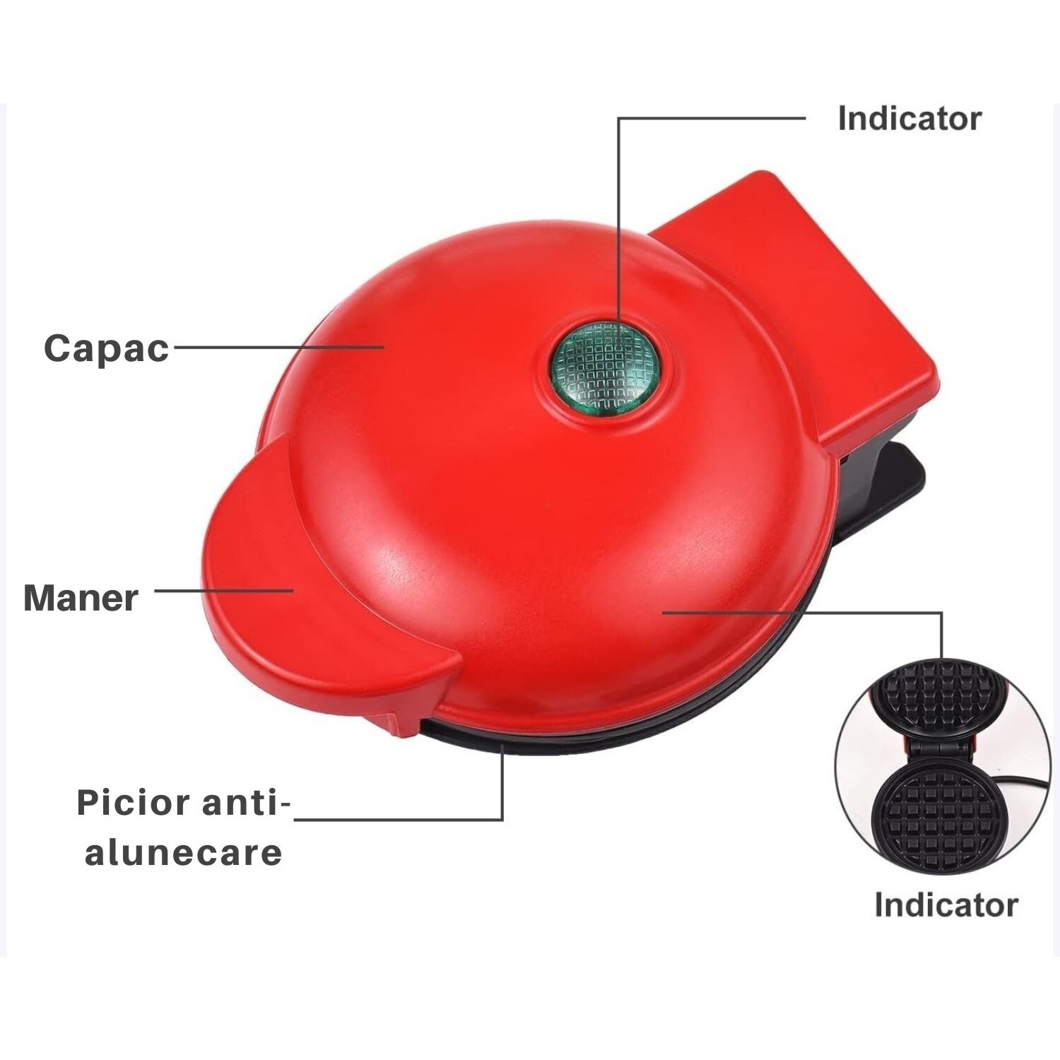 Mini aparat de facut gofre si vafe, placi cu strat antiaderent pentru curatare usoara, indicator LED pentru temperatura optima, design rosu compact, ideal pentru gustari rapide si versatile