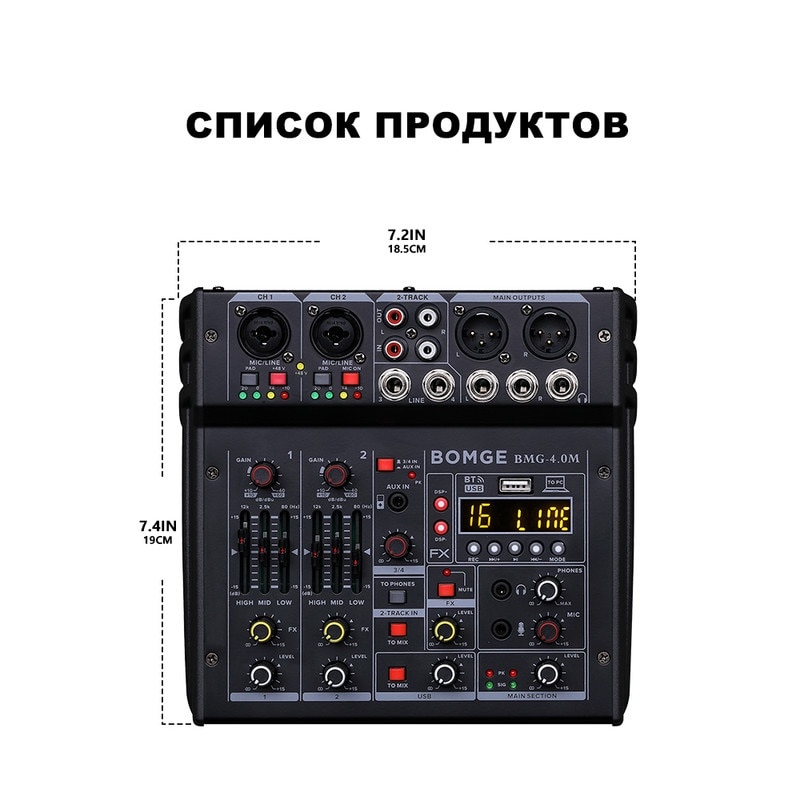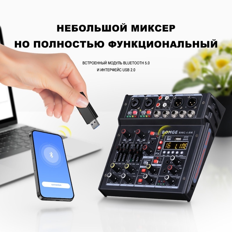 Mixer audio BOMGE Profesional 4 canale, 48V Phantom, USB, efecte digitale, 24 efecte DSP, XLR out, Inerface audio, Placa de sunet, Potrivit pentru petreceri profesionale de inregistrare, KTV si scena, Negru