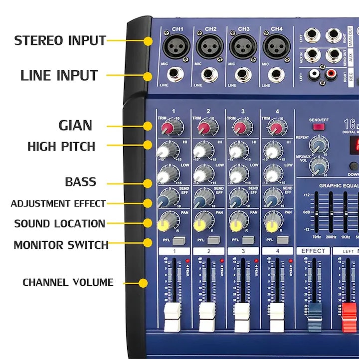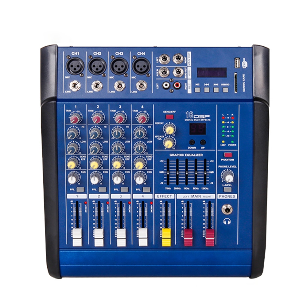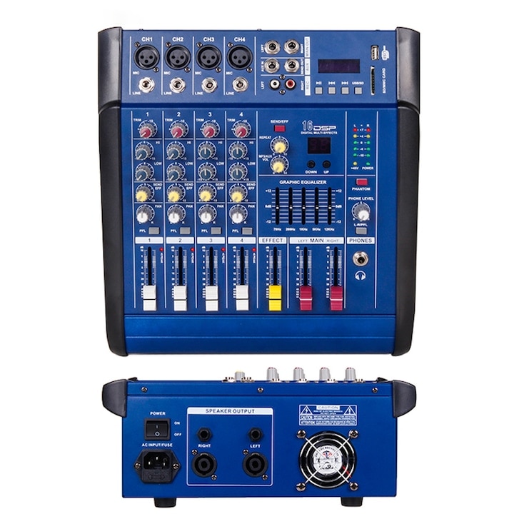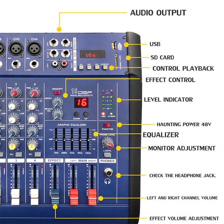 Bluetooth incorporat/redare USB/sursa de alimentare 48V/monitorizare casti, design modern si ultra-subtire, design inalt dinamic, zgomot redus al mixerului, preamplificator de microfon de inalta calitate, praf de inalta densitate si reglaj durabil, mic. Consola de sunet are un bogatie de interfete de intrare si iesire, care pot conecta o varietate de echipamente audio, microfoane cu fir/fara fir, tastaturi electronice, amplificatoare de computer, difuzoare etc. 4 Consola de productie in camp de intrare: intrare cu 4 canale, fiecare canal are inalta, medie si joasa reglare independenta/reglare a castigului, ajustare a efectului de reverberatie etc., conectati castile pentru a monitoriza semnalul de nivel al fiecarui canal in timp real, cu mufa de intrare echilibrata pentru microfon, este un amplificator de microfon de inalta calitate, Canale cu intrari XLR, pentru sunet live si Inregistrare Home Studio. Pe langa sursa de alimentare, poate fi alimentat si de computere/banci de alimentare. Fiecare mono are 2 segmente de egalizare: ton independent inalt si scazut, prin ajustarea egalizatorului cu 2 benzi al mixerului, basul si basul sunt speciale, efect de reverb mai compact,Poate fi conectat pe scara larga microfon cu fir, microfon fara fir, tastatura, post-amplificator , calculator, chitara etc; player practic si facilitate de redare pentru a va oferi toate oportunitatile de a face spectacolul live cat mai rapid si usor de configurat posibil. Suport de redare multi-format si multifunctional: Cu functie de redare Bluetooth, accepta decodarea de citire directa a cardului USB /MP3/SD, cu afisaj cu cristale lichide, facand operarea mai intuitiva si mai convenabila, Facilitatea cardului pentru inregistrarea/redarea stereo face ideala pentru proiect inregistrare acasa sau oferind posibilitatea de a furniza muzica de interval/back-up pentru spectacolul dvs. live. Conectivitate Bluetooth-Intrare disc U: Plug and play, suporta dispozitivul de stocare mobil U disc, poate salva melodii pe disc U, introduce si reda, Bluetooth fara fir Conexiune 1 secunda: modul receptor Bluetooth incorporat, conexiune fara fir, potrivit pentru majoritatea electronicelor Bluetooth dispozitive, conexiune rapida, procesare bas, monitorizare, melodii cu microfon, player MP3.