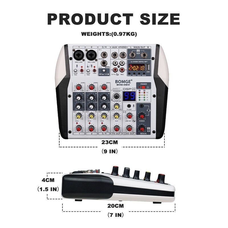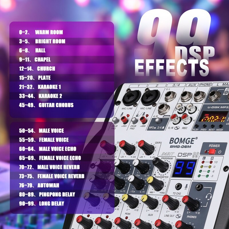 Mixer audio Profesional 06M BOMGE 6 canale, 48V Phantom, USB, efecte digitale, 99 efecte DSP, XLR out, Inerface audio, Placa de sunet, Potrivit pentru petreceri profesionale de inregistrare, KTV si scena, Negru
