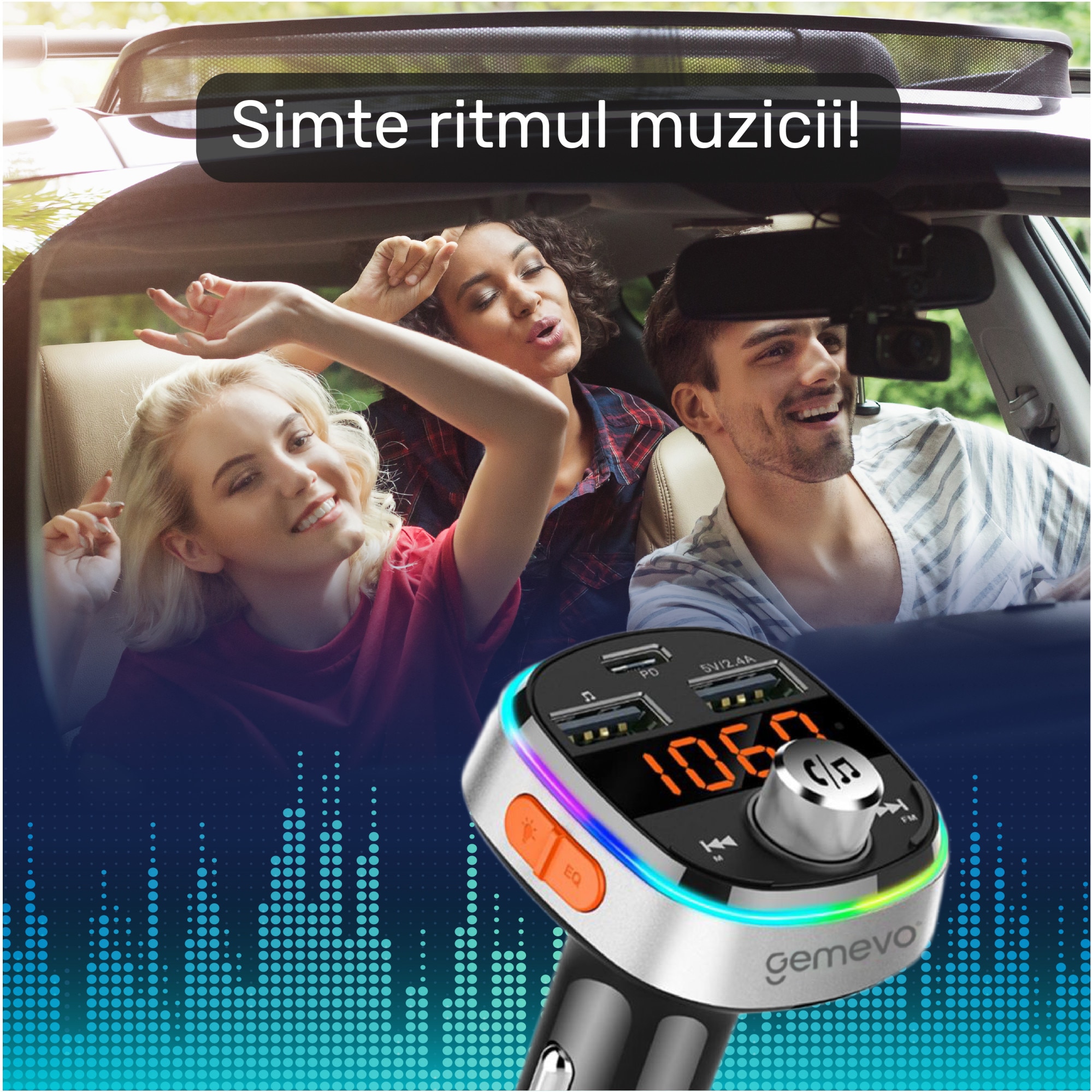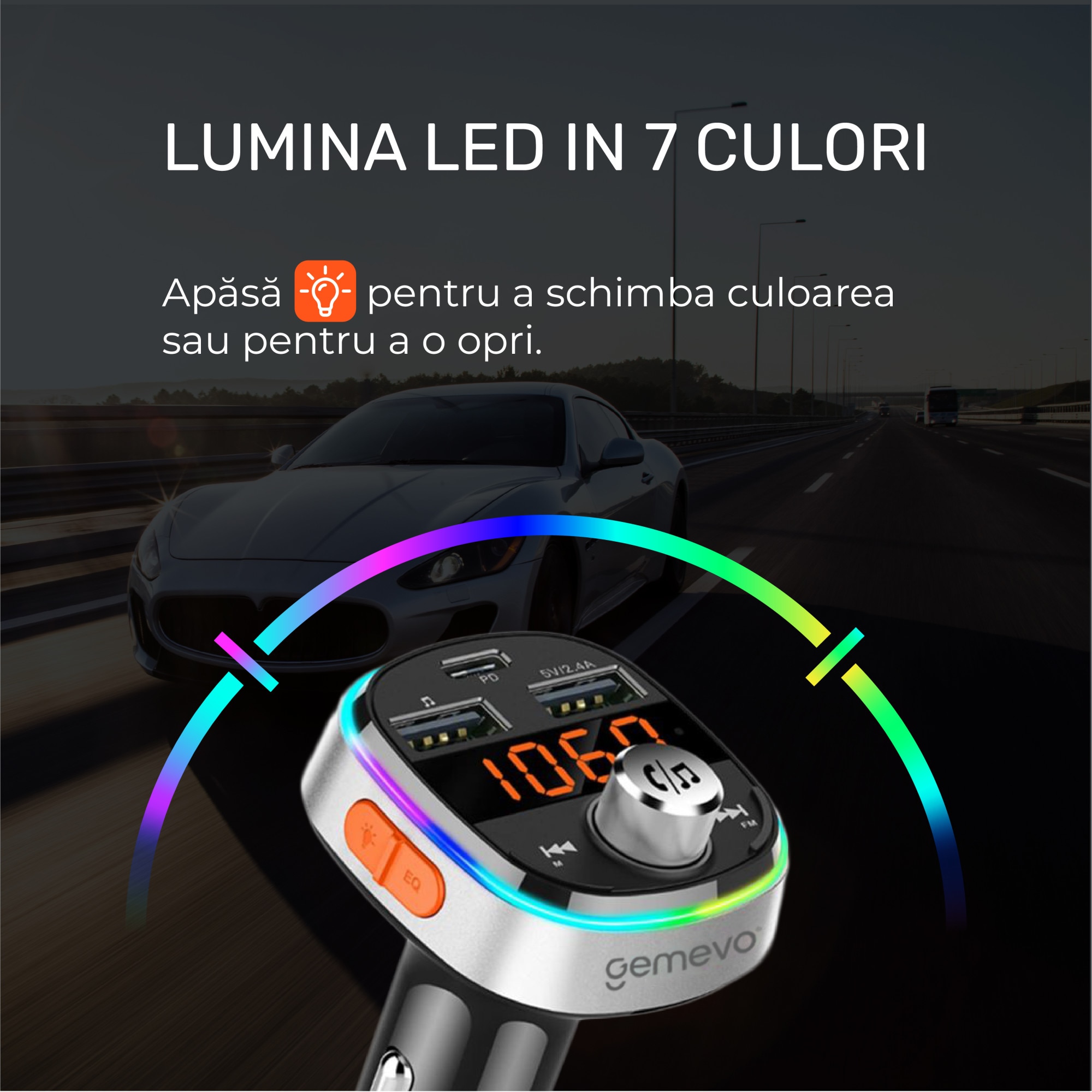 Modulator FM Gemevo® Bluetooth 5.0, Transmitator FM cu functie de incarcator auto quickcharge 3.0 si port USB C, Gemevo