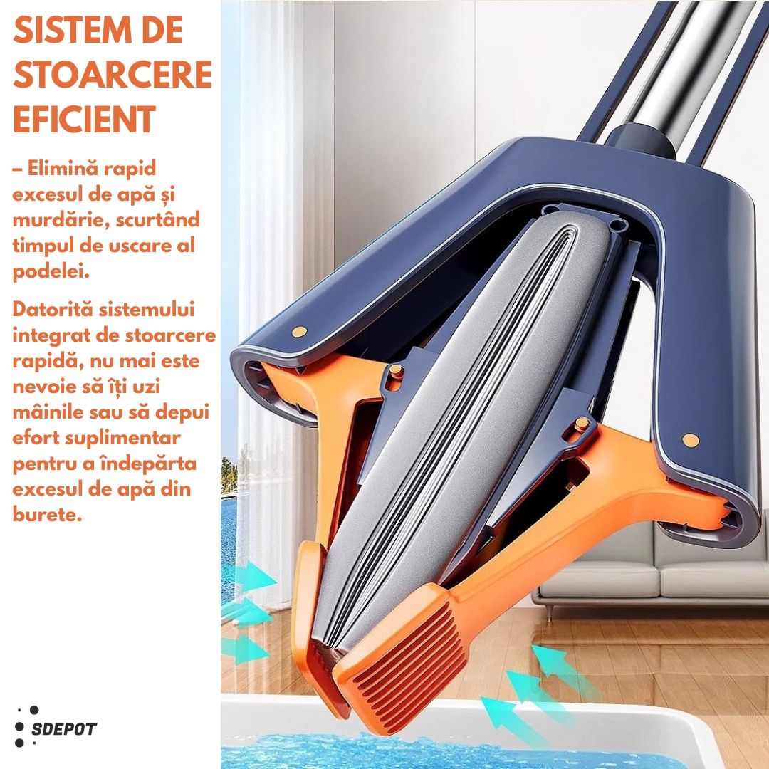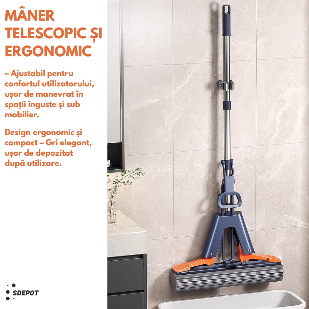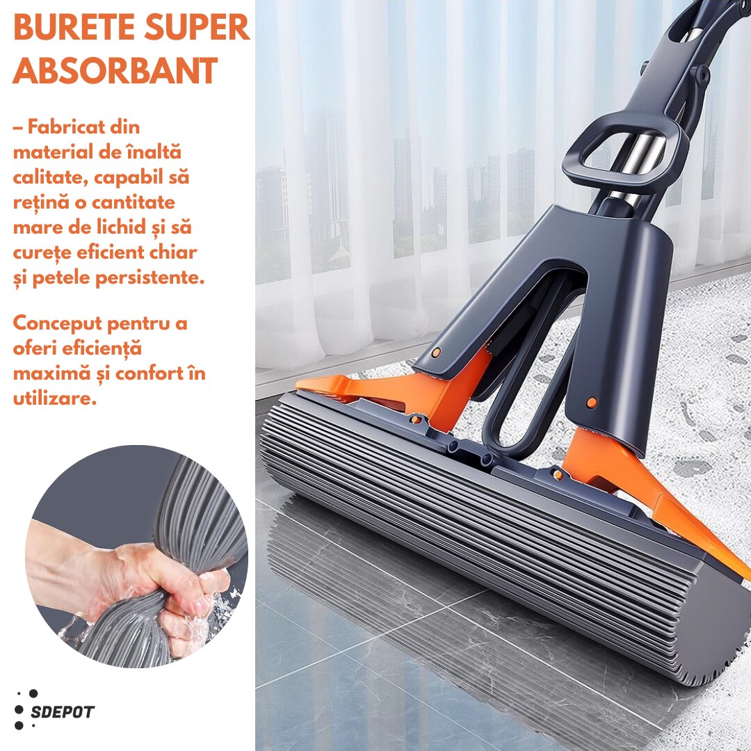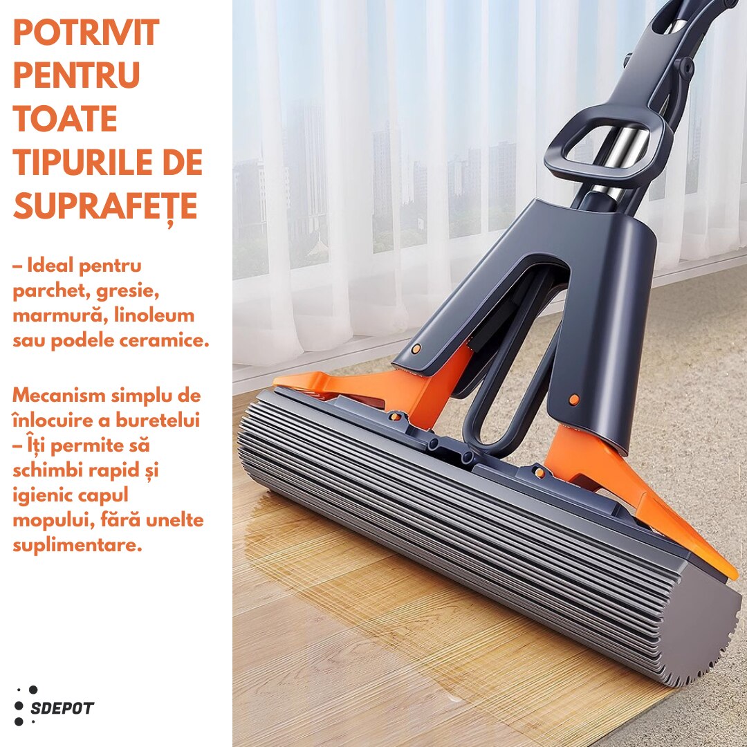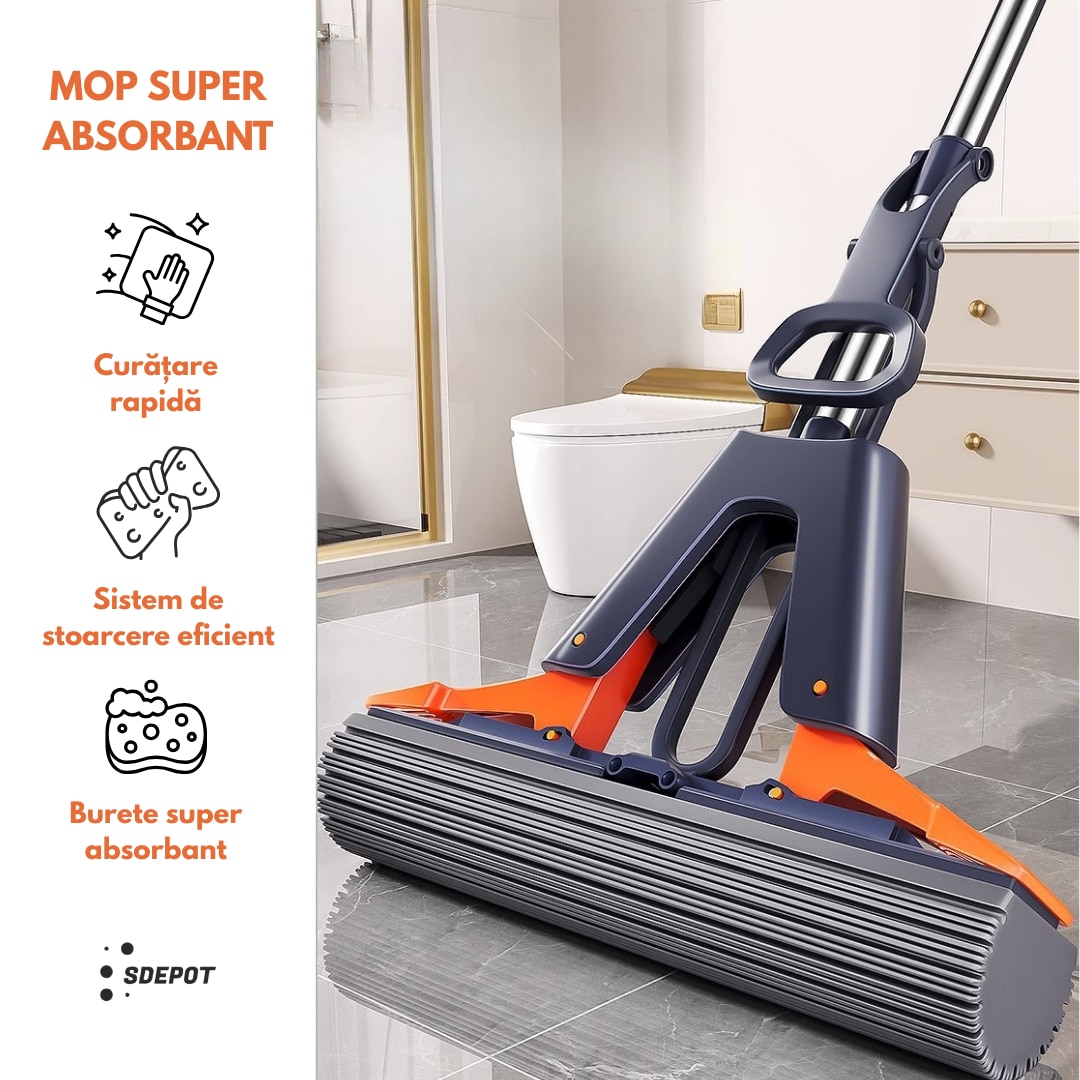 Mop cu sistem de stoarcere SDEPOT®, burete super absorbant, perfect pentru diverse tipuri de suprafete, maner confortabil, usor de utilizat, gri