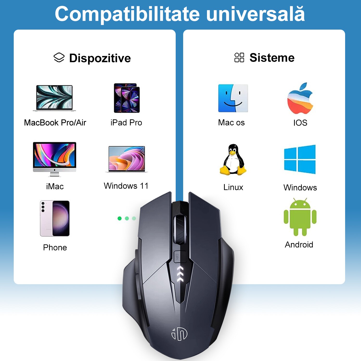Clic silentios (buton stanga si dreapta): mouse-ul laptop cu clic silentios pentru butonul din stanga si din dreapta se potriveste circumstantelor pentru utilizarea mouse-ului in public, cum ar fi biblioteca, dormitor, birou si asa mai departe, si in afara de indicatia luminii albastre in timpul reincarcarii si stingerea luminii dupa reincarcare completa, acest design rezulta fara griji pentru a deranja pe altii