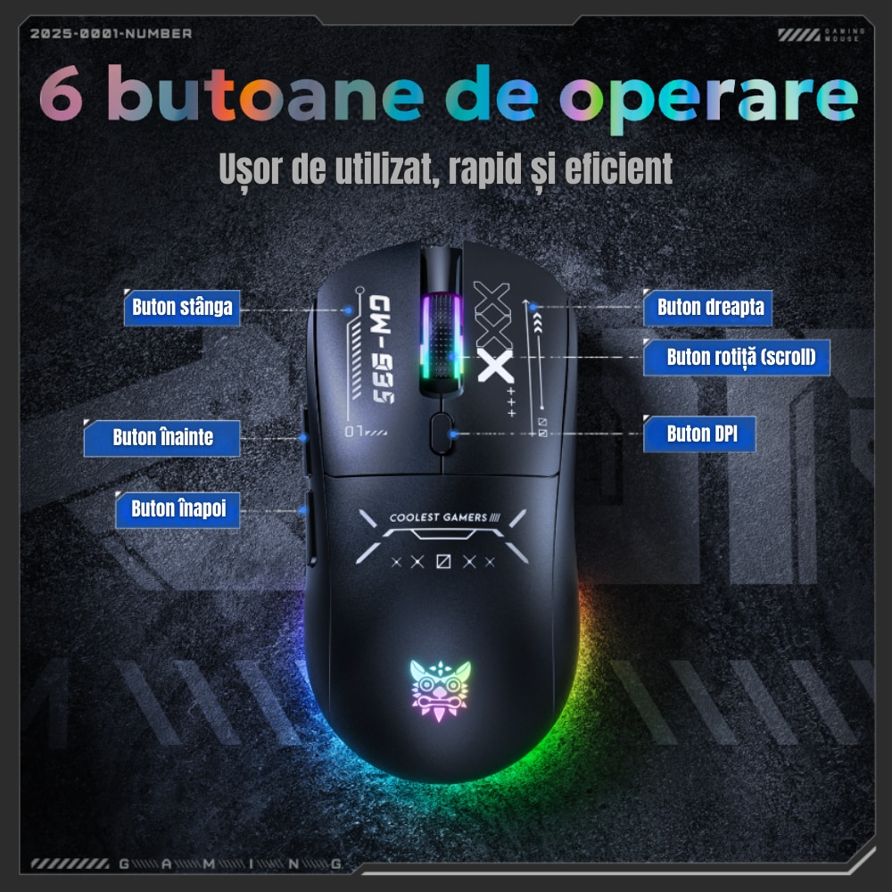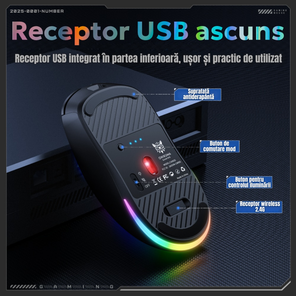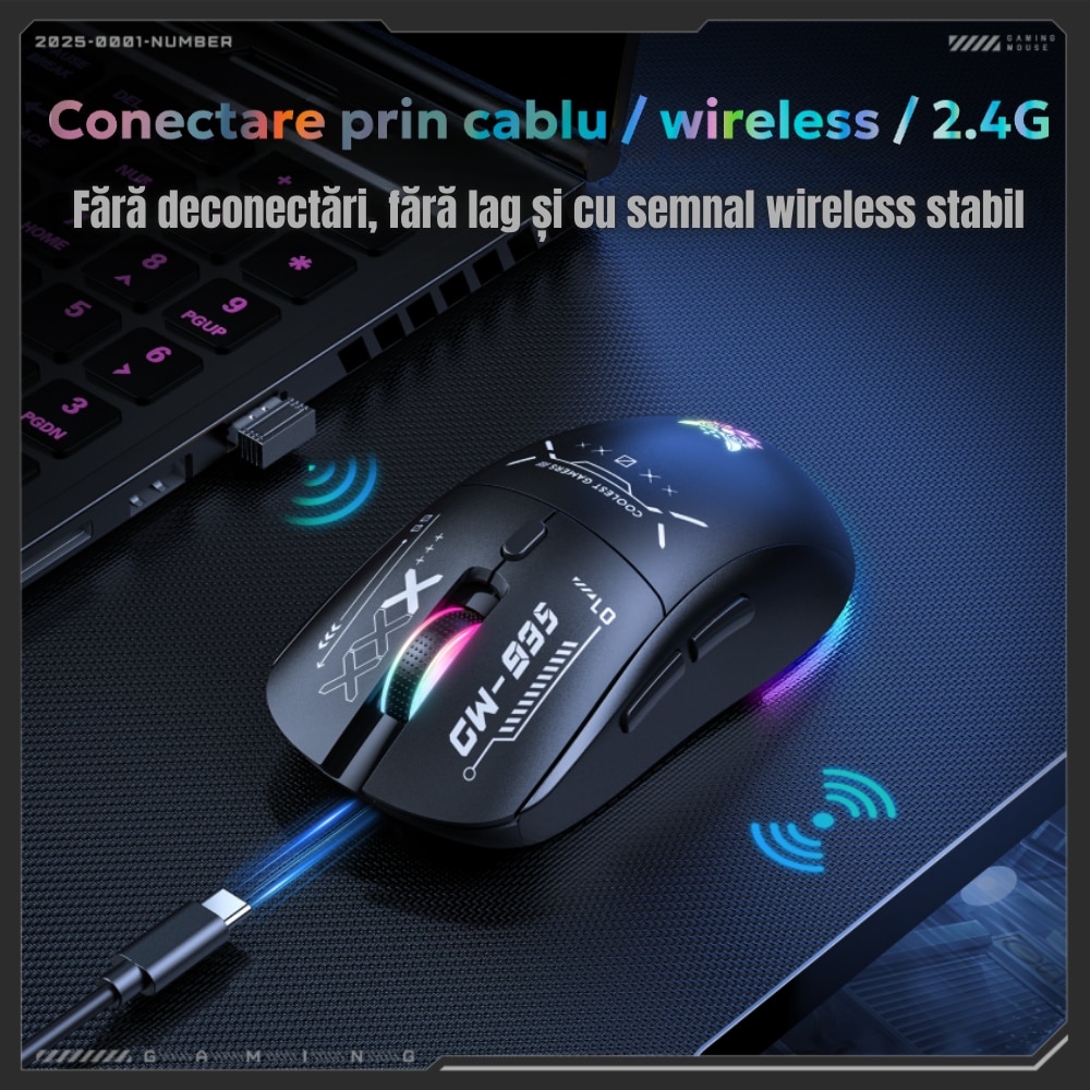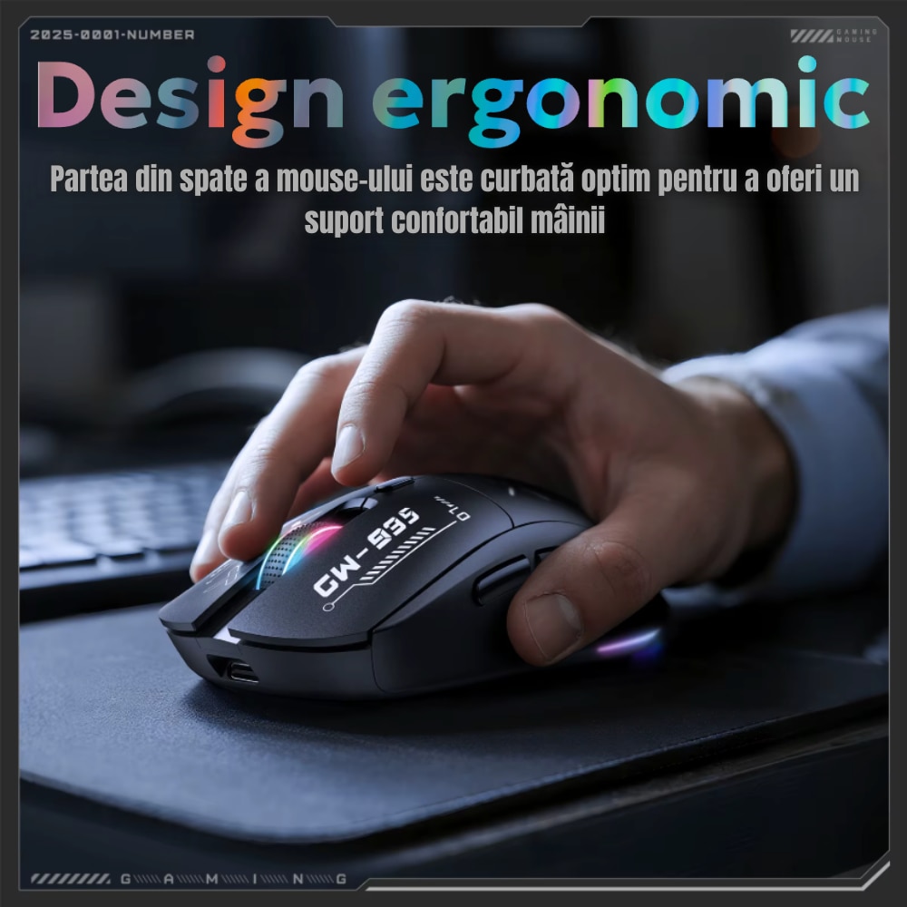 | Altele | 2.4 GHz Wireless Bluetooth Design ergonomic Plug & Play Ergonomic Gaming DPI ajustabil Iluminare RGB Raza de actiune 10 m |