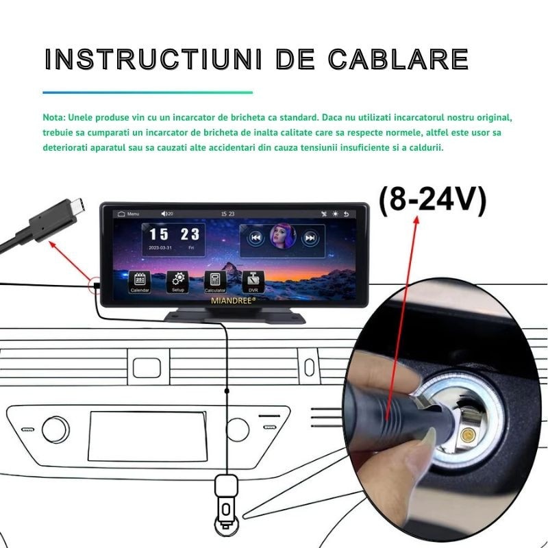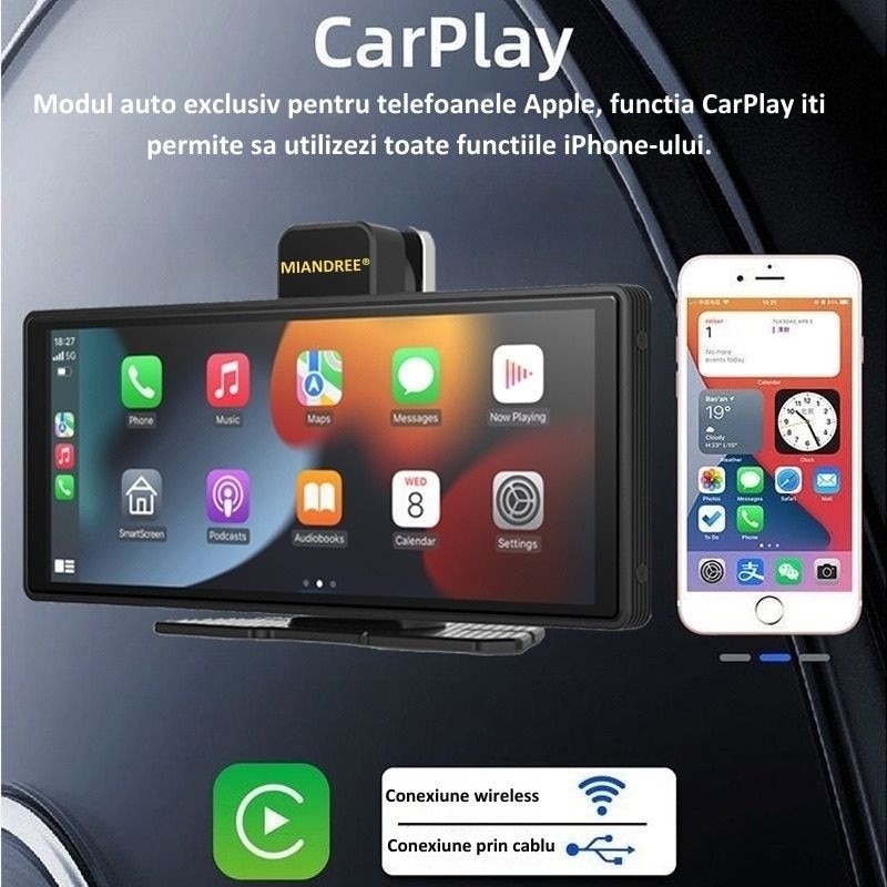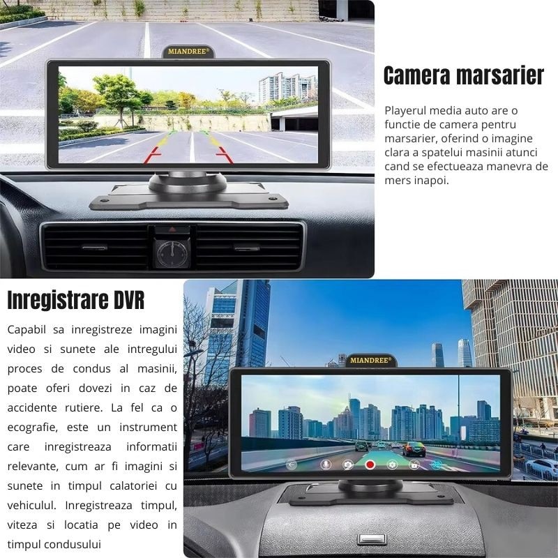 Navigatie Auto Universala 10.26" Full-Touch IPS HD, MIANDREE®, CarPlay/Android Auto Wireless, Camera Fata Reglabila 4K/1080P (Dashcam), Camera Marsarier Inclusa, Card 64GB CADOU, DVR Multimedia, BT, FM, AUX, Split-Screen