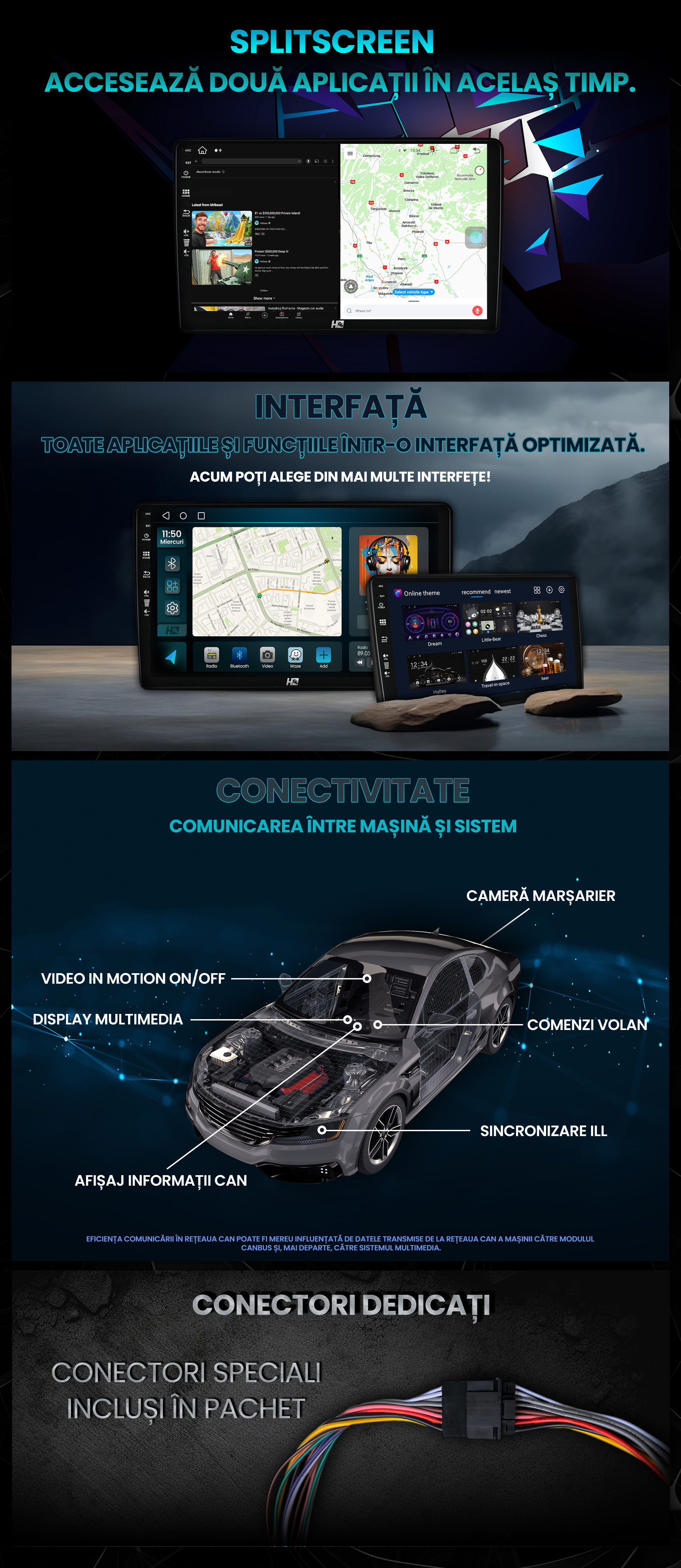 | Continut pachet | 1 x Antena GPS, 1 x Adaptor antena radio, 1 1x Cablu Conectare, 1 x Cablu camera marsarier, 1 x Cabluri RCA video si audio, 2 x Cablu USB |