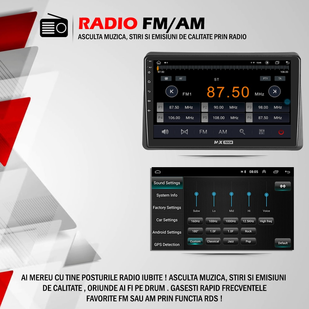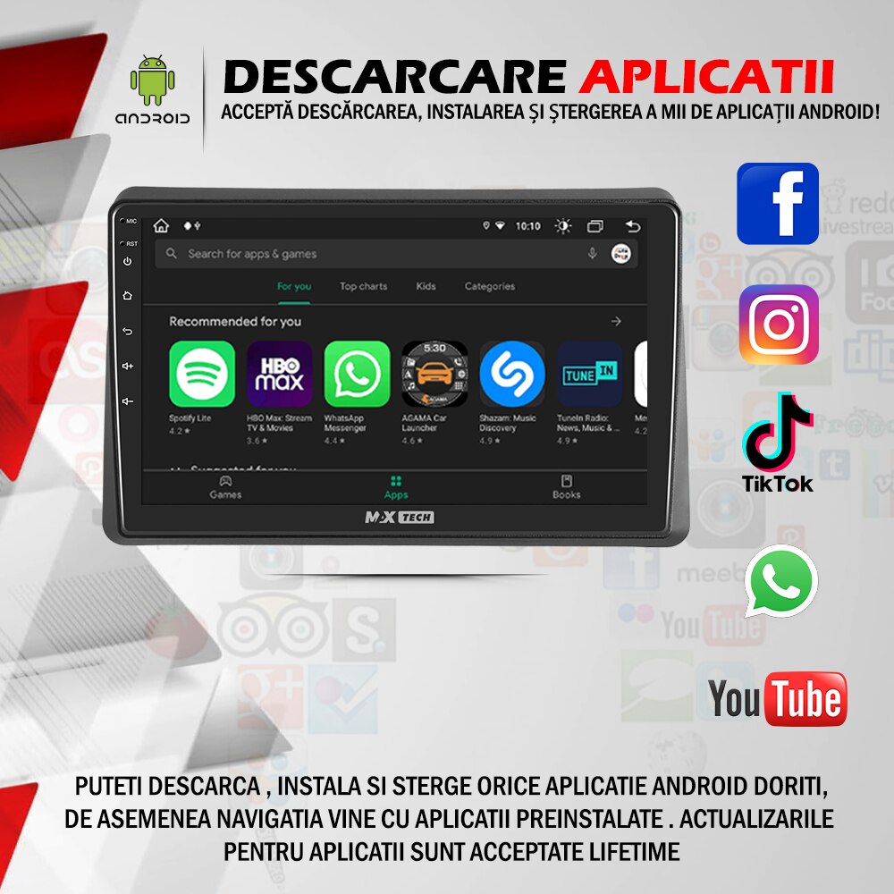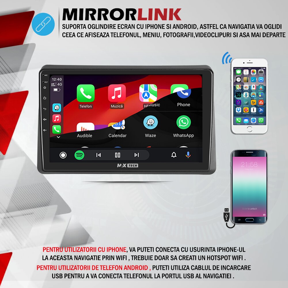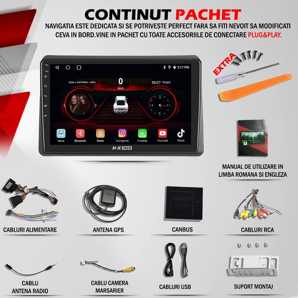 | Functii | GPS Bluetooth Touchscreen WiFi CarPlay Comenzi volan Aplicatii Google Play Radio AM/FM 3D Junction Views Camera marsarier DSP Android Auto Hi-Fi Speaker Link to all platforms CANBUS Oglindire ecran Meniu Limba Romana Airplay DVR - inregistrare in bucla |