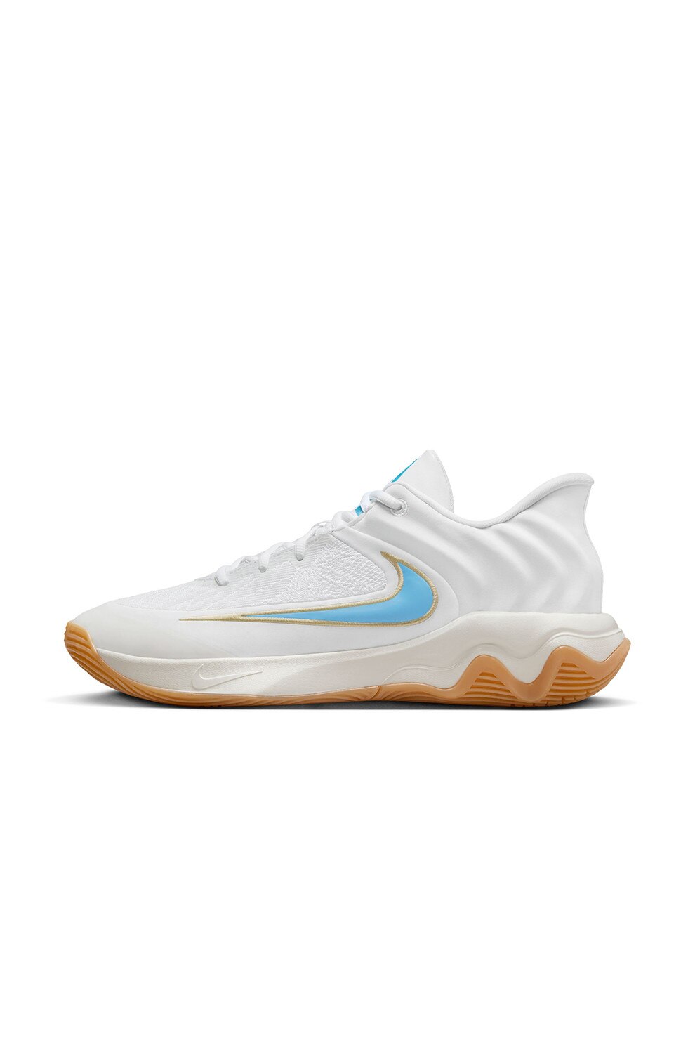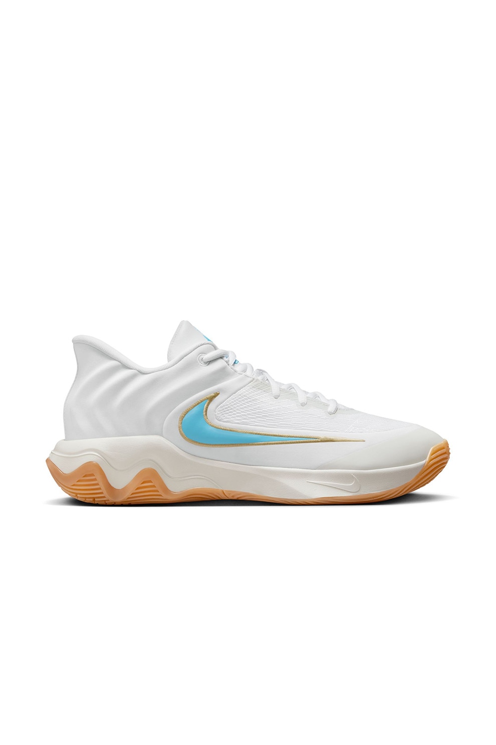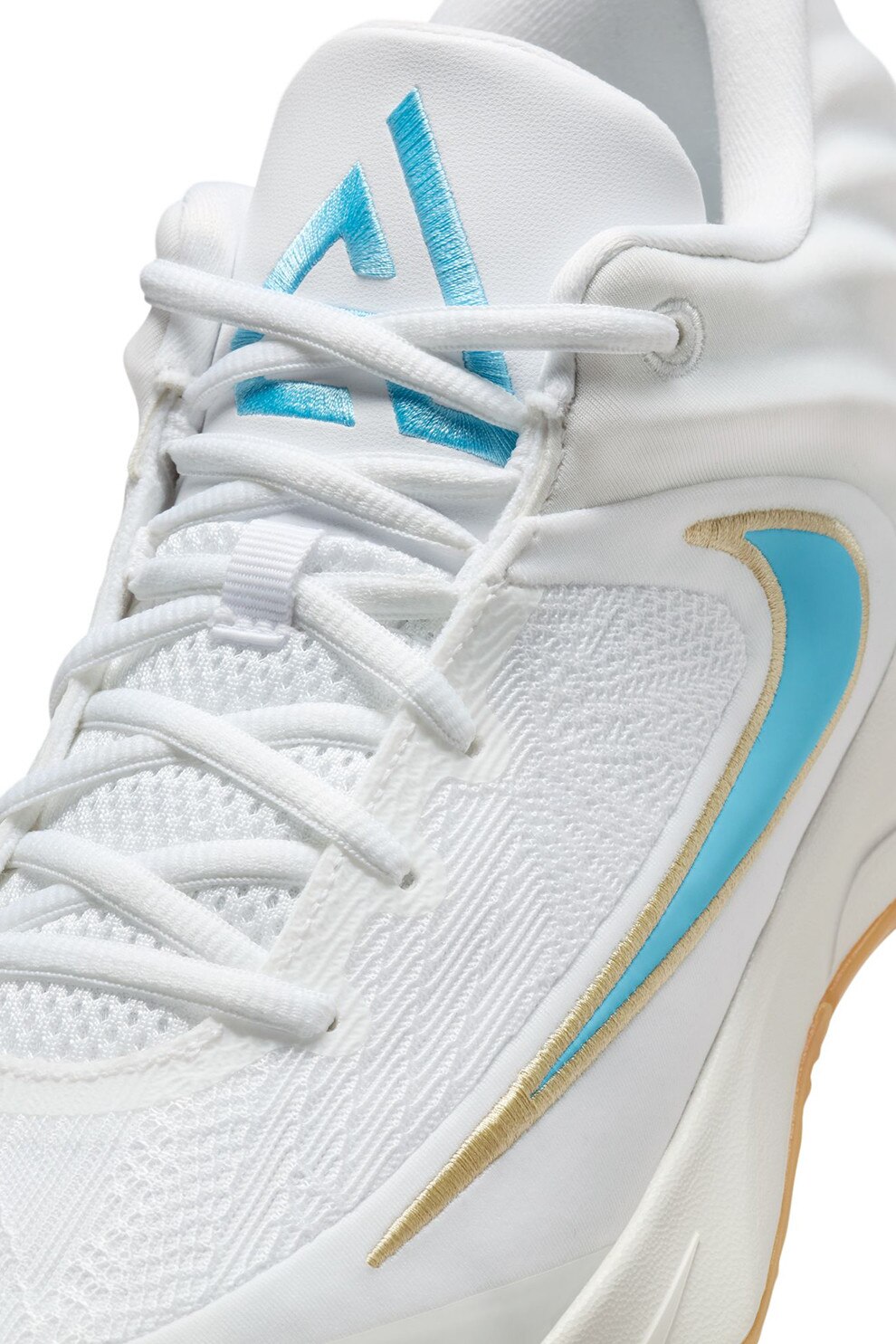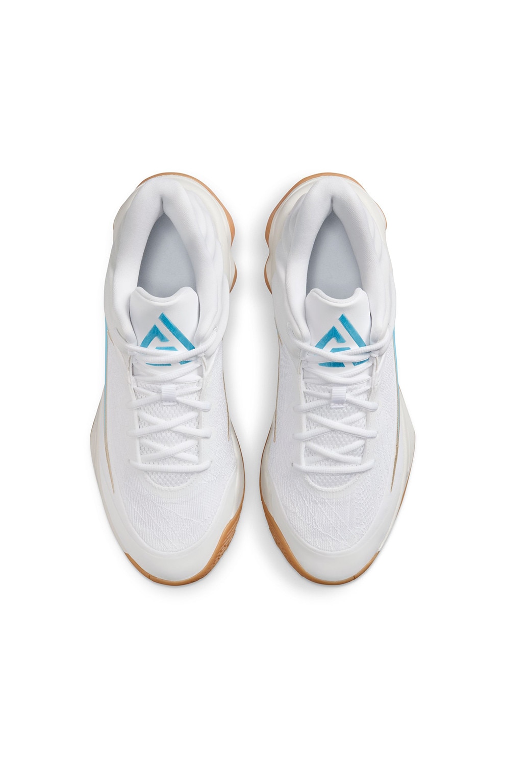 Nike - Pantofi Giannis Immortality 4 cu logo contrastant, pentru baschet, Alb/Albastru aquamarin