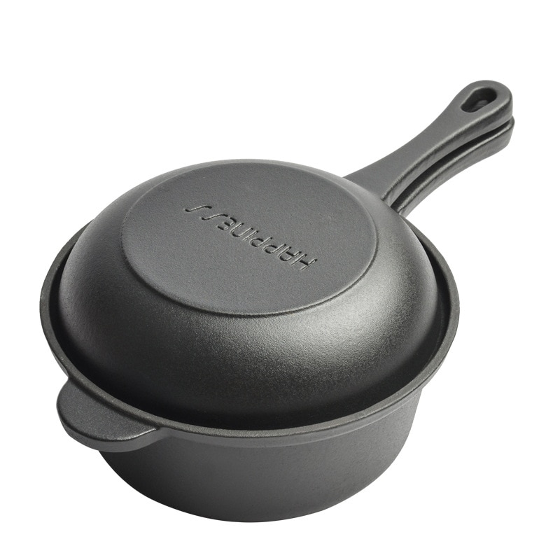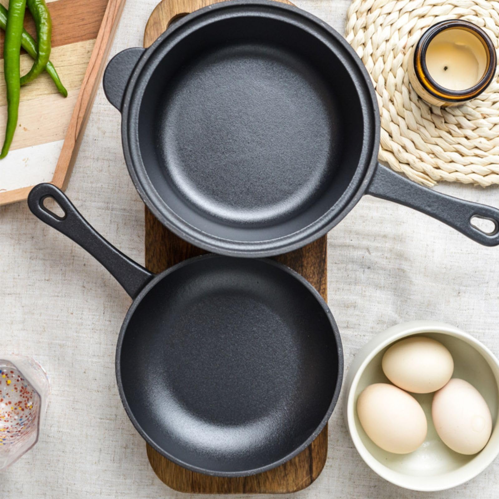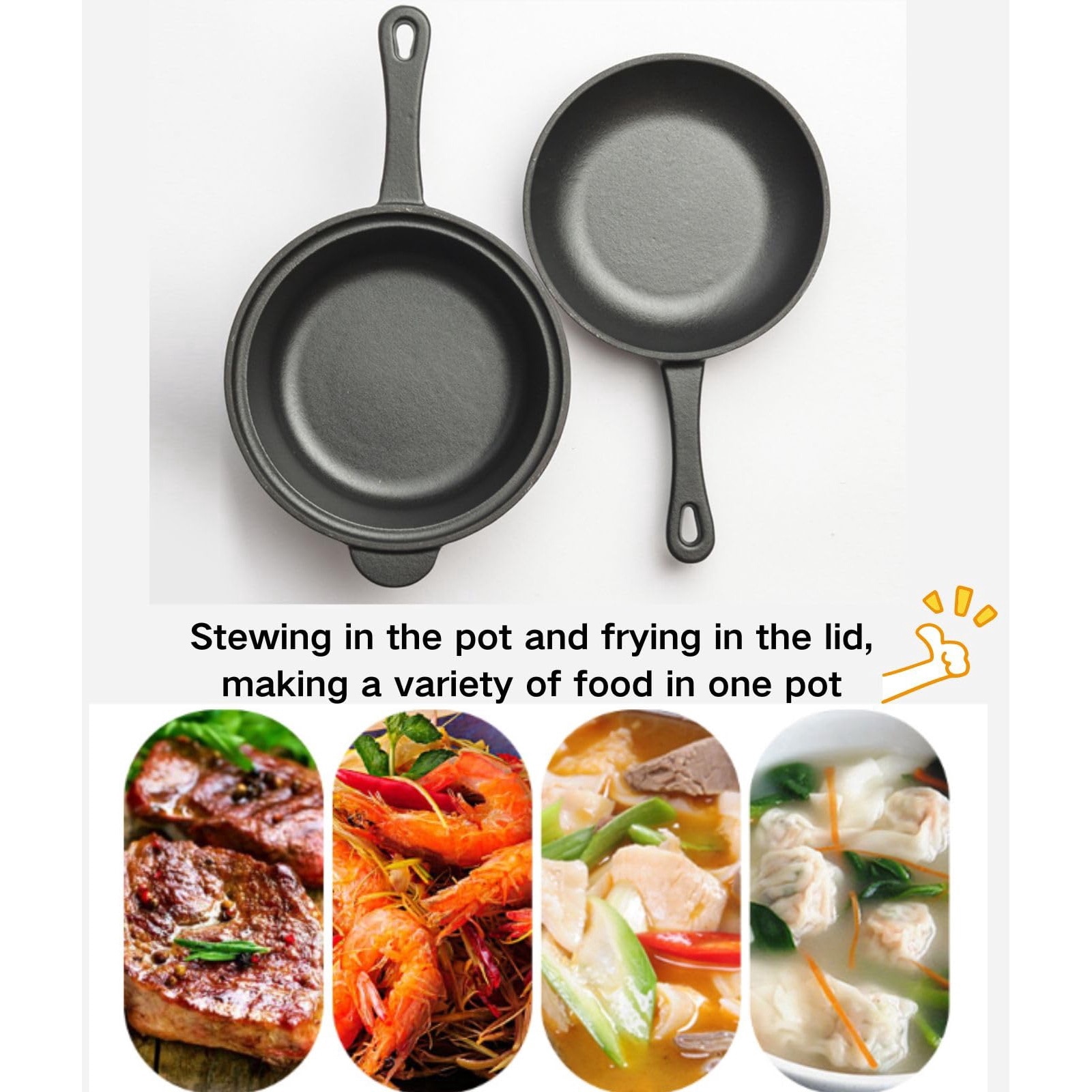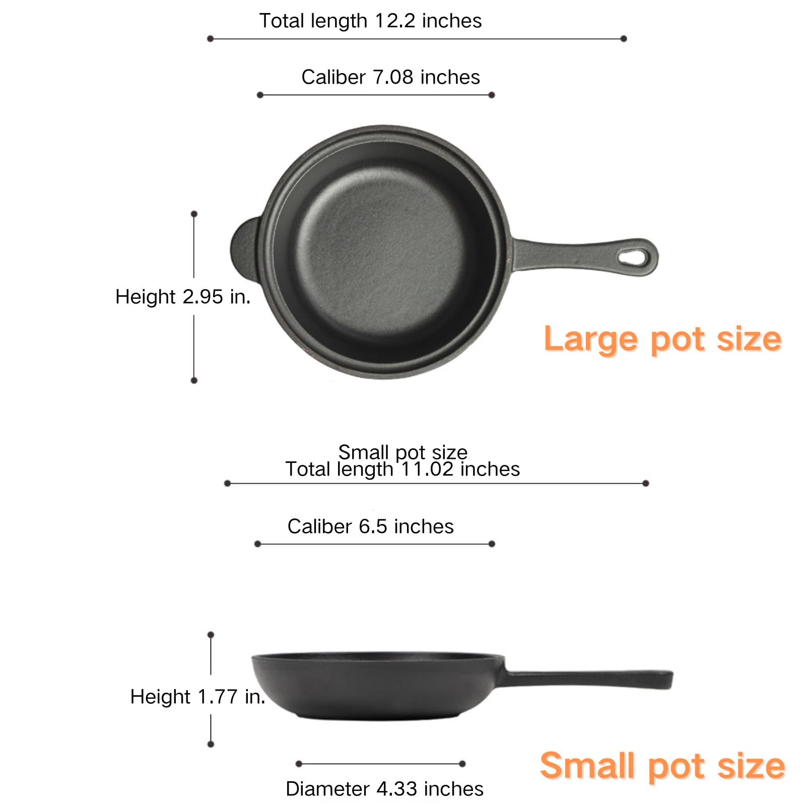 【Set 2 in 1:】Setul de tigaie din fonta contine 2 bucati, oala de jos poate fi folosita ca tigaie, iar cea de sus poate fi folosita pentru a praji ouale. Oala de sus poate fi folosita pentru o varietate de alimente, pastrand simplitatea originala si aroma proaspata a alimentelor.