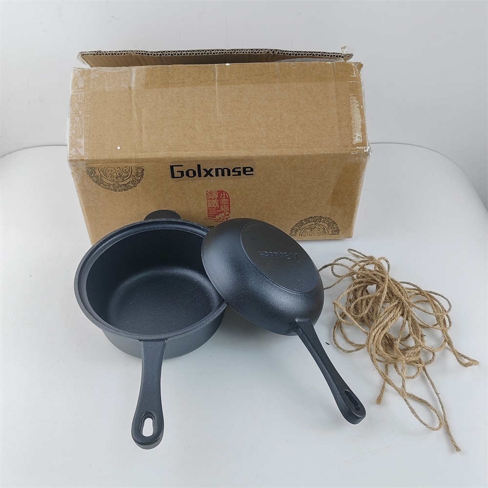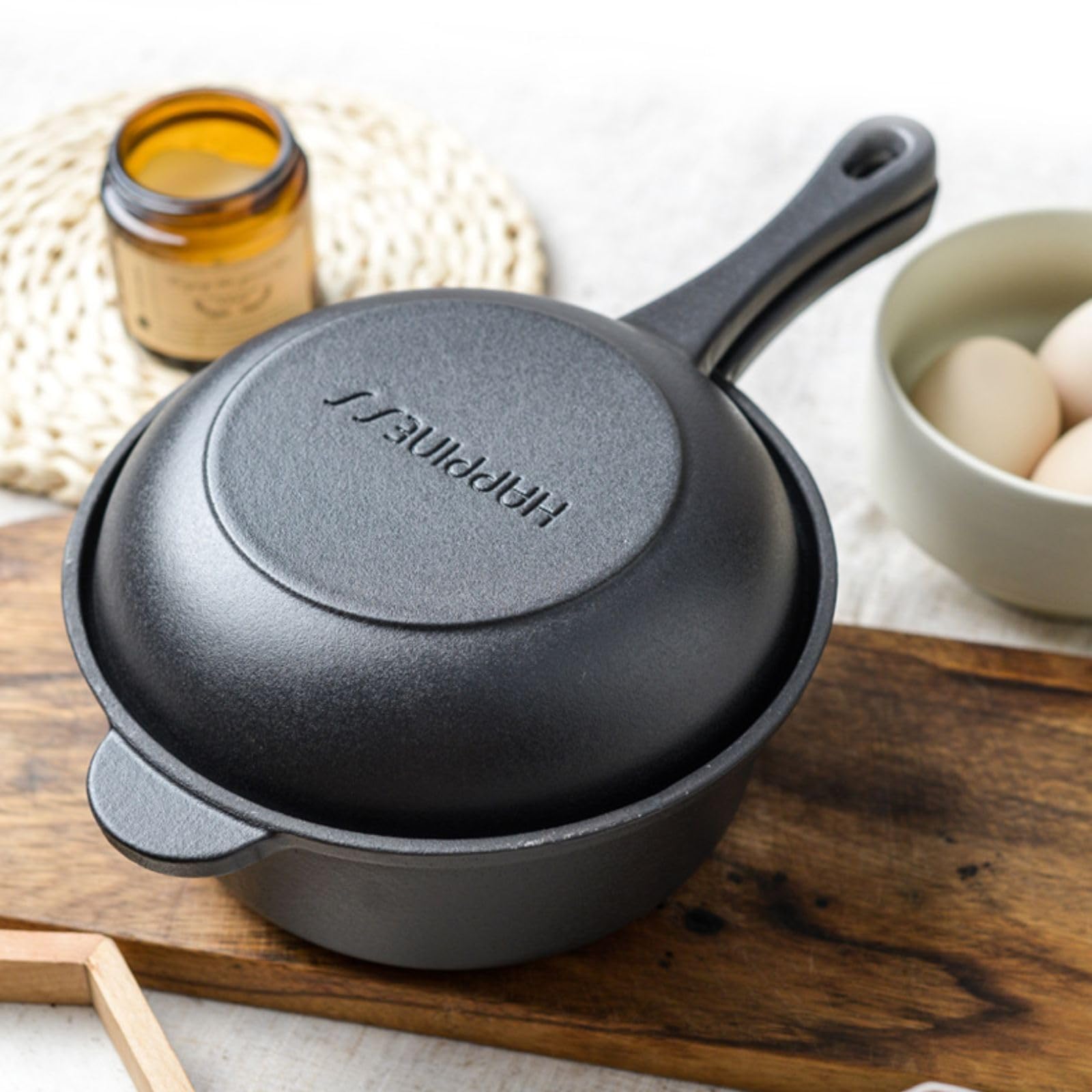 【Titlu:】Oala din fonta cu capac 2 in 1, Golxmse, tip cuptor olandez, 18 cm, tigaie 1L, suport termorezistent, fara ruginire, negru.