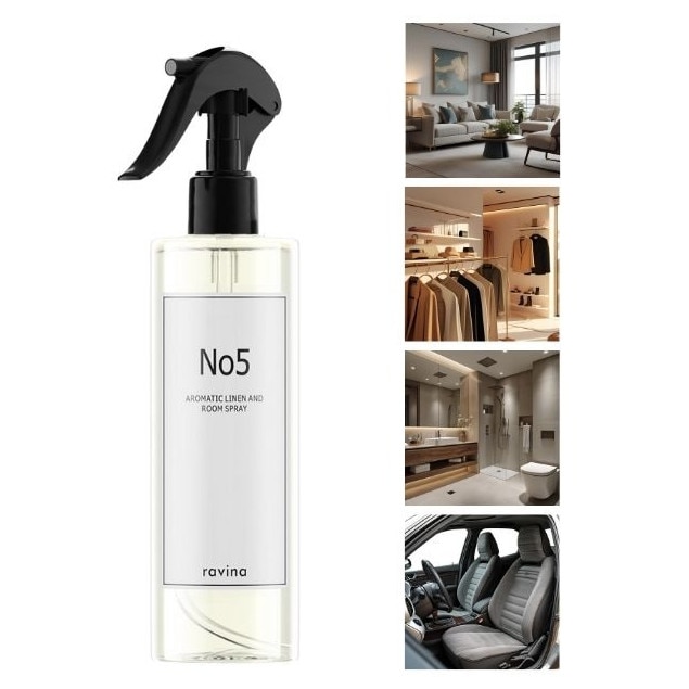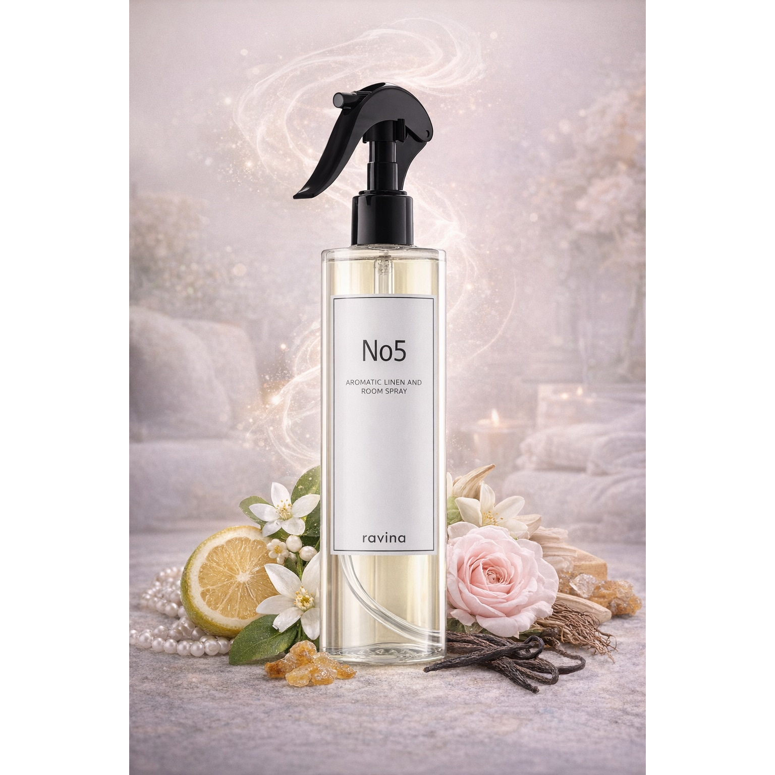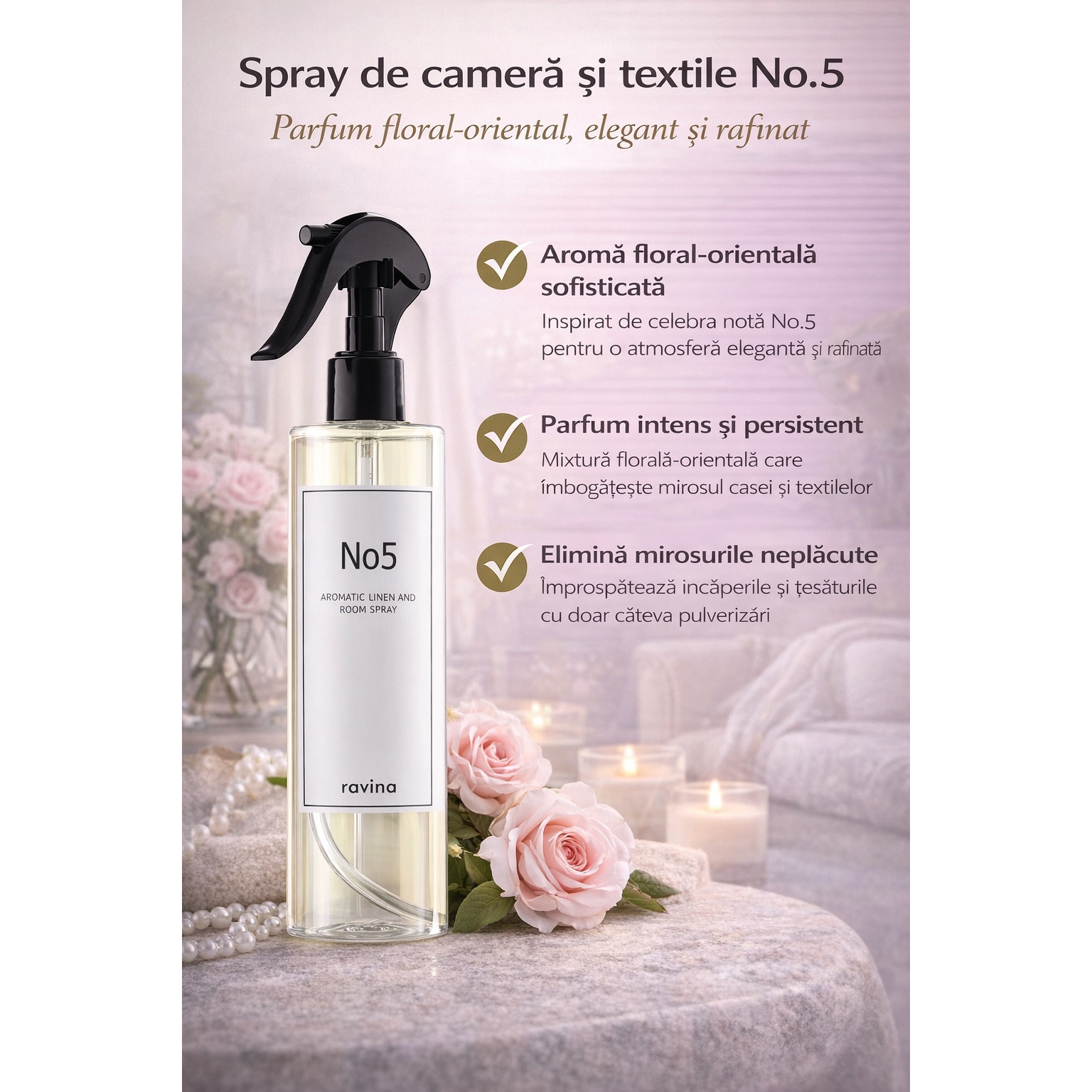 Odorizant interior premium cu miros persistent si intens, spray de camera si textile No.5, parfum ambiental floral-oriental inspirat de No.5, pentru casa, perdele si tapiterie, 200 ml
