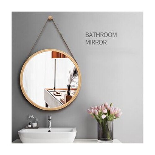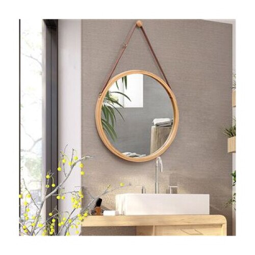 Oglinda de perete rotunda 45 cm, cadru din lemn de bambus, cu suport din piele, decorativa pentru baie sau dormitor