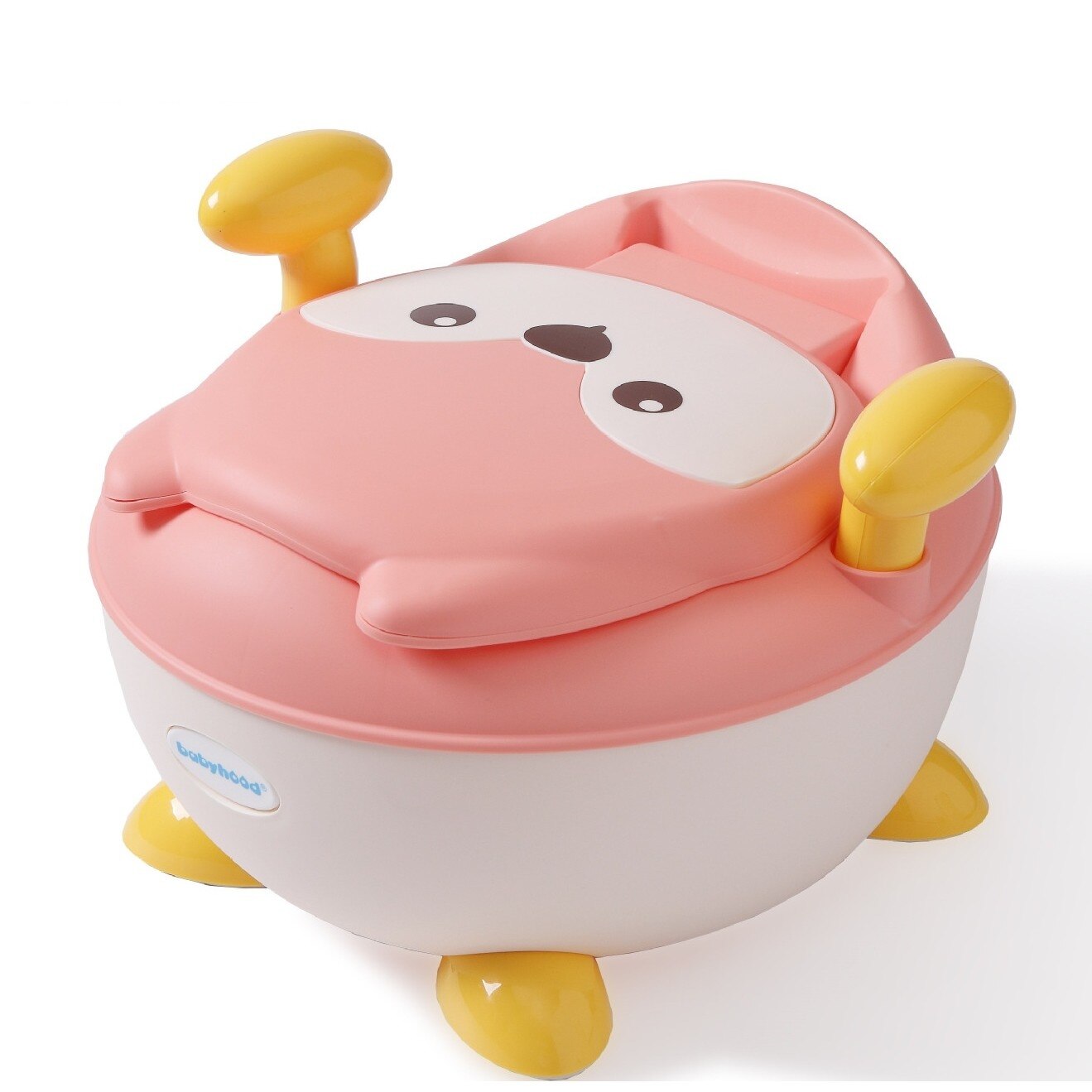 Olita pentru copii, +6 luni, compartiment detasabil, cu capac, antiderapanta, din plastic, colac moale, model animat vulpe, cu maner, 34.5x35x23 cm, roz/alb