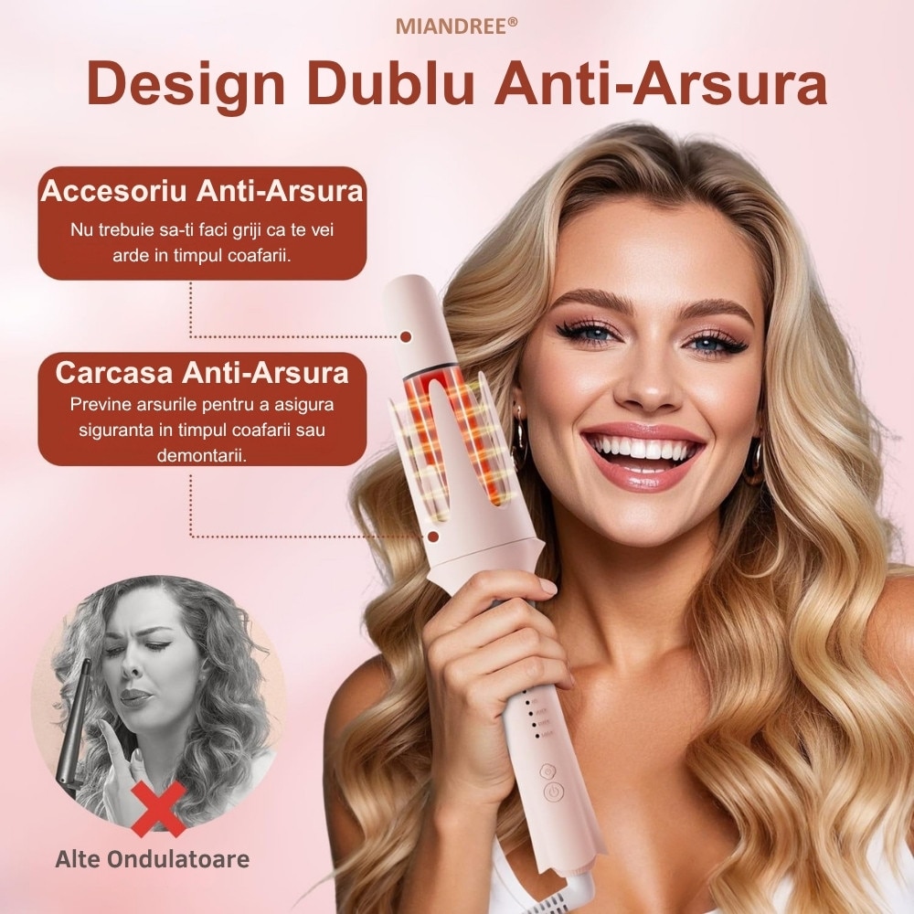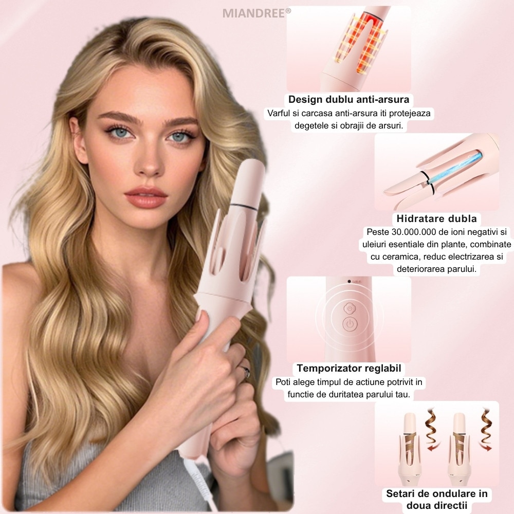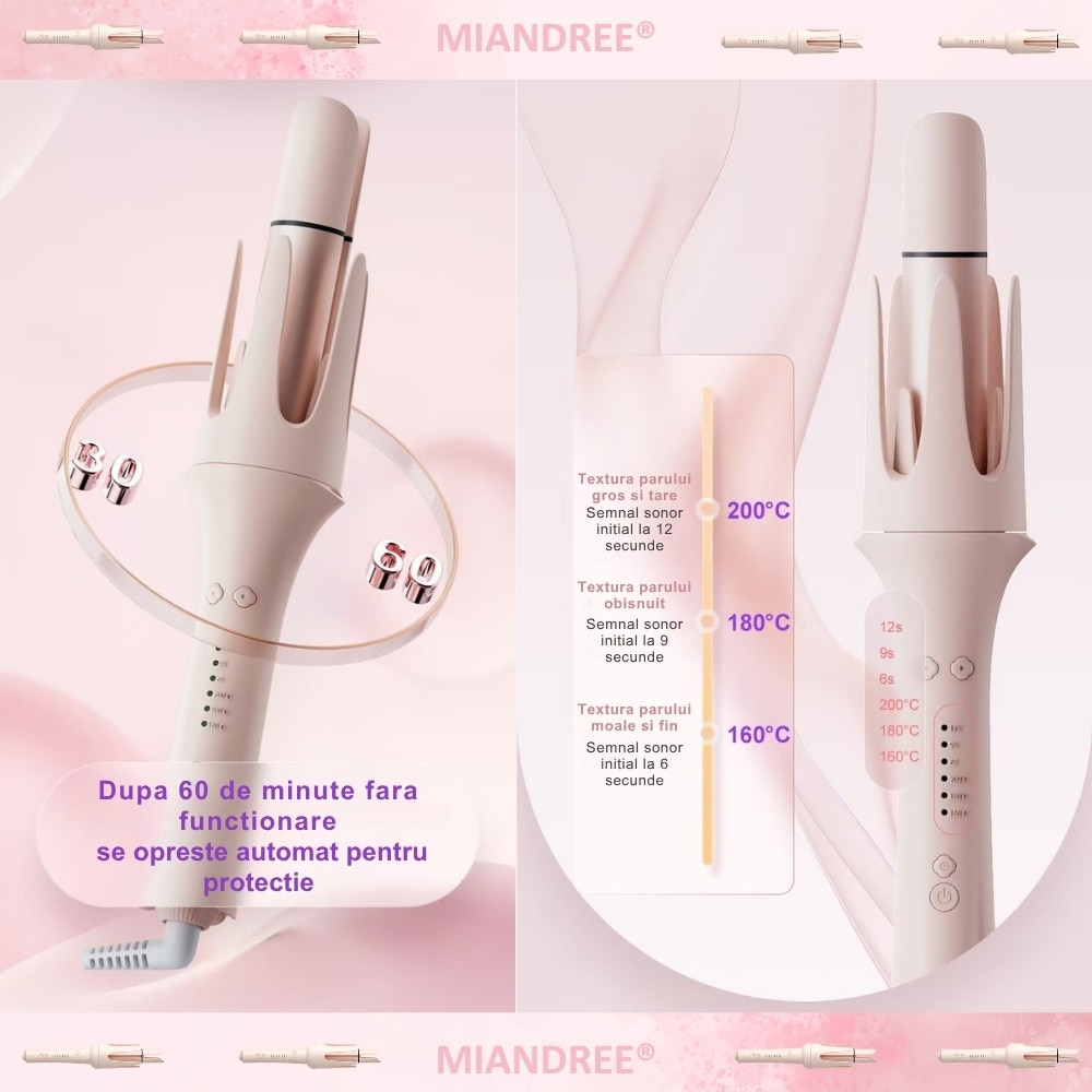 Ondulator Automat Bucle 7 IN 1, MIANDREE®, Invelis Turmalina Ceramica, Protectie Avansata, Potrivit pentru Par Lung si Scurt, 3 Setari de Temperatura, Directii Rotative, Roz, 3 Setari pentru Timer, Alimentare Cablu
