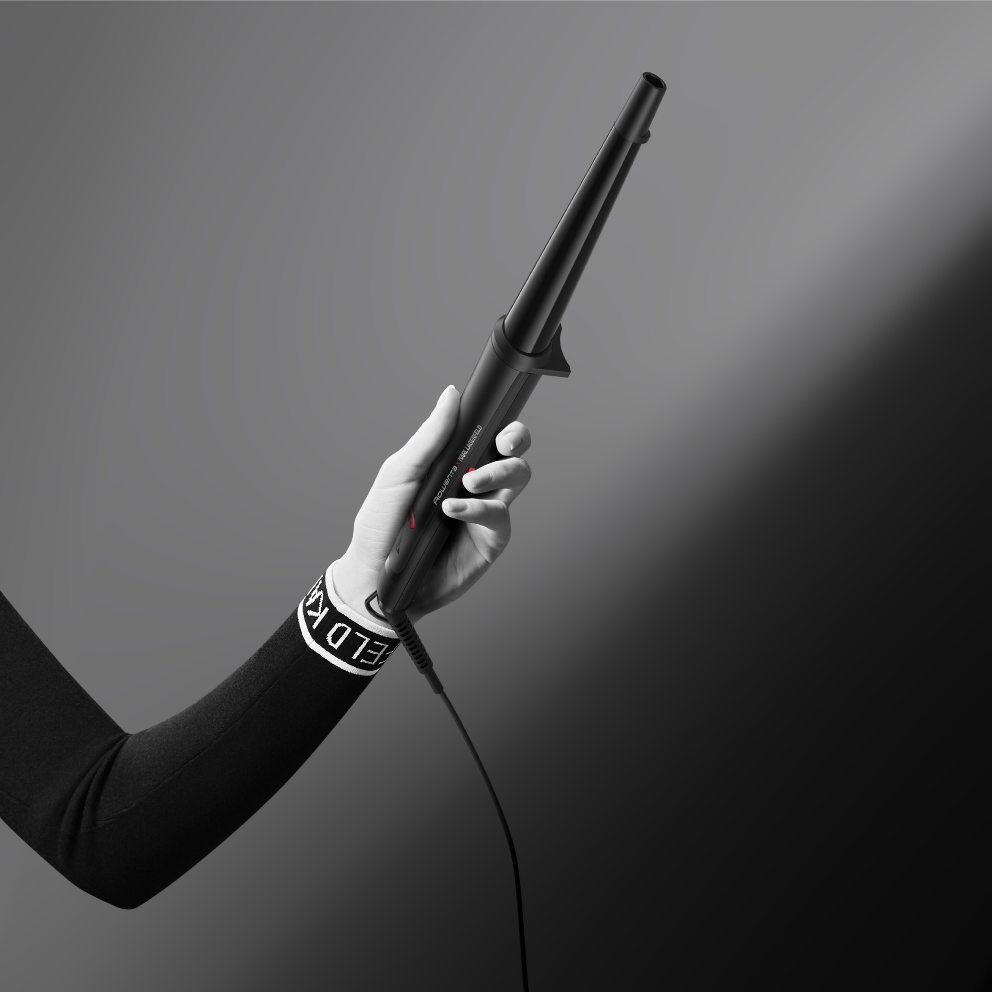 Ondulator conic Rowenta x Karl Lagerfeld CF324LF0, invelis Ceramic Tourmaline, varf rece, incalzire rapida, manusa de protectie, cablu 1.8m. Negru&rosu