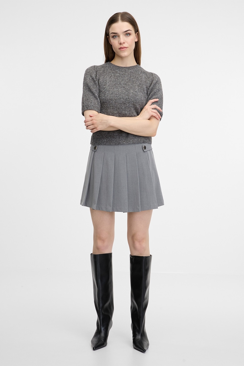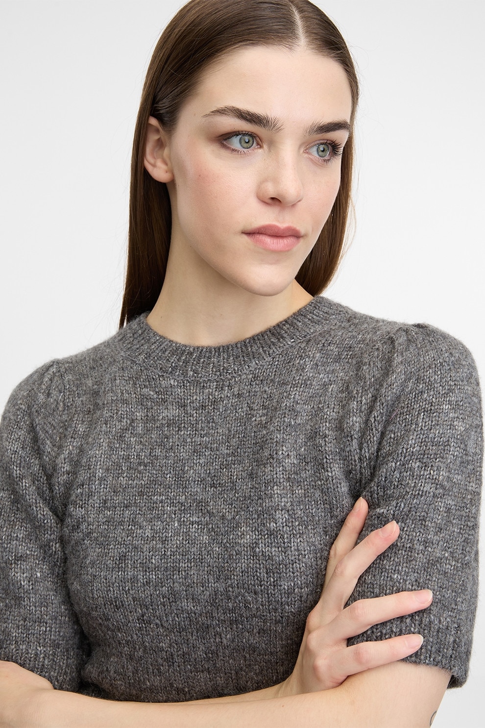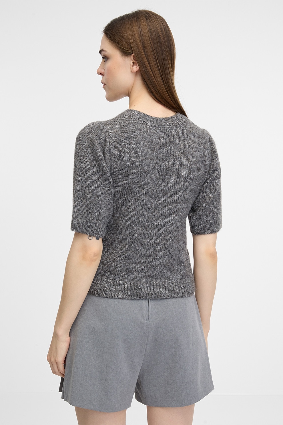 Orsay, Pulover cu maneci scurte si decolteu la baza gatului, Gri melange, L