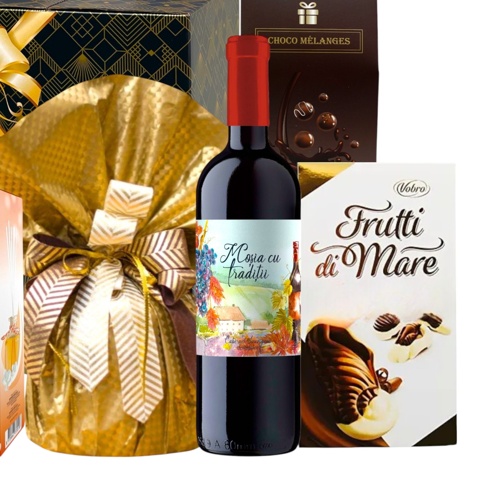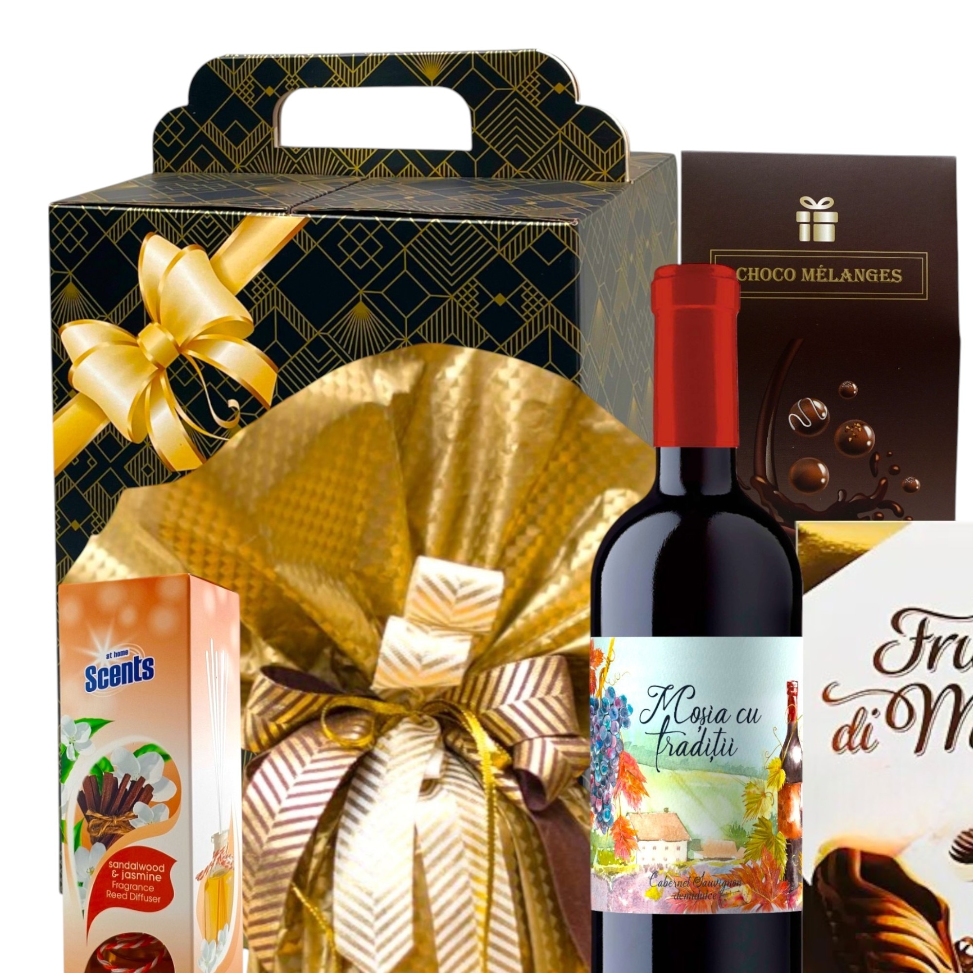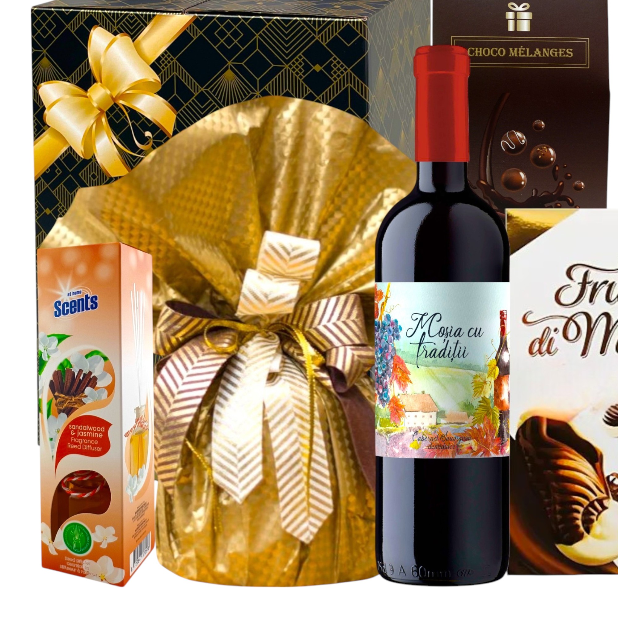 Pachet Cadou Armonia by CADOURI RAFINATE® - Vin Rosu, Panettone Italian, Praline Frutti di Mare, Alune in Ciocolata Choco Melanges, Parfum de Camera, Cadou Craciun, Paste, Aniversare, Multumire