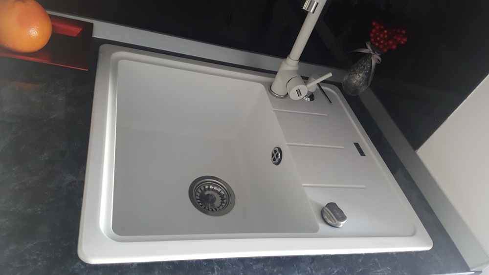 Pachet chiuveta fragranite Franke BFG 611-62 + Baterie Pola, cartus ceramic + Dozator Sapun, Alb