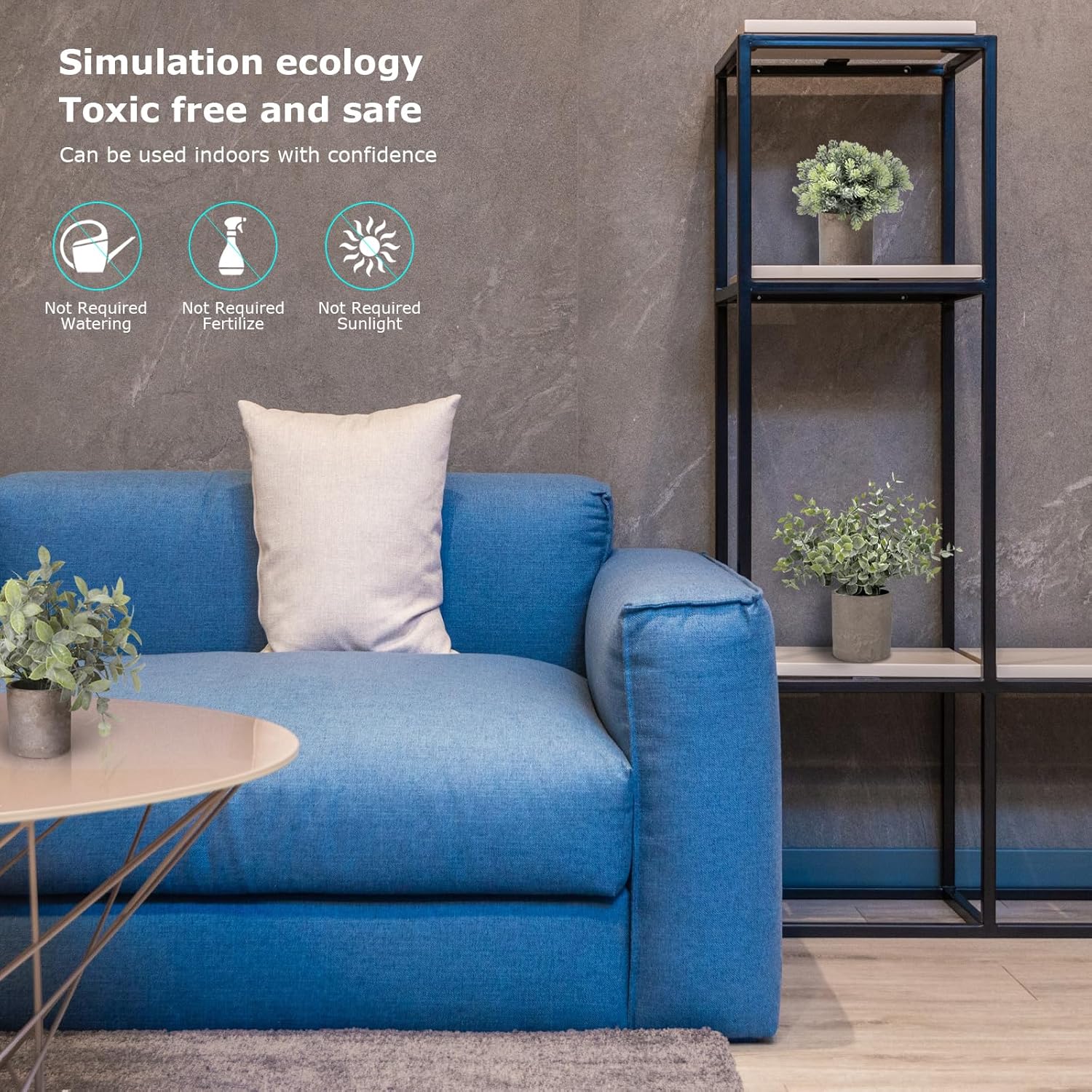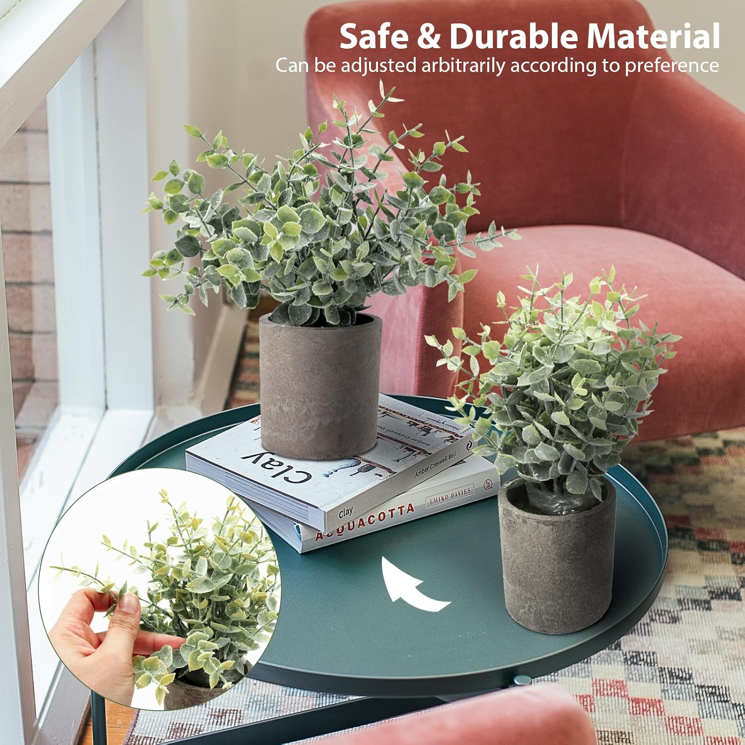 【Plante mici false】 Material sigur si durabil, frunzele de eucalipt ale plantelor false sunt fabricate din plastic ecologic. Culorile vii si frunzele realiste fac aceste plante false mai naturale si sa arate mai naturale. Dupa primirea plantelor false, este necesar sa reglati ramurile si trunchiurile plantelor de simulare la un unghi perfect pentru a obtine un aspect perfect.