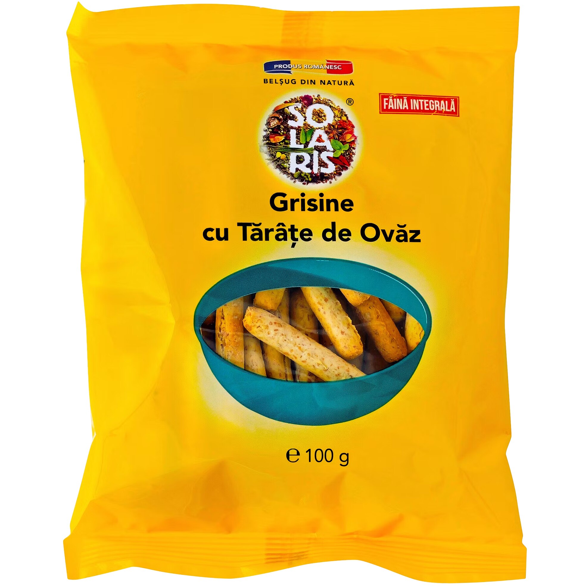 - Grisine cu tarate de ovaz: Faina integrala de grau, Tarate de ovaz (15%), Apa, Ulei de floarea-soarelui, Drojdie, Sare marina (fara adaos de iod).