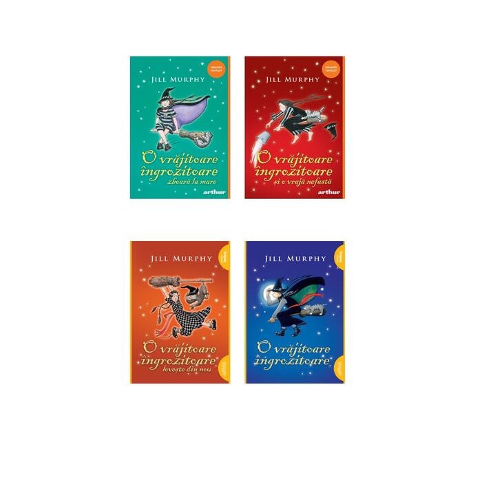 O serie despre aventurile vrajitoarei Mildred. Pachetul O vrajitoare ingrozitoare contine urmatoarele titluri: O vrajitoare ingrozitoare | paperback Mildred Hubble are cele mai nobile intentii. Vrea sa fie o eleva model, o prietena buna si, mai ales, o vrajitoare pe masura asteptarilor celor din jur. Dar cu toata straduinta si incercarile ei de a se tine departe de necazuri, Mildred intra in cele mai grozave incurcaturi. E drept, uneori nici sortii nu sunt de partea ei: colegele ii joaca feste vrajitoresti, pisoiul Dungulita nu se poate tine drept pe matura, nici vrajile nu-i ies tocmai bine. Ce mai! Mildred e cea mai ingrozitoare vrajitoare care a trecut vreodata pe la Academia de vrajitoare a doamnei Cackle. Doar cea mai buna prietena a ei, Maud, o mai poate scapa de exmatricularea care o ameninta. Sau poate o vraja miraculoasa? O vrajitoare ingrozitoare loveste din nou | paperback La Academia pentru vrajitoare a doamnei Cackle incepe un nou trimestru. Doamna Hardbroom, severa diriginta, le prezinta elevelor o noua colega, iar Mildred, mica vrajitoare neindemanatica, e desemnata sa aiba grija de ea si sa-i arate scoala. Numai ca Enid, fetita aparent ascultatoare, nu intarzie sa-i arate ce-i poate pielea. Cu cat mai aprig incearca Mildred sa se fereasca de necazuri, cu atat mai mult o incurca. Ce solutii sa gaseasca o vrajitoare ingrozitoare incat sa nu transforme zilele de scoala intr-un nou dezastru? O vrajitoare ingrozitoare si o vraja nefasta | paperback Vacanta de vara s-a terminat, iar Mildred se intoarce la Academia de Vrajitoare a doamnei Cackle. In cel de-al doilea ei an aici, si-a propus sa scape o data pentru totdeauna de eticheta de "cea mai ingrozitoare vrajitoare", dar nu e chiar atat de simplu... Mai mult, intra iar in conflict cu Ethel, o dusmana apriga, si aceasta arunca asupra ei o vraja nefasta. Ajunsa intr-un mare bucluc, Mildred incalca tot mai multe dintre regulile atat de dragi domnisoarei diriginte Hardbroom. Mai are o sansa, totusi: poate ca bunatatea si dorinta de a le fi alaturi celor aflati la ananghie o vor ajuta sa gaseasca o cale de iesire. O vrajitoare ingrozitoare zboara la mare | paperback Pe o furtuna de zapada cum nu s-a mai pomenit, elevele de la Academia de Vrajitoare a domnisoarei Cackle se intorc din nou la scoala. Cu toate ca vremea e mohorata, pe micutele vrajitoare le asteapta o surpriza: domnul Rowan-Webb, magicianul salvat din iazul scolii de Mildred Hubble, le-a invitat sa petreaca o saptamana la castelul sau de langa mare, in semn de recunostinta. Mildred, vrajitoarea cea neindemanatica pe care incurcaturile n-o ocolesc, nu e deloc incantata de aceasta excursie. I s-a dat alta pisica drept tovarasa, fiindca directoarea scolii a hotarat ca Dungulita, motanelul ei drag, mai mult o incurca la zbor. Asa ca l-a trimis la bucatarie, sa prinda soareci. Mildred e insa hotarata sa-l ia si pe Dungulita la castel. Oare ce idee nastrusnica ii va mai veni acum micutei vrajitoare?