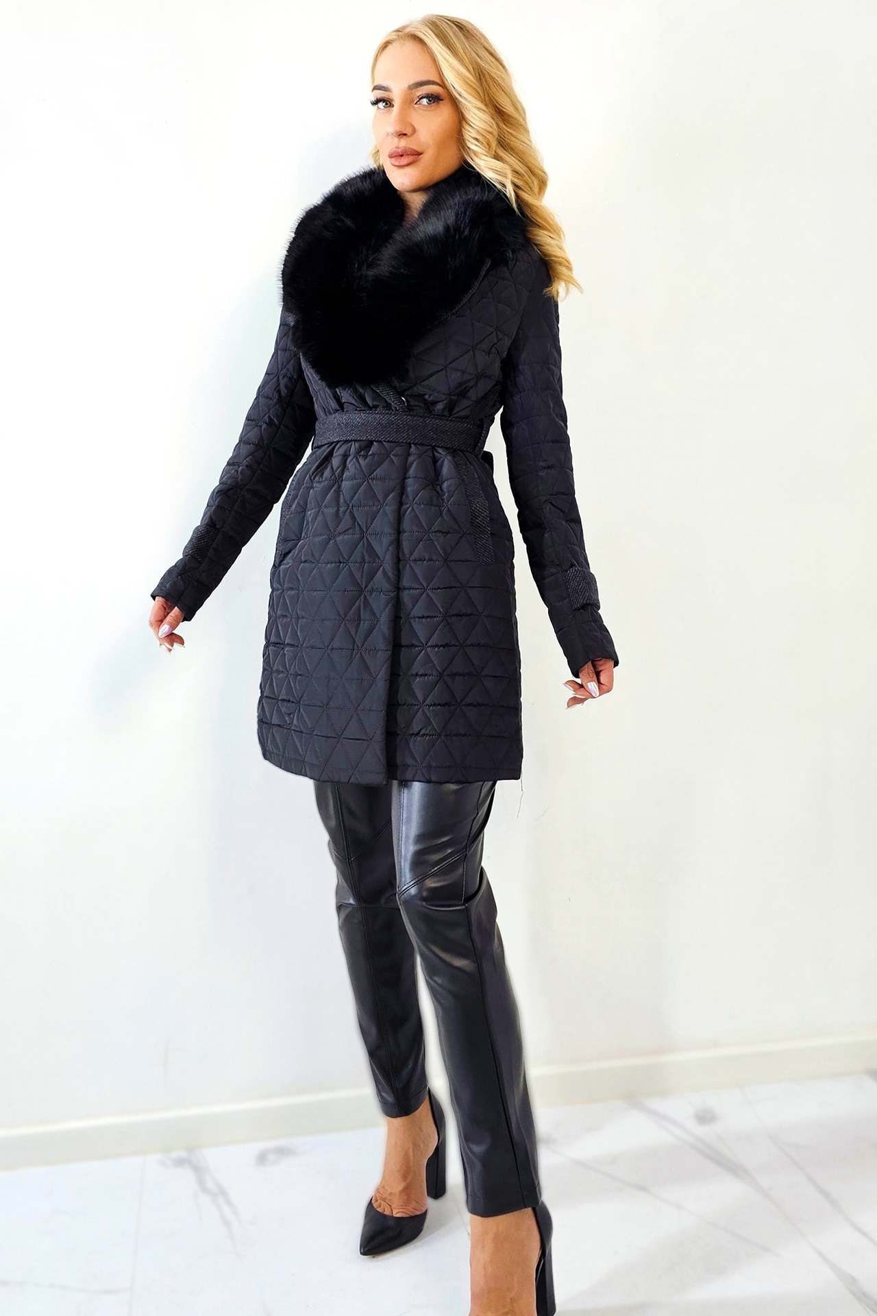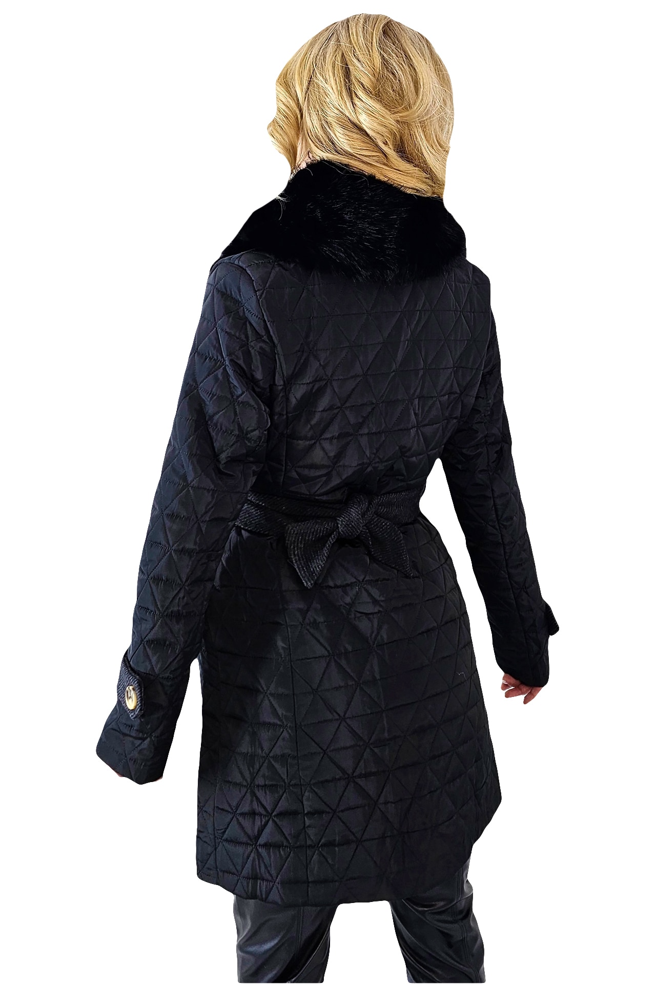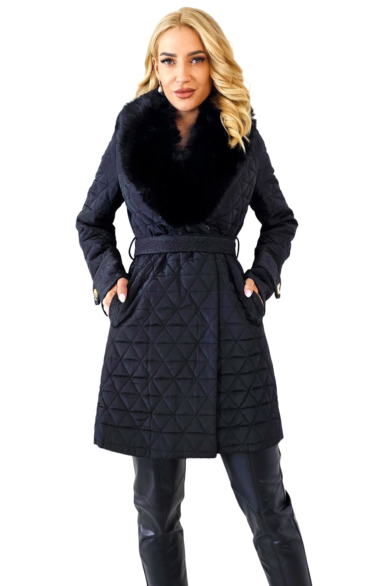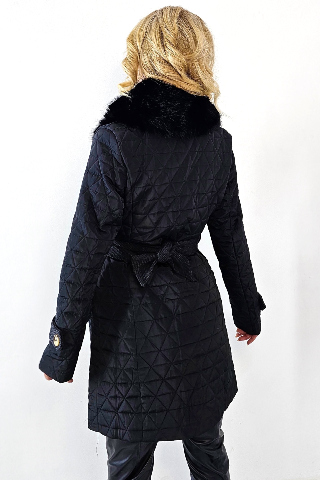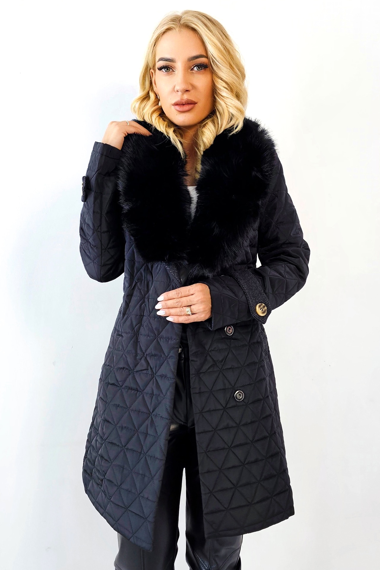 Palton matlasat de dama ILina, cu guler detasabil din blana ecologica, Negru