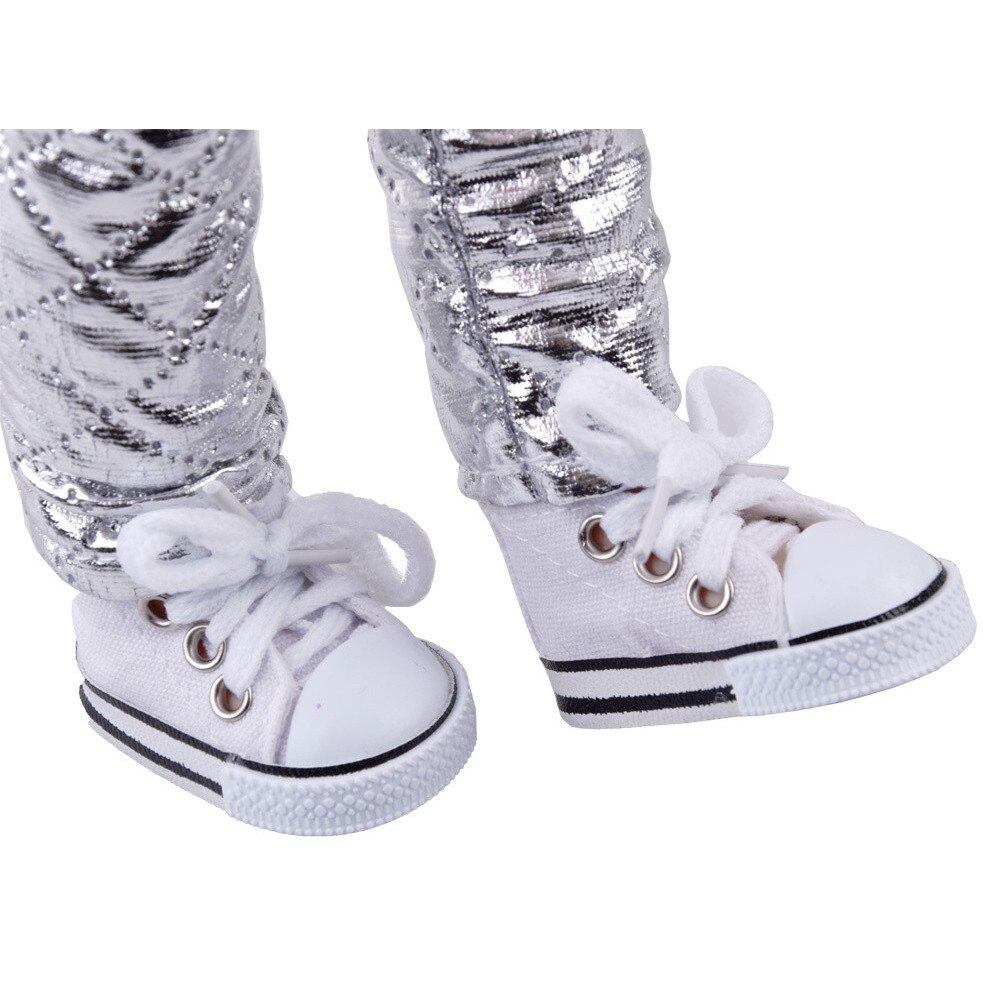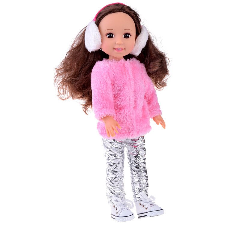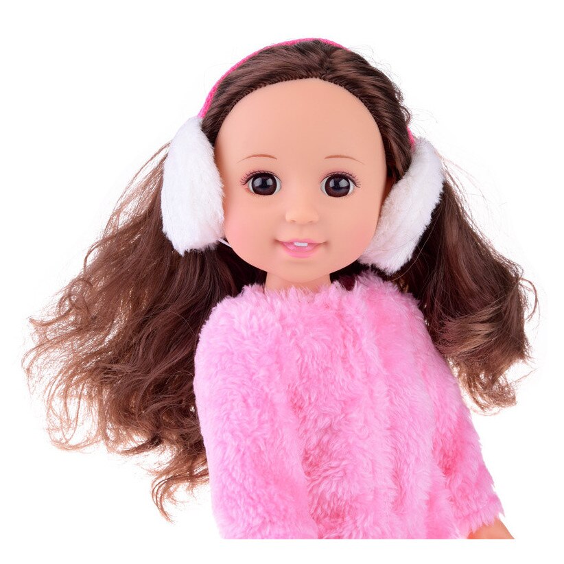 Papusica fashionista cu tinuta de iarna, parul lung saten si casti de urechi, inaltime 38 cm
