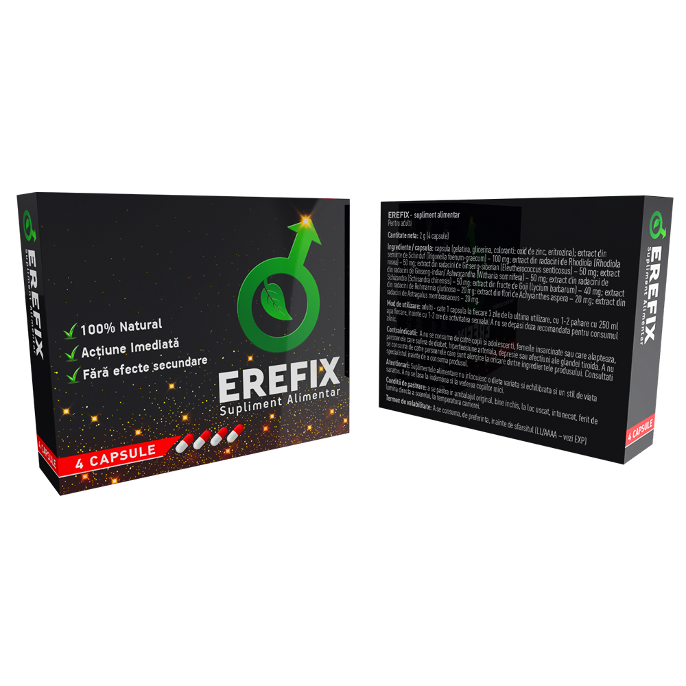 Capsulele EREFIX sunt recunoscute pentru beneficiile lor in ceea ce priveste functia erectila si satisfactia sexuala. Fiind un supliment pentru potenta, acesta reprezinta o alegere populara printre barbati, datorita formulei sale naturale si efectelor sale pozitive asupra performantei sexuale. Formula unica a EREFIX combina extracte naturale din plante precum Schinduf, Rhodiola si Ginseng-siberian, recunoscute pentru proprietatile lor benefice asupra sanatatii sexuale masculine. Astfel, acest supliment pentru erectie este destinat sa ofere un sprijin natural si sigur pentru cei care doresc sa isi imbunatateasca potenta si performanta sexuala.